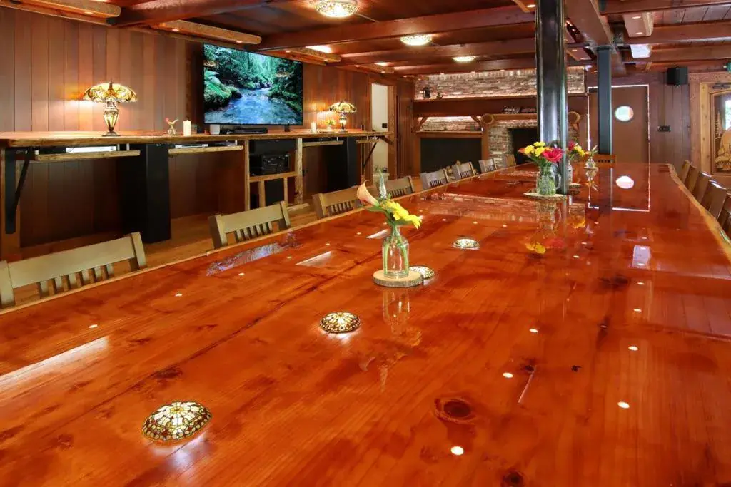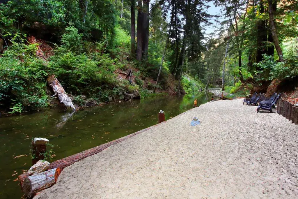 Take advantage of this opportunity to own this private 34-acre property with the ultra rare zoning of Private Campground. Perfect for a private retreat center or high-end family getaway. The Lodge is a spacious 4,413 sq ft main building featuring seven bedrooms, a large Grand room, a commercial kitchen, offices, & more. Additionally, there are eight cozy 192 sq ft half bath cabins equipped with electric fireplaces, kitchenettes, sofa beds, & loft beds for extra guests. Six dorm-style A-frames, totaling 768 sq ft, also provide additional accommodations. A highlight of the property is the Grand room, which showcases a stunning handcrafted redwood table. This artistic centerpiece seats 20 comfortably & can be lifted to the ceiling, offering a flexible space for various activities. Additional work spaces in the Grand room look out over the grounds. Nature lovers will appreciate the open-air amphitheater, a tranquil meadow, a network of winding trails, & majestic Redwoods. A flowing creek with a small dam and a private beach area add to the magic. The campground is equipped with high-speed internet, making it suitable for a family compound, a serene retreat center, or an off-site coding facility. Pricing now includes all four parcels.