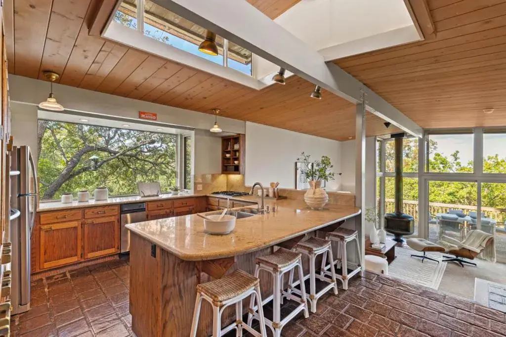 At the end of a peaceful, dead-end street, this warm, inviting, and exquisitely unique property delights and surprises with architectural details and magical surroundings that invoke a far-away lodge retreat which, somehow, is mere minutes from downtown Los Gatos. Stunning architectural details include vaulted plank-and-beam ceilings throughout the open-concept first floor with its great room with wet bar, open kitchen with wrap-around eating bar and clerestory windows, and a sunken family room centered around a wood stove and surrounded by windows and sliding doors with direct access to the expansive back deck nestled among the trees. A bedroom with a full bath and a laundry room completes the main floor. On the lower level, two additional bedrooms share a breathtaking full bathroom with a dual-sink vanity and a custom shower with an arched window overlooking the lower spa deck, plus direct deck access. This distinctive home will amaze and enchant you!