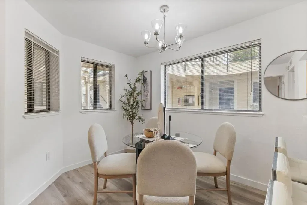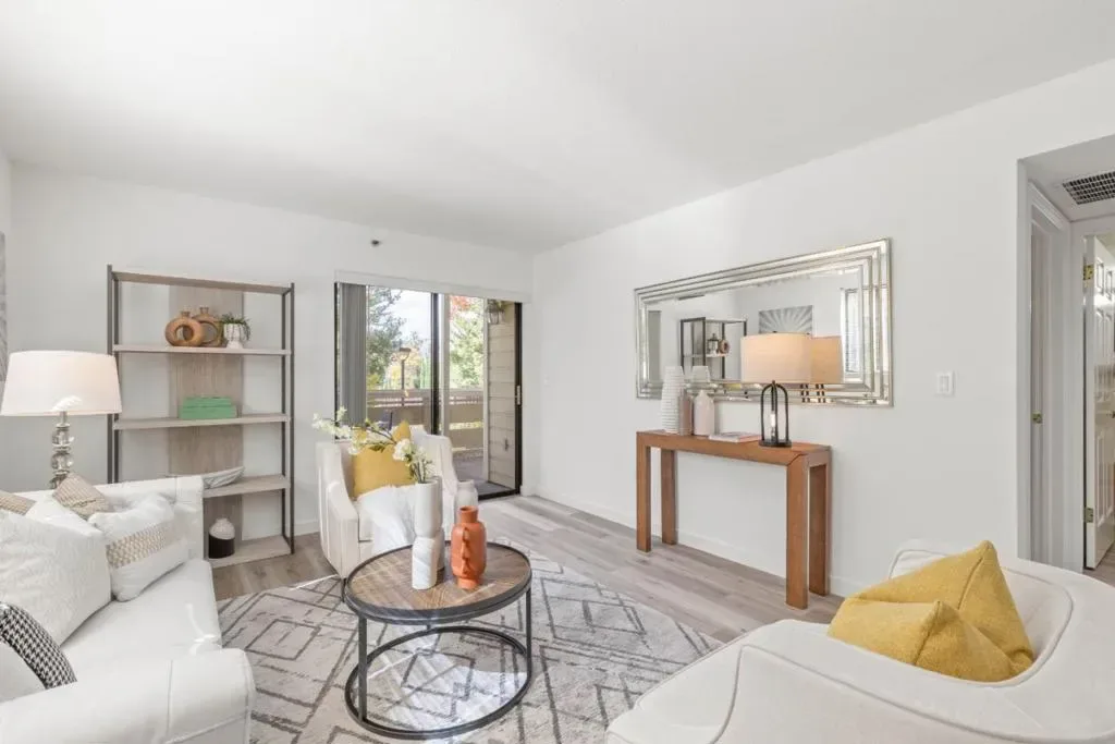 Convenient Los Gatos location! This first-floor end unit is light and bright with extra windows that bring in plenty of natural light. Featuring new flooring and fresh paint throughout, this two-bedroom, one-bathroom home is move-in ready. The functional dining area includes a breakfast bar that opens to the living space, creating a comfortable layout for everyday living. Enjoy the large private deck with views of the pool and beautiful redwood trees, offering a peaceful space to relax or entertain. Additional features include dual-pane windows, central forced-air heating and air conditioning, and an in-unit washer and dryer. The gated parking garage includes an assigned parking space conveniently located just below the unit. Community amenities include a pool and spa located just steps from the home, along with a BBQ area, community room with kitchen, fitness center, and an extra storage closet in the garage. Ideally located near dining and shopping in both Downtown Los Gatos and Downtown Campbell, with easy freeway access, nearby parks, and the scenic Los Gatos Creek Trail. This is a 55+ gated community where at least one occupant must be 55 or older, though buyers may be younger, an excellent opportunity to enjoy the best of Los Gatos living at exceptional value.