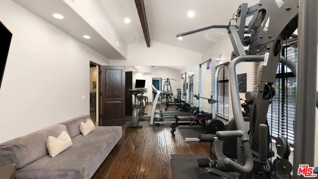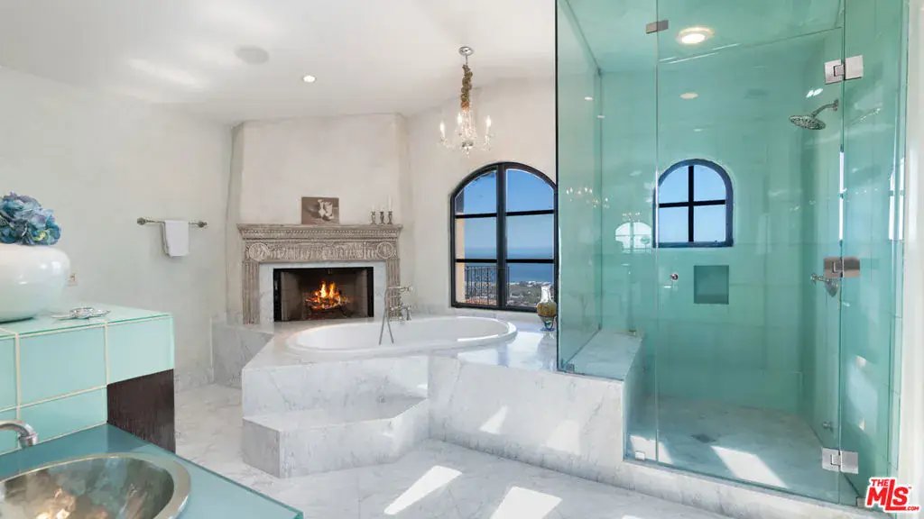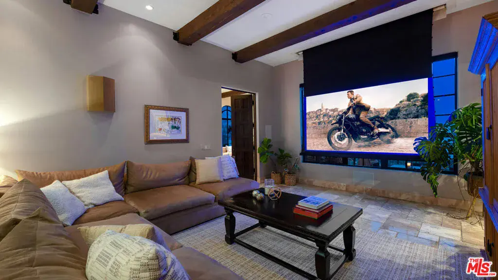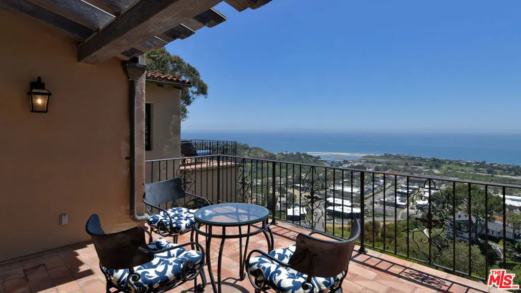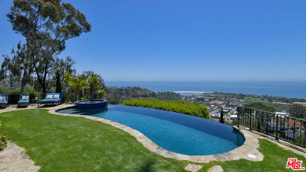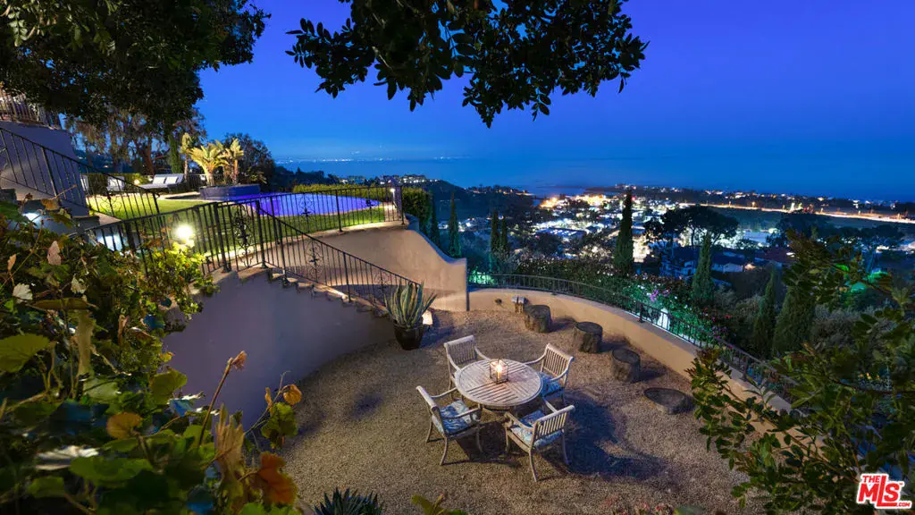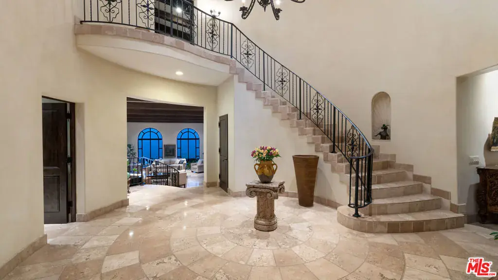 With sensational views, European styling, and amenities galore, this Italian-style villa combines classical design with up-to-the-minute features for year-round comfort and elegant entertaining. Situated behind gates on over an acre of gorgeous Mediterranean landscaping, the property’s highlights include a well-appointed guest house, theater, 3000-bottle wine cellar, infinity-edge pool, bocce court, and stunning straight-on views of Catalina and the ocean, plus the sparkling lights of the Queen’s Necklace.The carved, double front doors reveal a charming foyer that opens into a majestic entry hall with clerestory windows, a soaring, hand-painted domed ceiling, beautiful limestone flooring, and a stairway with a wrought-iron rail curving up to the second floor. Ahead is the step-down living room, awash in natural light. The room has extraordinary acoustics, ideal for music, with exposed beams, tall, arched windows with views from Palos Verdes to Point Dume, a massive stone fireplace, and double French doors opening to the entertainer’s ocean-view patio.The chef’s kitchen blends traditional styling with modern efficiency: beamed ceiling, herringbone-pattern reclaimed-tile floors, an island with bar seating topped with exquisite Brazilian Bahia stone, marble countertops, top-quality appliances, a hand-painted fresco, a built-in barbecue, and altar-wood trim from achurch in El Salvador. There is a spacious butler’s pantry with additional prep space, storage, and appliances, plus the laundry room adjoins the kitchen and has a door to the side yard.The kitchen opens out to include a large dining area with arched French doors to the ocean-view patio and a formal dining room occupies a round tower with chandelier ceiling, stained-glass window, and curved walls with windows overlooking the pool and ocean views. Off the living room is a theater/family room with a retractable screen, blackout shades, and ocean views.A hall off the foyer leads to a classic bookcase-linedoffice/library with beamed ceilings, limestone floors, a large fireplace, and French doors to the front yard. Continuing along this hallway, the wine cellar / tasting room feels like it could have been imported from a European castle. An en-suite bedroom has a sitting area andocean views. Next door is a gym, also en-suite, with wood floors and a walk-in closet. At the end of the hallway is a circular family room, complete with beamed ceilings, wood floors, courtyard and mountain views, and a bathroom.The estate’s upper floor is home to the gorgeous primary suite, with tall, beamed ceilings, antique reclaimed hardwood floors, a huge stone fireplace with fossilized shells quarried in San Luis Obispo, a sitting area, a walk-in closet, and French doors to a private deck with panoramic views. The primary bath has a lounge, a fireside, ocean-view, jetted, Carrara-marble tub, dual water closets, and a door to a partially covered private deck. Beyond the bath is a bonus work/play/studio room with ocean views and a nook with a hand-painted mural.At the front of the house there is a patio and fountain with sweeping mountain views. A generous motor court offers parking for nine cars. Above the three-car garage is a charming, private guest house, with a large living/sleeping room with beamed ceiling, herringbone tile floors, mountain-view balconies, a separate dining room, a kitchen, and a bath.The back of the property is terraced, with a selection of open and covered seating, beautiful pool and spa, lawn, dining areas, fire feature, bocce court, outdoor shower, olive trees, and views, views, views. The home’s additional features include multi-zone air conditioning, full-house sound, plus security and alarm systems. Built by one of Malibu’s most respected builders, this exceptionally private estate is located just minutes from central Malibu, beaches, trails, dining, and all that Malibu has to offer.