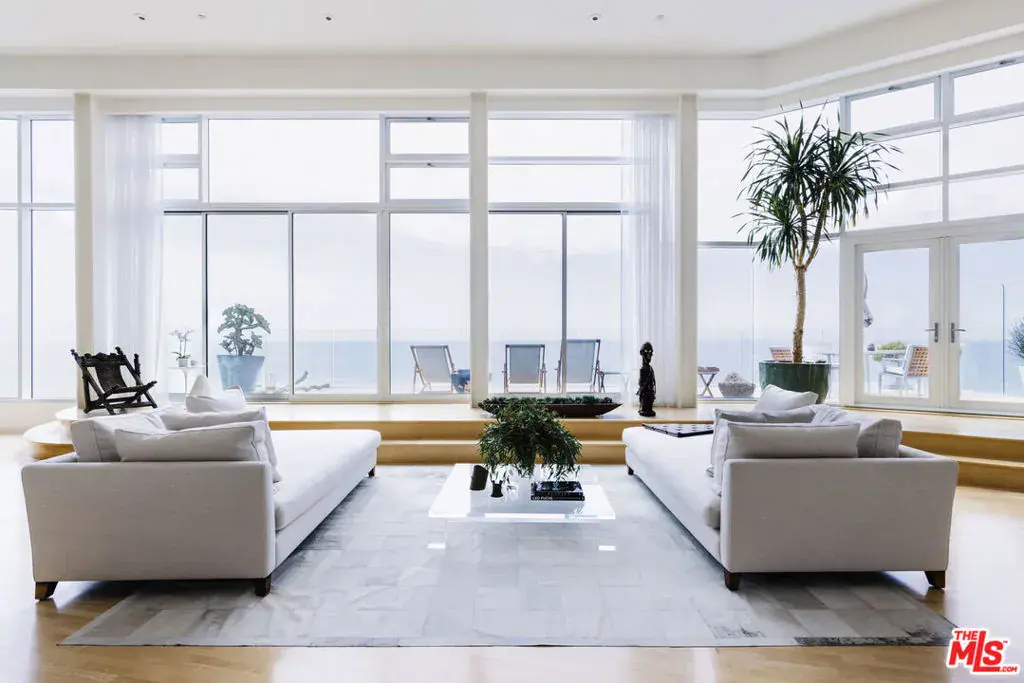A visionary architectural statement along the sands of Malibu Cove Colony, this sculptural beachfront residence exemplifies the harmony between form, light, and the Pacific horizon. Conceived as both a work of art and a livable sanctuary, the home is enveloped in walls of glass and sweeping organic curves, where each line is drawn toward the sea. With 60 feet of ocean frontage, multiple terraces, and panoramic vistas stretching from Point Dume to Palos Verdes, every room becomes a front row seat to nature’s performance. Inside, soaring ceilings and skylights pour daylight across fluid, gallery like interiors that blend contemporary sophistication with a serene coastal palette. The main living area unfolds seamlessly with living, dining, and kitchen spaces unified by transparency and light. A sleek fireplace anchors the space, while the kitchen’s stainless steel appliances, bar seating, and built in banquette evoke both utility and style. Step through glass doors to the full width oceanfront balcony, a stage for golden sunsets and intimate al fresco dinners. Above, a tranquil loft office and sitting area opens to an expansive deck, with exterior stairs ascending to a private rooftop retreat, perfect for sunbathing or quiet reflection. Below, three serene bedrooms, each with ensuite baths, offer restful privacy. The primary suite, a masterful composition of texture and tone, features a sitting area with fireplace, a spa inspired marble and limestone bath with a soaking tub poised before the sea, and a private terrace that frames the coastline in cinematic splendor. Set at the end of a prestigious guard gated enclave, this Malibu Cove Colony residence is more than a home; it is a modern sculpture in glass and light, celebrating the seamless dialogue between architecture and ocean.