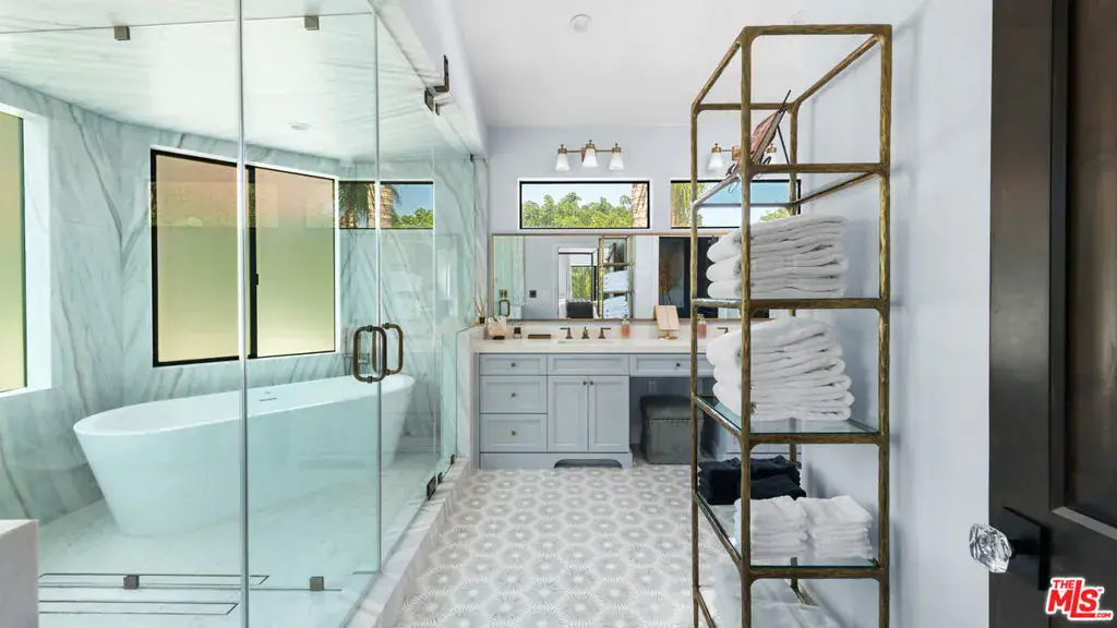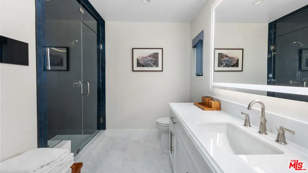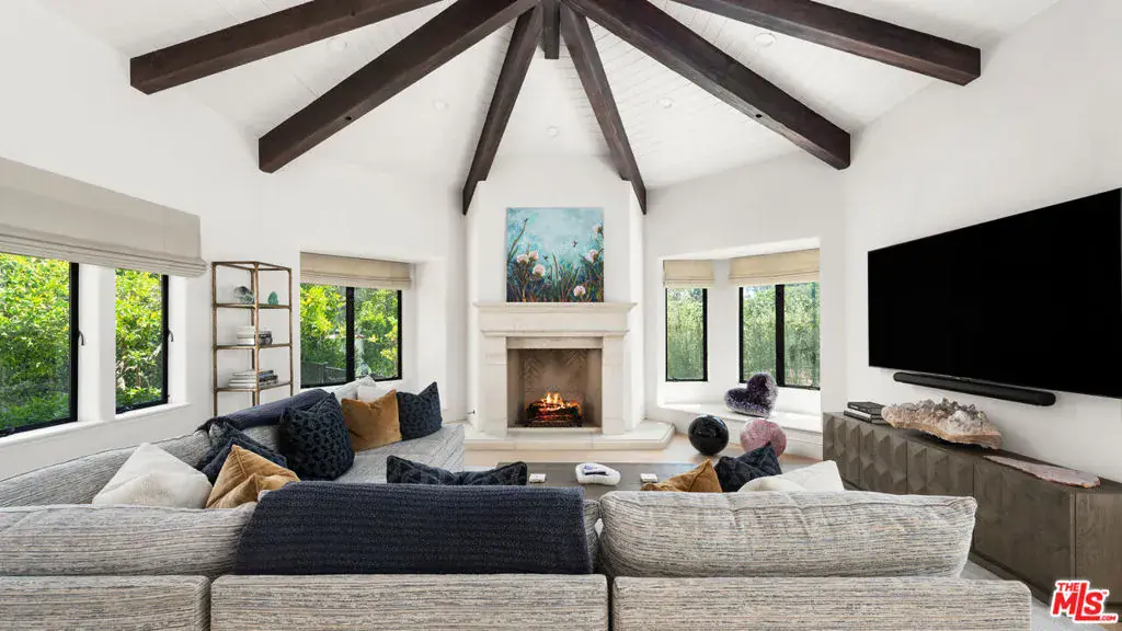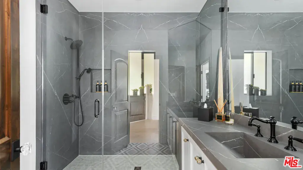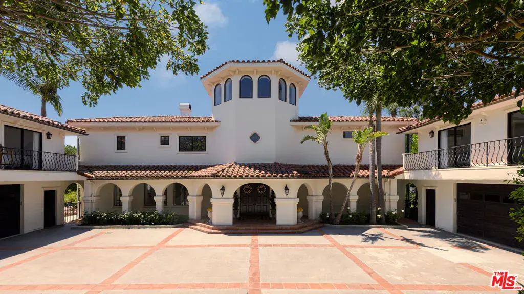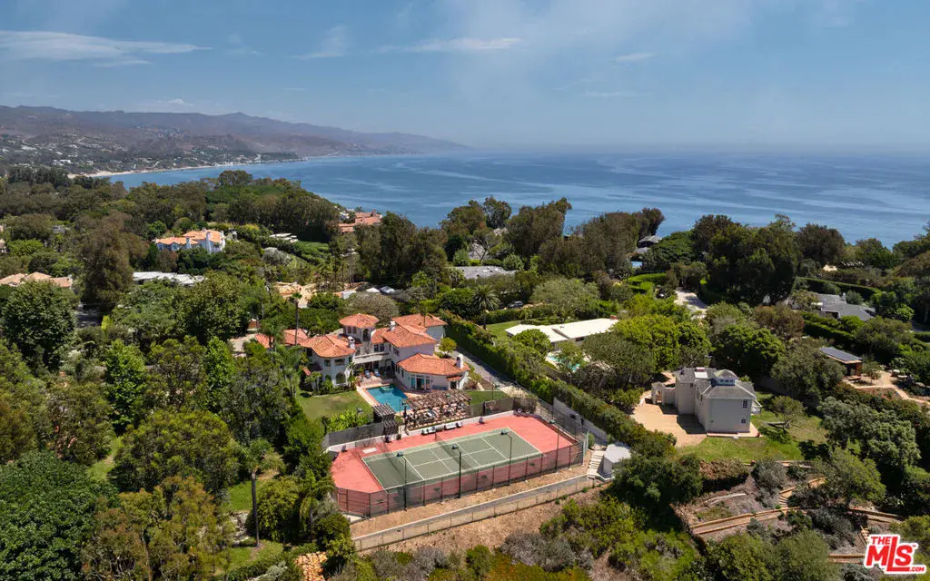 Set behind gates in one of Malibu’s most coveted enclaves, this Spanish Mediterranean estate offers exceptional privacy, resort-style amenities, and beautifully updated interiors across a rare multi-structure compound. A gated motor court introduces the residence with a covered entry and stately wood double doors that open to a dramatic two-story foyer filled with natural light. The formal living and dining rooms create an elegant flow for entertaining, while the expansive chef’s kitchen features marble counters, an ascending Wolf hood, six-burner Wolf range, double Wolf ovens, Sub-Zero refrigeration, Fisher & Paykel dishwashers, a large island with sink, breakfast bar seating, and an additional dining area overlooking the grounds. A jewel-box powder room leads toward the inviting family room, where wood floors, vaulted beamed ceilings, a grand fireplace, a reading nook, and French doors create a seamless connection to the outdoors. A staircase here descends to a temperature-controlled wine cellar. Two serene bedrooms anchor the main levelone with sliding doors and tranquil pool views, the other with wood floors, a built-in desk, and access to a stone-finished bathroom with dual showerheads. Upstairs, a versatile bedroom or bonus room connects to a Jack-and-Jill bathroom shared with an adjoining suite featuring beamed ceilings, a sliding barn door, and a custom walk-in closet. Another bedroom offers high ceilings, a loft accessed by spiral stairs, an en-suite bathroom, and a walk-in closet. The private primary suite enjoys vaulted ceilings, a sitting area with fireplace, balcony access, a spa-style bathroom with steam shower, freestanding tub, and a keypad-entry closet. Crowning the home is an octagonal tower room accessed by an exterior spiral stairway an atmospheric perch ideal for yoga, meditation, or quiet retreat. The backyard unfolds as a true resort with a large pool and automatic cover, in-ground spa, expansive brick terraces, a pergola-covered outdoor living and dining pavilion, a Lynx-equipped outdoor kitchen, and generous grassy lawns framed by fruit trees and mature privacy hedges. A dedicated outdoor gym area and a full tennis court with stadium lighting and batting setup elevate the property’s recreation potential. Two exceptional guest houses each positioned above its own two-car garage offer complete self-sufficient living with wood floors, stone counters, KitchenAid appliances, dining space, light-filled living rooms opening to balconies, comfortable bedrooms, and stone-finished bathrooms. Nest systems, thoughtful upgrades, and manicured landscaping complete this private Grayfox retreat, offering a rare opportunity to enjoy true resort living in the heart of Malibu.