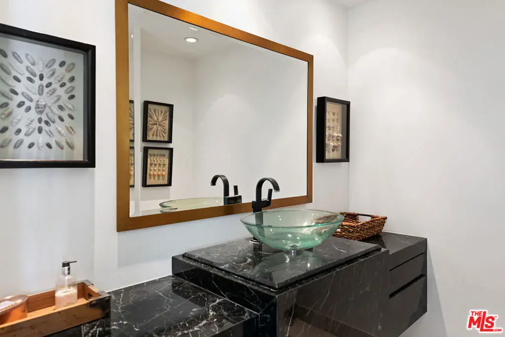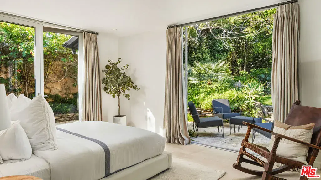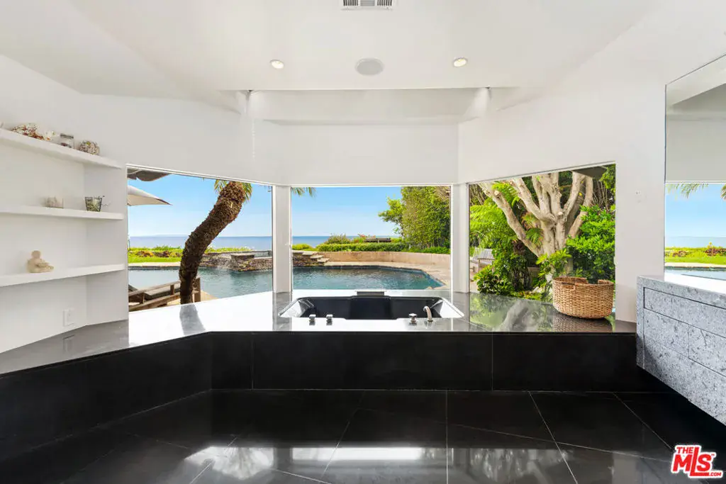 Exceptionally private and awash with natural light, this gated Point Dume blufftop estate provides over an acre of indoor-outdoor living with absolutely spectacular ocean, island, and Queen’s Necklace views. Surrounded by expansive lawns and manicured landscaping, the single-level home has a large swimming pool and a huge entertaining deck overlooking the shoreline and the sea. Gracious, open interiors with high ceilings, many skylights, generous built-ins, picture windows, and wraparound walls of glass offer wonderful sight lines to the pool, gardens, and views. Furnished for elegant comfort, the main living area flows seamlessly between the large living room with a fireplace, the dining area with a tray ceiling and service bar, the spacious media room/library with a wall of book shelves, and the marvelous chef’s kitchen. Equipped with top-quality appliances and an island with bar seating, the kitchen enjoys backyard, pool, and ocean views, and opens to the patio for poolside al-fresco dining. The home’s four bedrooms include a private guest suite with kitchenette and bath. The primary suite is a tranquil, ocean-view retreat with a walk-in closet and an amazing spa-like bath complete with skylights, gorgeous stonework, a spectacular garden-view sauna, and enormous windows facing the pool and ocean views. In addition to the huge front lawn, with a garden bench and swing-set, the home’s resort-like backyard is the perfect setting for large and small gatherings, dining, recreation, and undisturbed relaxation. With its amazing views, the backyard centers around the large waterfall pool and spa with a flagstone pool deck. There is a partially covered patio lounging area, a pergola with built-in couches, a step-up seating area with a fire pit, a barbecue, an outdoor shower, and a stunning blufftop entertaining deck with benches and views, views, views. Additional features include a mud room, a two-car garage with a washer and dryer plus an extra refrigerator and freezer, guest parking for six cars, and lifestyle amenities such as a full-house sound system and camera security, plus a coveted beach key.