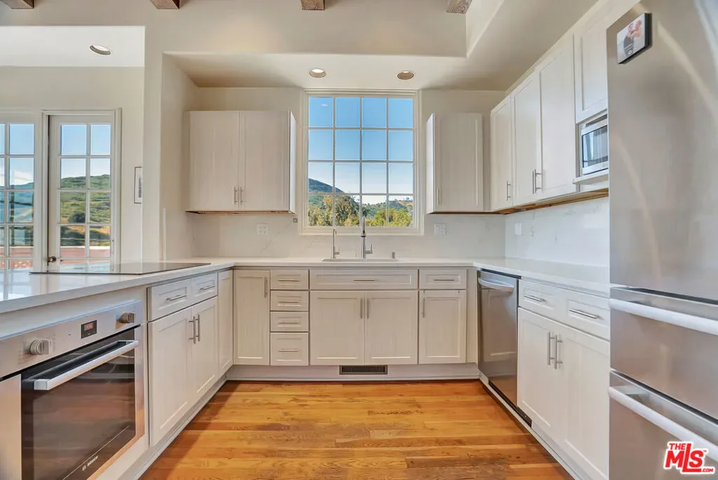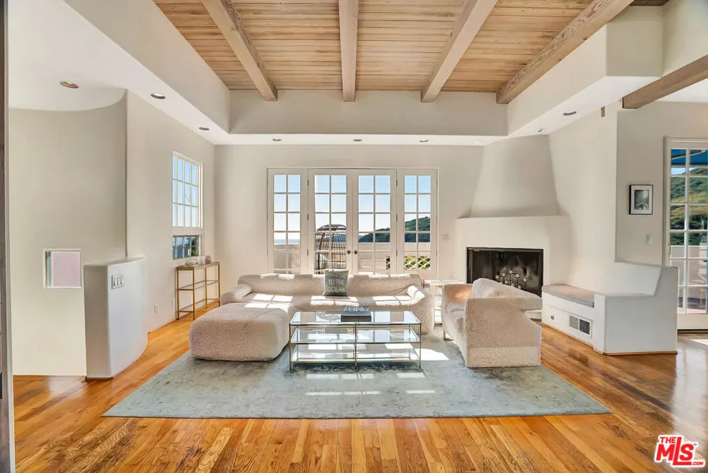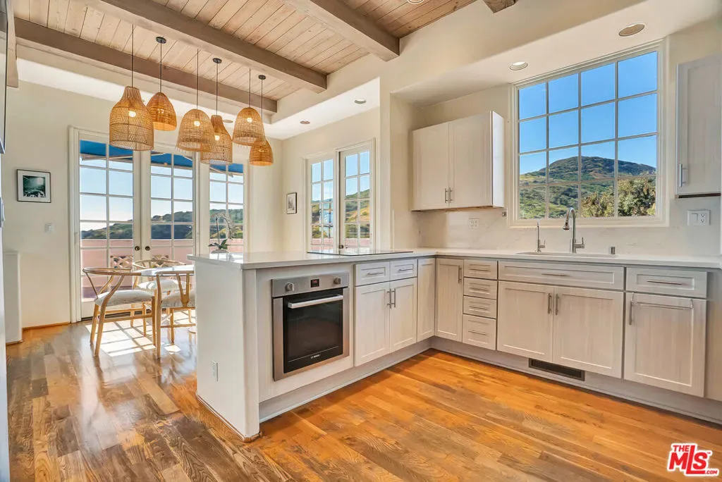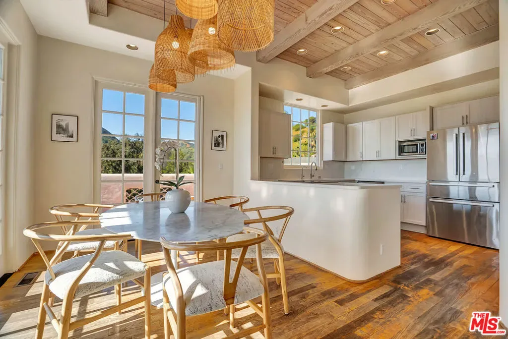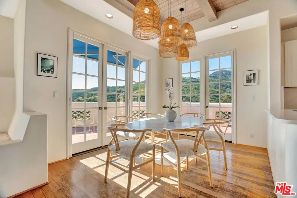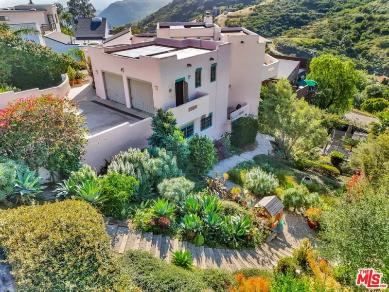Set within the coveted El Nido enclave of Corral Canyon, this beautifully distinctive retreat spans a rare double lot with sweeping ocean views toward Point Dume offering an exceptional blend of privacy, scale, and accessibility that is increasingly hard to find in Malibu. A sense of arrival unfolds as light pours into the open-concept living spaces, where French doors dissolve the boundary between indoors and out, leading to a wraparound deck with tranquil ocean vistas. Designed for both intimate living and effortless entertaining, the home balances warmth and sophistication throughout. The kitchen, thoughtfully updated with custom cabinetry, farmhouse sink, and quartz countertops, anchors the space while flowing seamlessly into the dining and family areas. The lower level reveals a highly versatile layout tailored to modern living. The primary suite is a true sanctuary, defined by soaring beamed ceilings, a private deck, walk-in closet and a spa-like bath designed for relaxation. An additional 4 rooms currently configured as bedrooms offer flexibility for guest suites, office or creative space, adapting effortlessly to a variety of lifestyles. The grounds are truly special lushly landscaped with winding garden paths, ambient evening lighting, and an array of mature fruit trees including lemon, lime, fig, orange, and blood orange. Multiple outdoor areas invite relaxation, play, and entertaining, while a private spa creates the perfect setting to unwind under the stars. A separate ADU with private entrance and kitchenette presents an exceptional opportunity for guest accommodations, income potential, or multigenerational living adding a valuable layer of flexibility and investment appeal. Additional features include a two-car garage equipped with Tesla and Rivian charging, a dedicated gym with French doors, solar power, cold plunge, a Generac generator, newer HVAC and water heater, and generous storage throughout including an expansive storage area on lower level. A rare offering that combines space, character, and lifestyle this is Malibu canyon living at its most compelling.