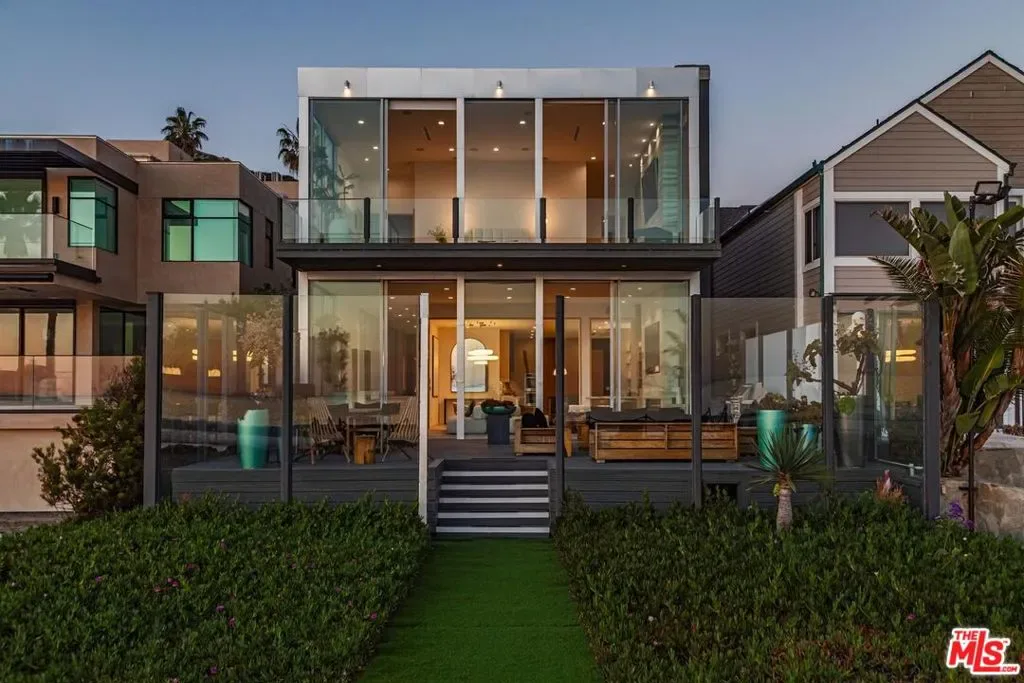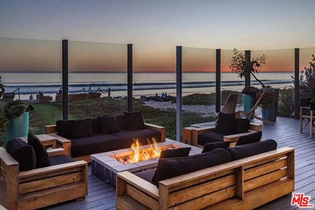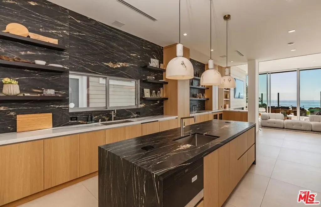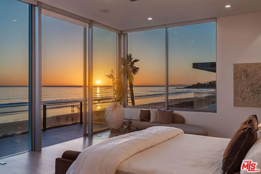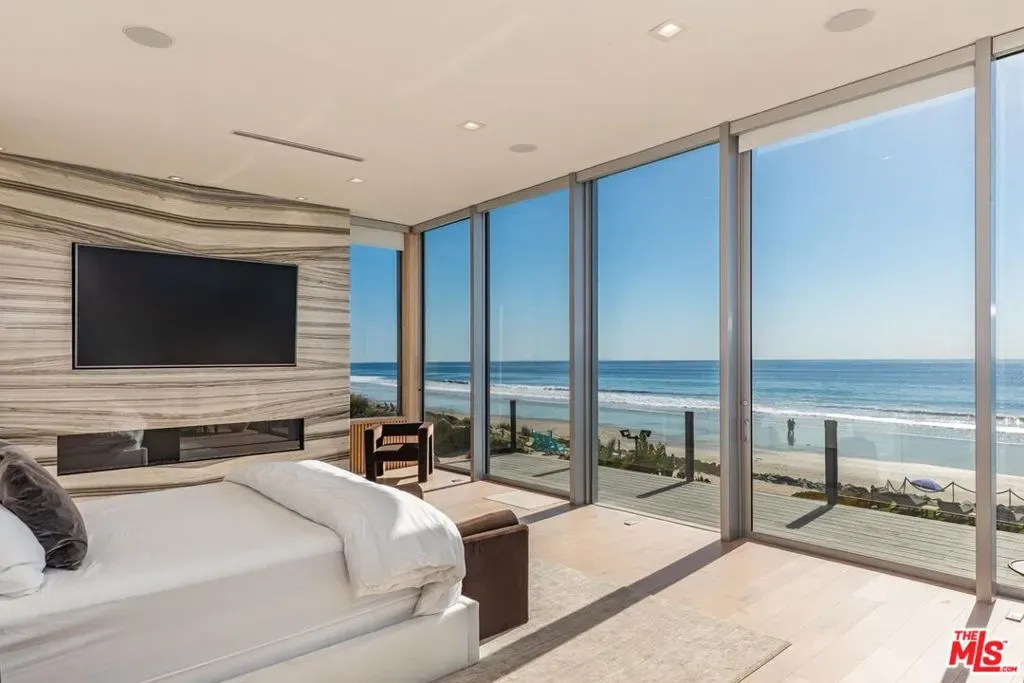 Set behind a refined teak wood facade and approached through a private courtyard, this Broad Beach architectural residence offers rare privacy with direct access to the deep, sandy beach. Fully reimagined with white oak floors, custom wood detailing, electric shades, and a calming coastal palette, the home is designed for seamless indoor-outdoor living. The main living spaces feature soaring ceilings and floor-to-ceiling glass framing unobstructed ocean and coastline views. A stone fireplace anchors the living and dining areas, flowing into a chef’s kitchen with quartzite finishes, oversized island, and Miele appliances. The ocean-facing primary suite occupies the upper level, offering full-width glass, high ceilings, a private deck, fireplace, walk-in closet, and spa-like bath. The main residence includes four bedrooms, a lower-level media room, and a detached one-bedroom guest house with kitchenette. Outdoor amenities include a glass-protected dining deck, fire pit lounge, private lawn, and direct access to the sand. A rare offering combining architectural design, privacy, panoramic views, and a separate guest house – this is a true Broad Beach trophy property.