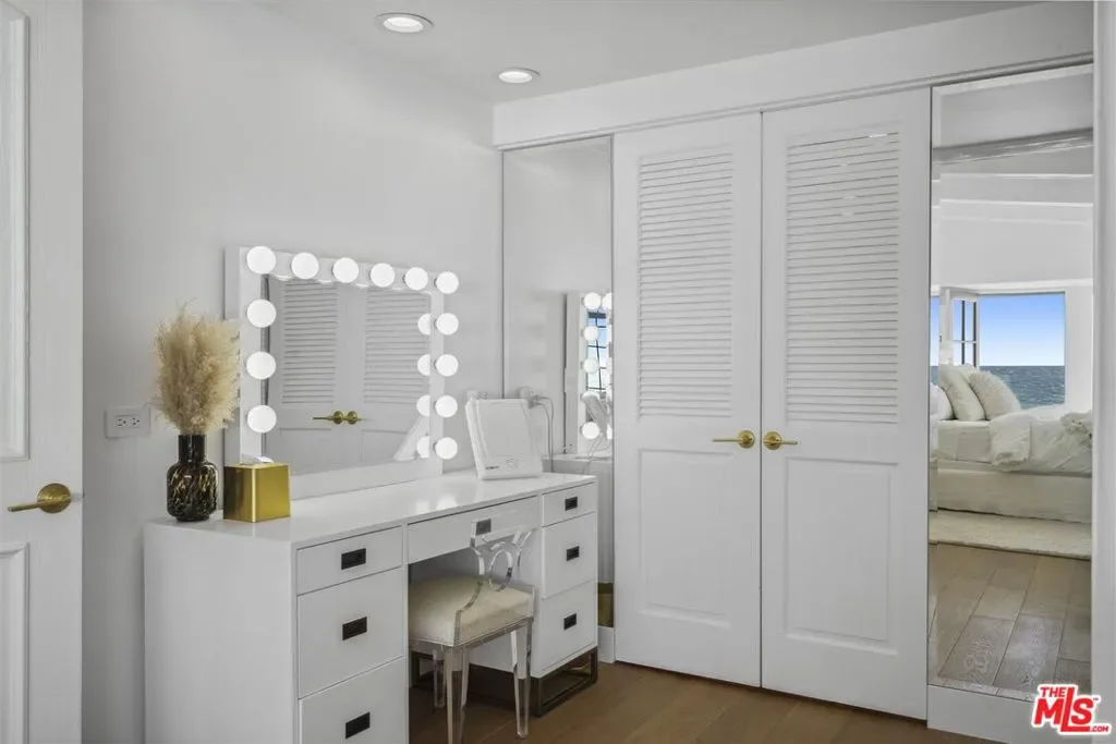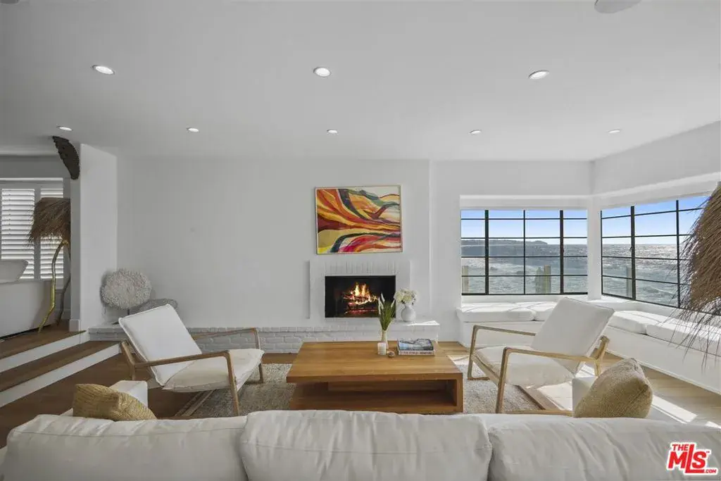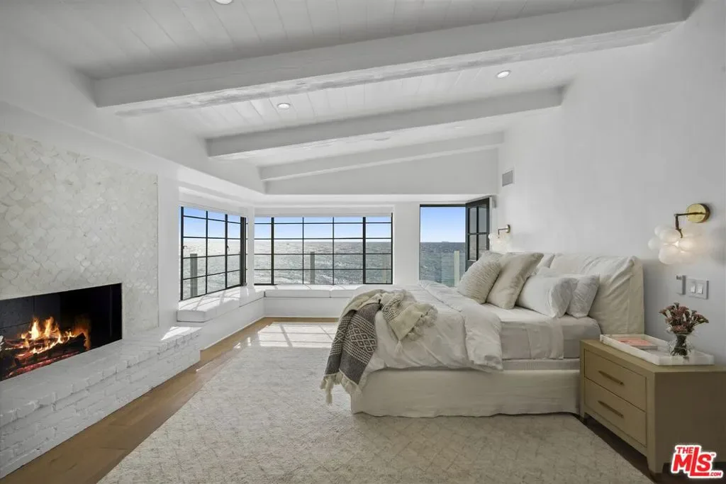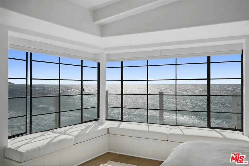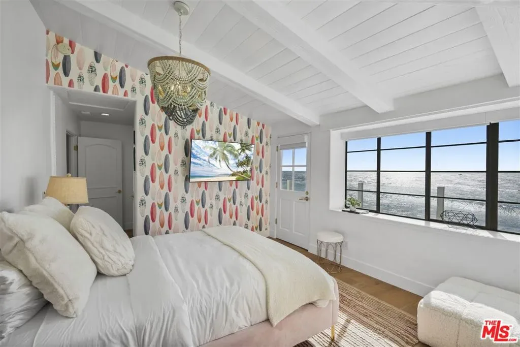 This stunning Cape Cod style beachfront residence blends timeless design with light-filled interiors, exceptional privacy, and sweeping ocean vistas from every room. Tucked away on a private drive off a quiet cul-de-sac near Broad Beach, the home captures breathtaking views of the coastline, whitewater, and endless blue horizons. Expansive windows, multiple ocean-facing decks, and direct beach access create a seamless indoor-outdoor lifestyle ideal for both relaxed living and effortless entertaining. The main level features an open-concept layout anchored by a sunken living room with a fireplace, corner windows, and a charming built-in window seat, all opening to an oceanfront deck. A spacious family room with custom built-ins and large flat-screen TV flows into the living and dining area, where panoramic ocean views provide a dramatic backdrop. The recently upgraded kitchen is both functional and refined, offering Corian countertops, elegant tile accents, a built-in desk, pantry, and top-of-the-line appliances. Throughout the home, wood flooring, air conditioning, and integrated Sonos sound enhance everyday comfort. Upstairs, the tranquil primary suite is a true coastal retreat with vaulted ceilings, a fireplace, window seat, and corner windows that open to a private upper deck overlooking the ocean. A generous walk-in closet and spa-inspired bath complete the suite. There are three additional en-suite bedrooms and an upstairs office featuring custom built-in desk space, perfect for working from home. Additional highlights include a detached two-car garage, currently outfitted as a gym with TV, extra refrigerator, washer/dryer, and storage plus parking for four vehicles. Smart-home features include security and automated window shades. Outdoors, stairs lead to an open-air shower and direct private access to the beach. Offering rare privacy, comfort, and classic coastal charm, this exceptional home is an idyllic year-round beachfront sanctuary. Summer Price 65k per month.