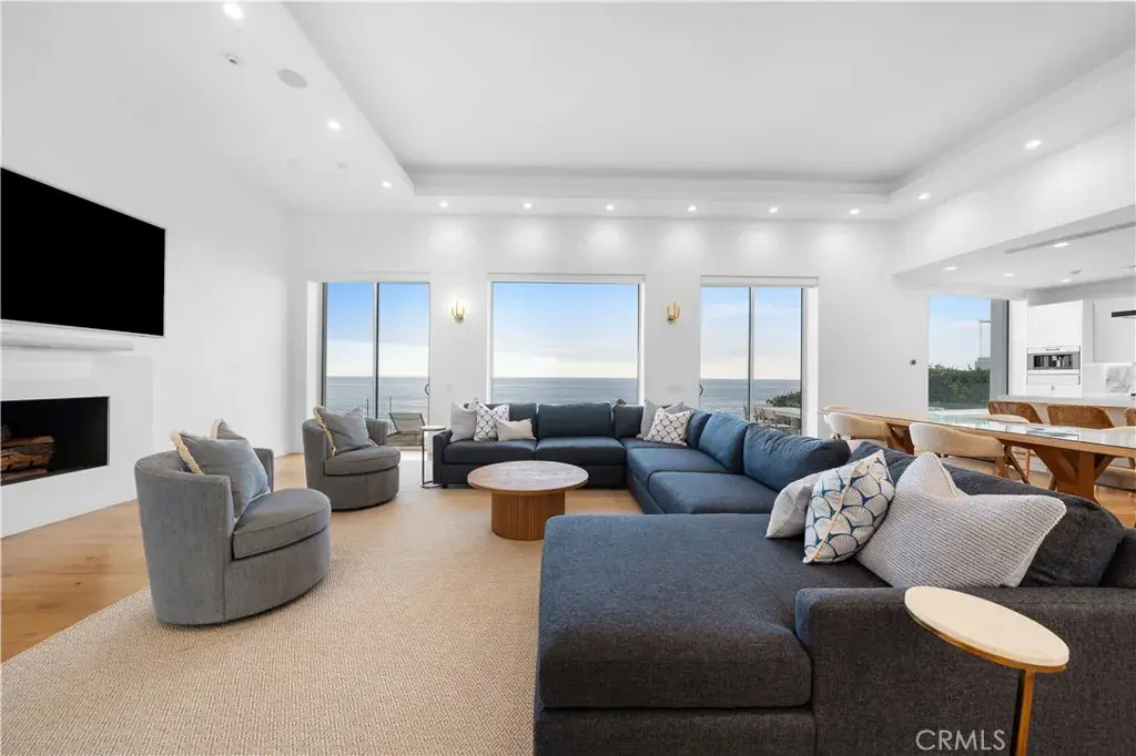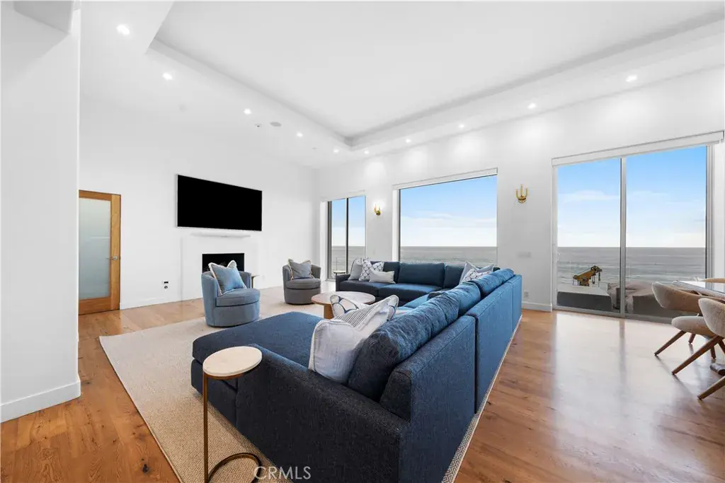 The open-concept living spaces are designed to bring the beauty of the ocean indoors. The family room, with its high ceilings, wood floors, and gas fireplace, is the perfect spot to relax while soaking in the endless blue horizon. Sliding glass doors lead to a spacious ocean-view deck, where you can entertain or simply enjoy the fresh coastal breeze. Or relax in your jacuzzi while taking in the scenery. From here, the sound of the waves is constant, reminding you that the beach is just steps away. A staircase leads you down to the sand, allowing for spontaneous walks along the shore, dips in the ocean, or just relaxing with your toes in the sand—all just steps from your door.