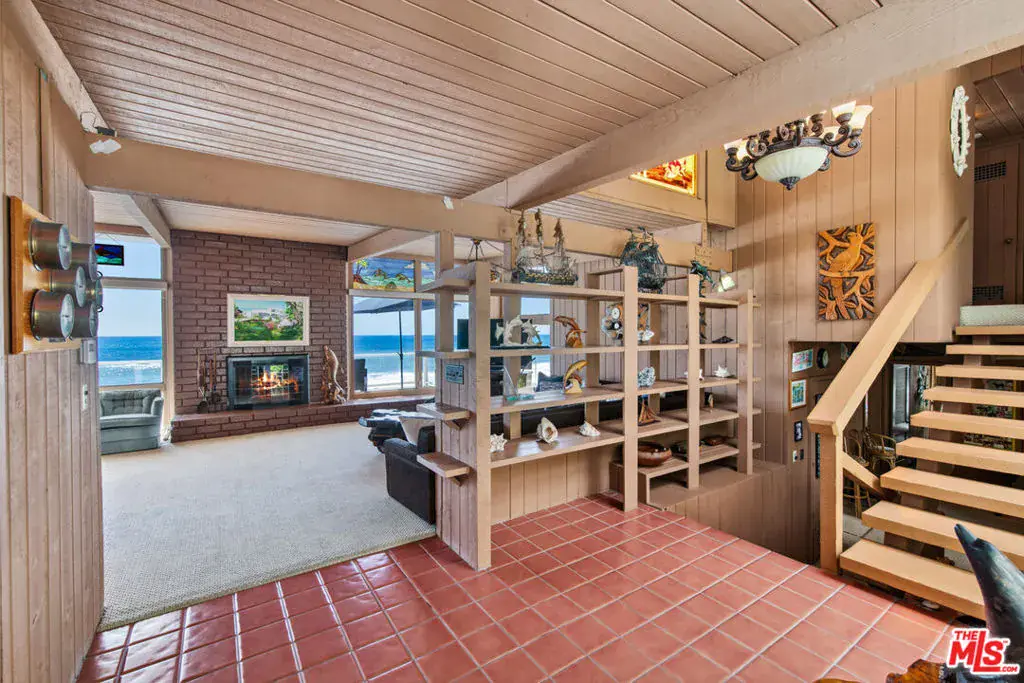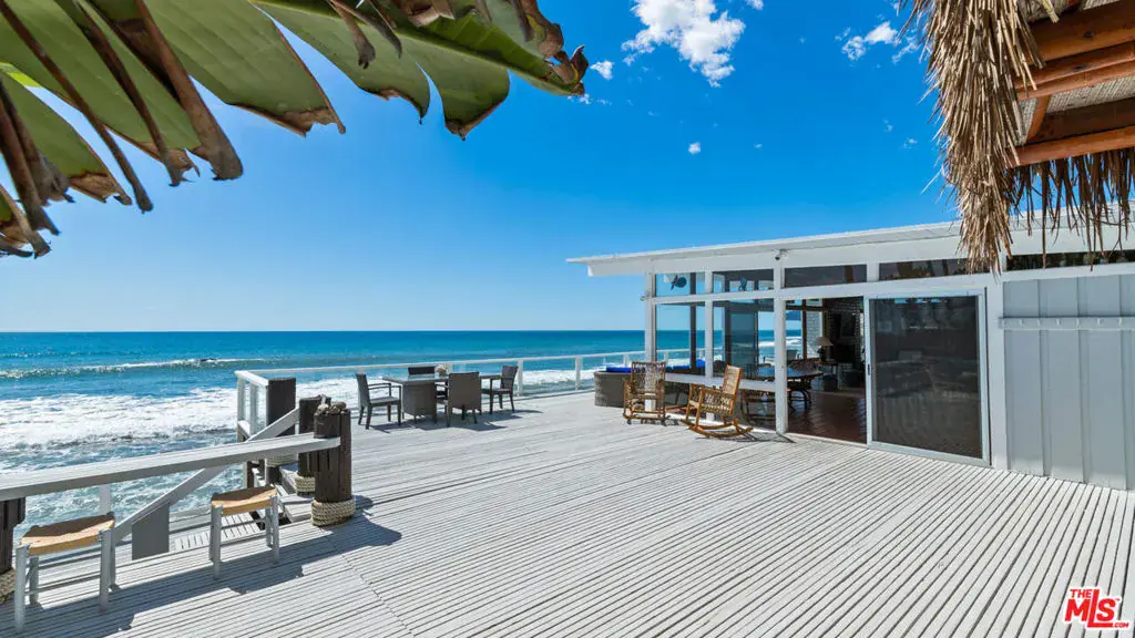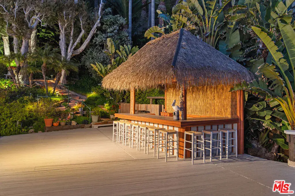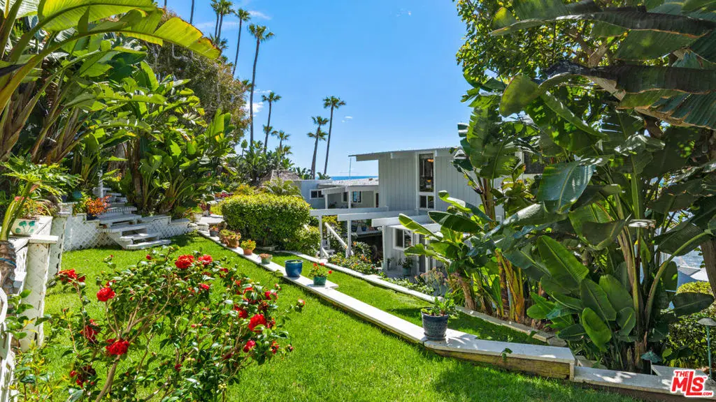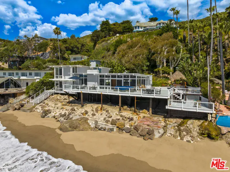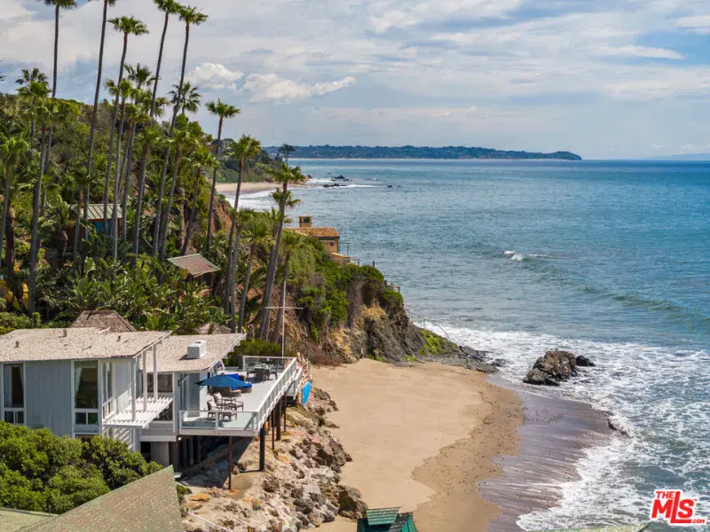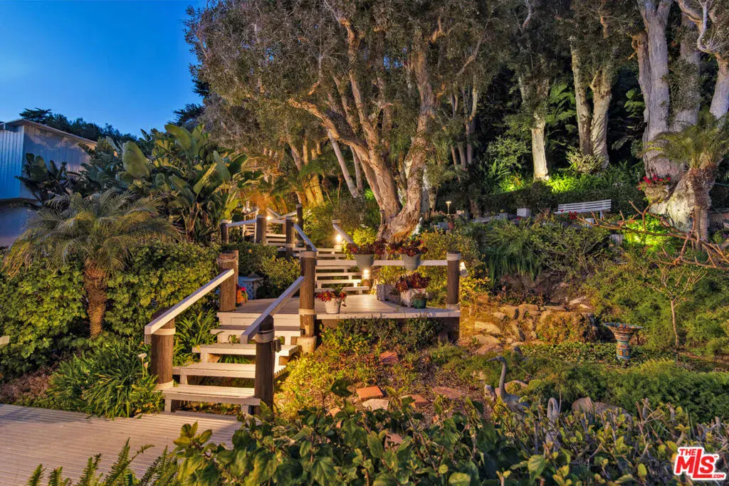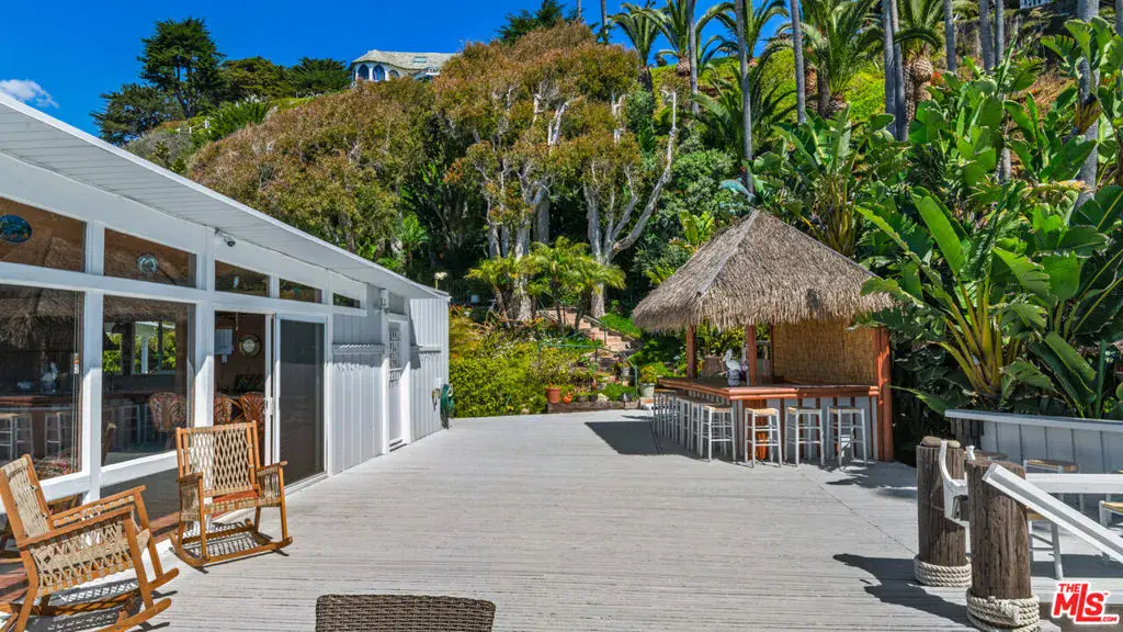 A private tropical paradise, this Western Malibu mid-century beachfront home is offered for lease for the first time. Magnificent palms, enormous window walls, expansive decks, and sensational views create an away-from-it-all atmosphere. The well-maintained interior is detailed with wood, including wood ceilings, Saltillo tile, and built-in shelves and cabinets characteristic of mid-century design.Known as Watkin’s Cove, the terraced cul-de-sac property steps down from an upper-level two-car garage. A beautiful walkway meanders through lush gardens and terraced lawn areas, with a creek, a small pond, and a fountain.The ocean is on view from the moment you step into the foyer. Ahead is the spacious living room, with wraparound windows, fireplace, and a brick hearth that extends the length of one wall as a window seat. Adjoining the living room is a great room that comprises a top-quality kitchen, dining area, and bar, plus a pantry. With floor-to-ceiling windows on two sides, this large room opens onto a huge, wraparound, multi-level deck complete with a tiki hut bar, barbecue and dining area, and ample room for lounging and entertaining overlooking the beach, coastline, ocean, and island views. There is also a powder room on this level.The lower level has three bedrooms plus a recreation/media room, while the upper level has three more bedrooms, including the primary suite, which has gorgeous panoramic ocean views.The home offers wonderful settings for indoor-outdoor entertaining, including a peaceful front yard with ocean views, decks on two levels, lawns surrounded by flower gardens, and a wide stairway leading to the quiet, sandy beach below. A rare Malibu treasure.