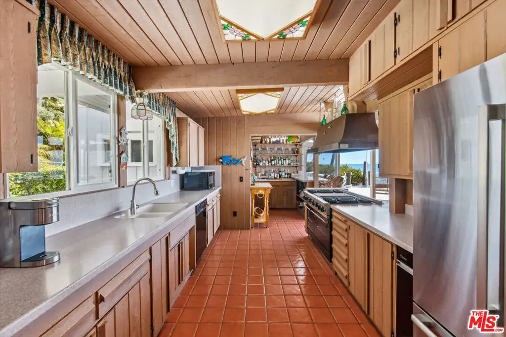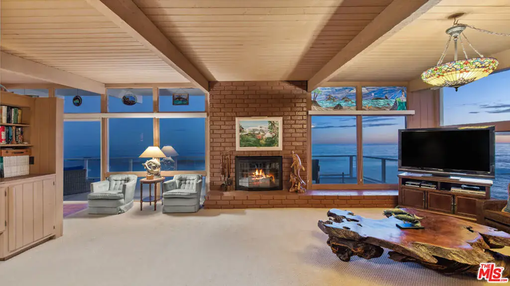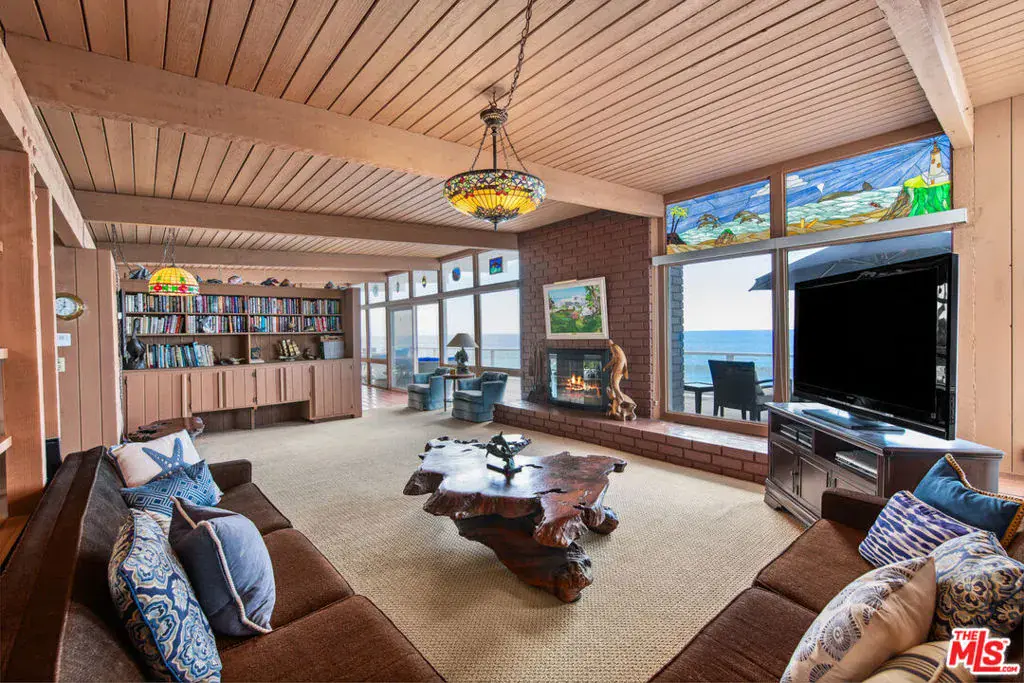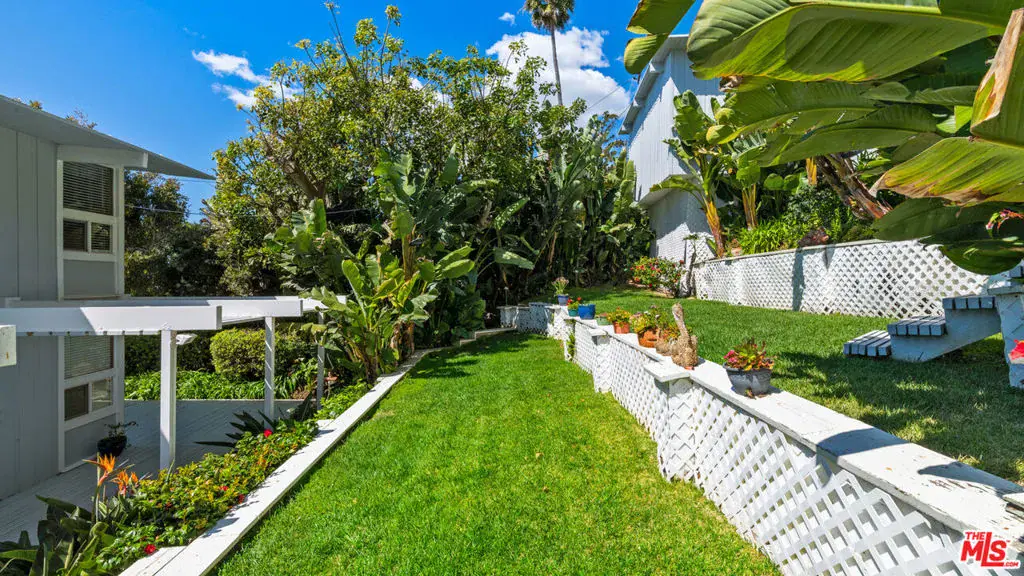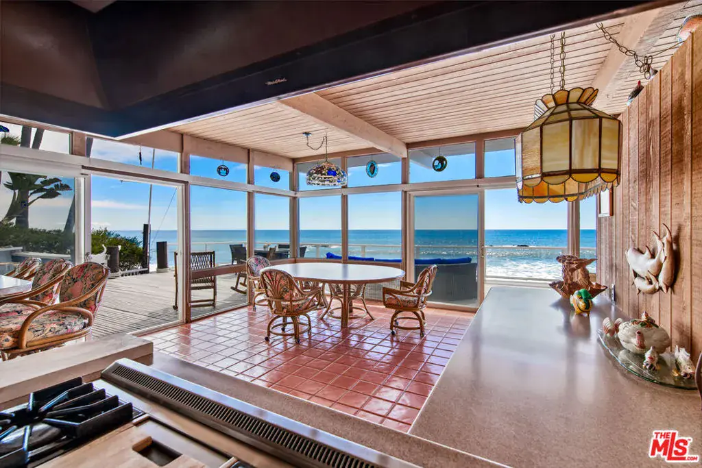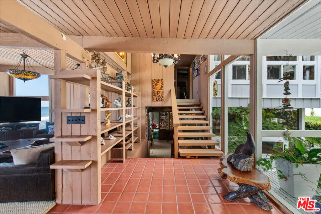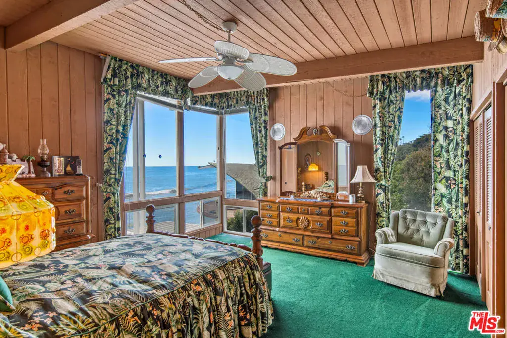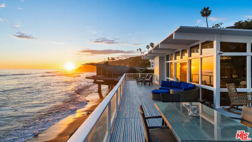 A private tropical paradise, this Western Malibu mid-century beachfront home is offered for lease for the first time. Magnificent palms, enormous window walls, expansive decks, and sensational views create an away-from-it-all atmosphere. The well-maintained interior is detailed with wood, including wood ceilings, Saltillo tile, and built-in shelves and cabinets characteristic of mid-century design.Known as Watkin’s Cove, the terraced cul-de-sac property steps down from an upper-level two-car garage. A beautiful walkway meanders through lush gardens and terraced lawn areas, with a creek, a small pond, and a fountain.The ocean is on view from the moment you step into the foyer. Ahead is the spacious living room, with wraparound windows, fireplace, and a brick hearth that extends the length of one wall as a window seat. Adjoining the living room is a great room that comprises a top-quality kitchen, dining area, and bar, plus a pantry. With floor-to-ceiling windows on two sides, this large room opens onto a huge, wraparound, multi-level deck complete with a tiki hut bar, barbecue and dining area, and ample room for lounging and entertaining overlooking the beach, coastline, ocean, and island views. There is also a powder room on this level.The lower level has three bedrooms plus a recreation/media room, while the upper level has three more bedrooms, including the primary suite, which has gorgeous panoramic ocean views.The home offers wonderful settings for indoor-outdoor entertaining, including a peaceful front yard with ocean views, decks on two levels, lawns surrounded by flower gardens, and a wide stairway leading to the quiet, sandy beach below. A rare Malibu treasure.