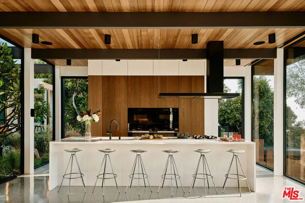 Introducing The Glass House by John Klopf, AIA, the midcentury modern masterwork of Malibu Park. Thoughtfully conceived within the natural landform on over half an acre, this newly constructed single-level residence is beautifully elevated above Zuma, offering blue-hued views of the Pacific Ocean and the earth-toned coastal mountains. An artfully composed blend of floor-to-ceiling glass, warm woods, and handsome, hand-poured terrazzo creates a paradisal, livable art piece. Beyond the saltwater pool and manicured yard, an outdoor sanctuary of impeccably curated landscaping unfolds, with a meandering pathway leading to a fire pit, sculpture garden, and pickleball court. Completing the estate is a secondary A-frame structure, offering versatile space for an office or gym. The Glass House provides a singular living experience, where every element is masterfully designed to inspire and elevate.