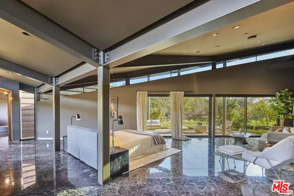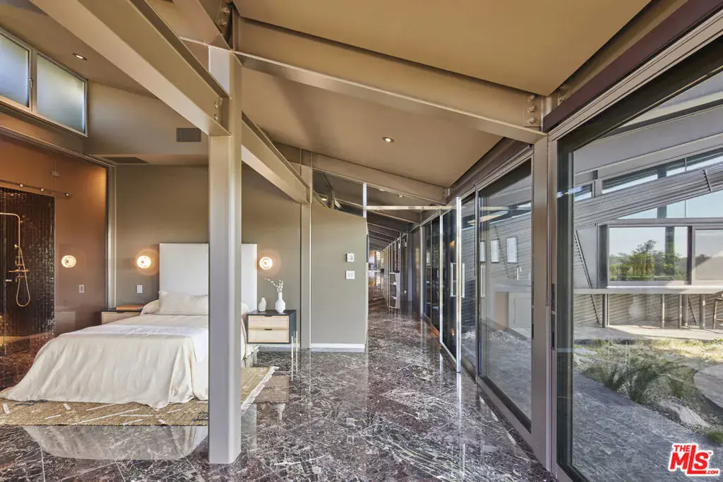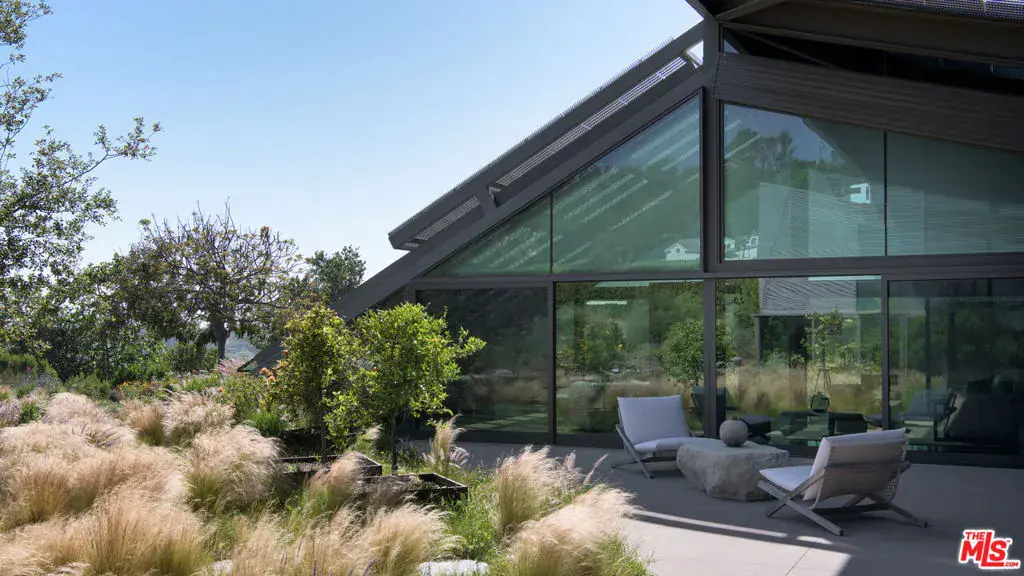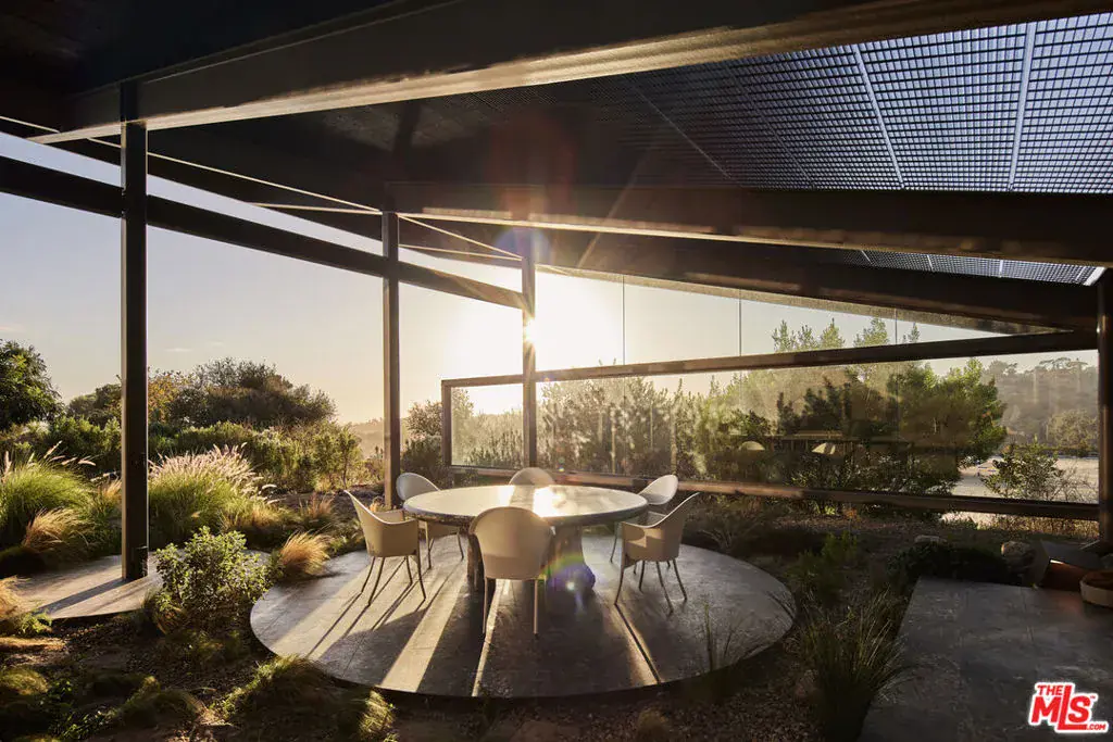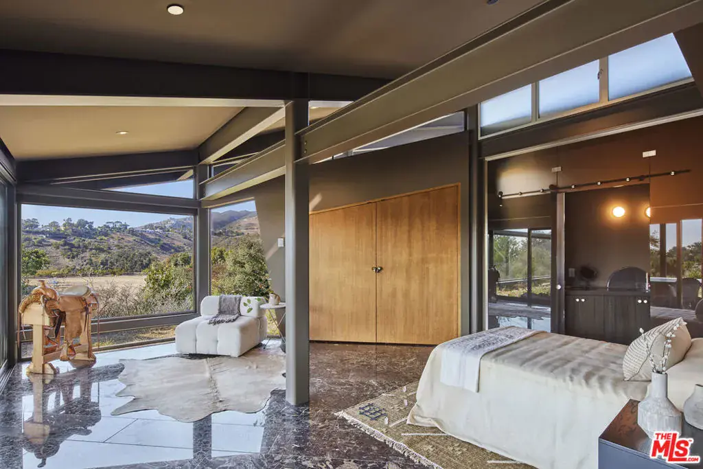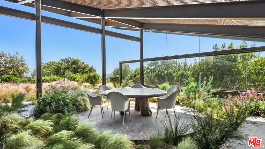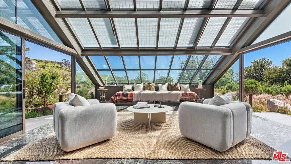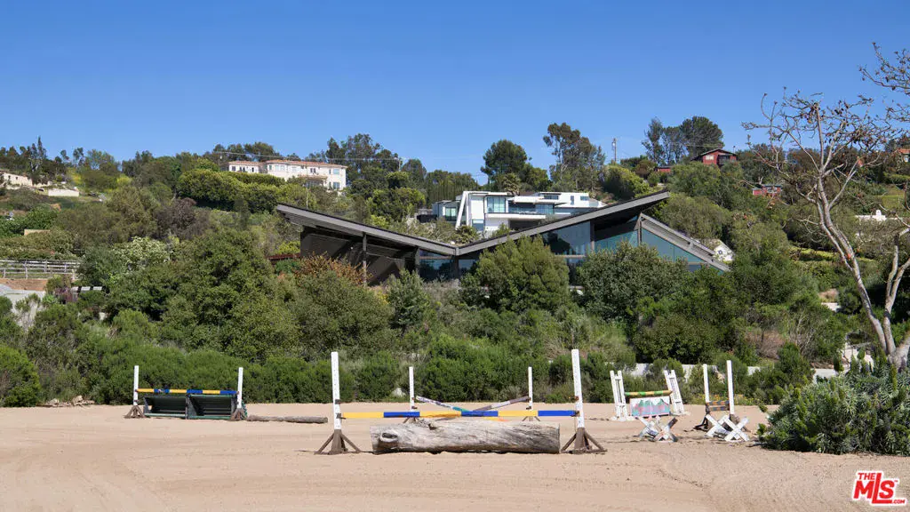 Set on a plateau above Bonsall Canyon in Malibu, this extraordinary property offers an abundance of natural light and captures stunning mountain and ocean views. Spanning four level acres, the estate epitomizes the art of modern architecture and design. Conceived by visionary architect Ed Niles, FAIA, this iconic residence is a striking example of architectural innovation. Surrounded by breathtaking vistas of mountains, canyons, and the shimmering Pacific Ocean, the property offers complete seclusion, accessible via dual gated entries for a truly private retreat. Unlike conventional coastal designs, this 7,200-square-foot masterpiece seamlessly blends concrete, steel, and expansive glass walls in a unique structure crowned by a dramatic wing-shaped butterfly roof. This bold architectural statement not only makes a striking visual impression but also integrates the residence harmoniously with its lush surroundings. Additionally, 1,500 square feet of cantilevered stone terraces enhance the indoor-outdoor flow, providing captivating viewpoints from every angle. The home’s sophisticated interiors are a celebration of refined tranquility. Italian marble floors, custom hand-painted pillars, and a subtle coastal palette complement the abundant natural light, creating an atmosphere that is both serene and inviting. Six distinct wings extend from a central hall, each offering a unique character and relationship to the surrounding landscape. From the soaring living room and peaceful study in one wing to the open great room with a gourmet kitchen, dining area, and family room, the layout encourages both intimate gatherings and grand entertaining. Floor-to-ceiling glass walls throughout the home provide sweeping views of the infinity pool, surrounding gardens, and the rugged Malibu landscape, ensuring that every space is bathed in natural light. The primary suite, located in a private wing, features an opulent spa-inspired bathroom with a glass-enclosed shower, an Italian marble soaking tub, and spacious custom closets. Four additional bedrooms, each with remarkable views, offer luxurious accommodations for guests or family members. Designed for sophisticated outdoor living, the estate features a shimmering swimming pool, spa, and a fully equipped outdoor kitchen and BBQ area. A shaded dining pavilion offers the perfect setting for alfresco dining, while professional equestrian facilities complete with a 4-stall barn, a professional jumping arena, and ample pastures provide an unparalleled equestrian lifestyle. The property offers direct access to over 400 miles of scenic riding, hiking, and biking trails, or simply a short golf cart ride to Malibu’s pristine beaches.With approved plans for two additional guest structures, this estate is a rare offering, embodying Malibu’s spirit of architectural ingenuity, elegance, and natural beauty. This is more than just a home; it’s a serene sanctuary and a landmark of modernist design in one of Southern California’s most desirable settings.