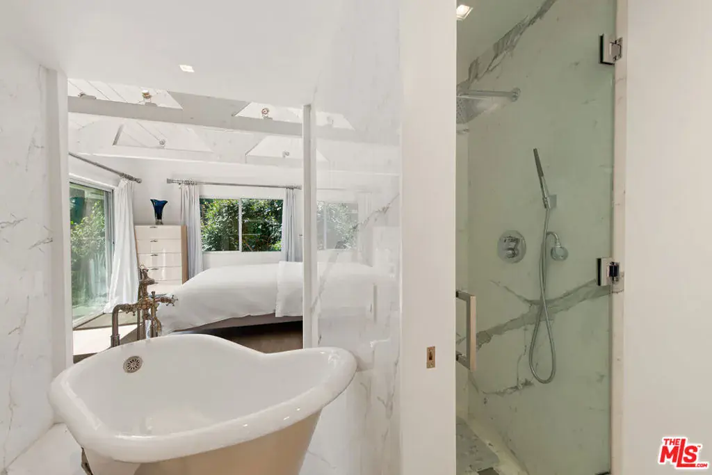 The perfect Malibu getaway, Petit Chateau des Bois is a single-level garden guesthouse with bright, spacious interiors updated for superb comfort and relaxed indoor-outdoor living and entertaining. Gated and very private, life at the chateau revolves around a large, open great room with vaulted, trussed ceilings, fireplace, wood floors, ample seating, and a storage loft. This lovely space, with multiple sets of garden-facing windows, adjoins the beautifully updated kitchen, which has a waterfall-style island with bar seating, dramatic under-cabinet lighting, abundant storage space, and top-quality appliances. The all-marble spa-style bath is immaculate and charming, with a freestanding tub. The bedroom has high, trussed ceilings and wide sliding glass doors that open to a wraparound patio and lawn for relaxing, dining, and entertaining. The property is equipped with air conditioning, DoorBird system, parking, and a backyard shed with laundry and storage space. An occasional creek sits on the property line. This is an ideal escape, close to Point Dume, beaches, and miles of trails for hiking and riding.