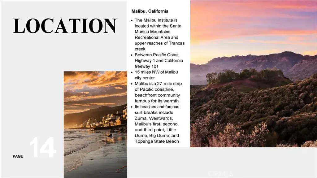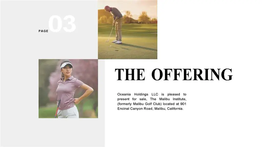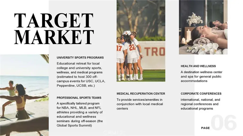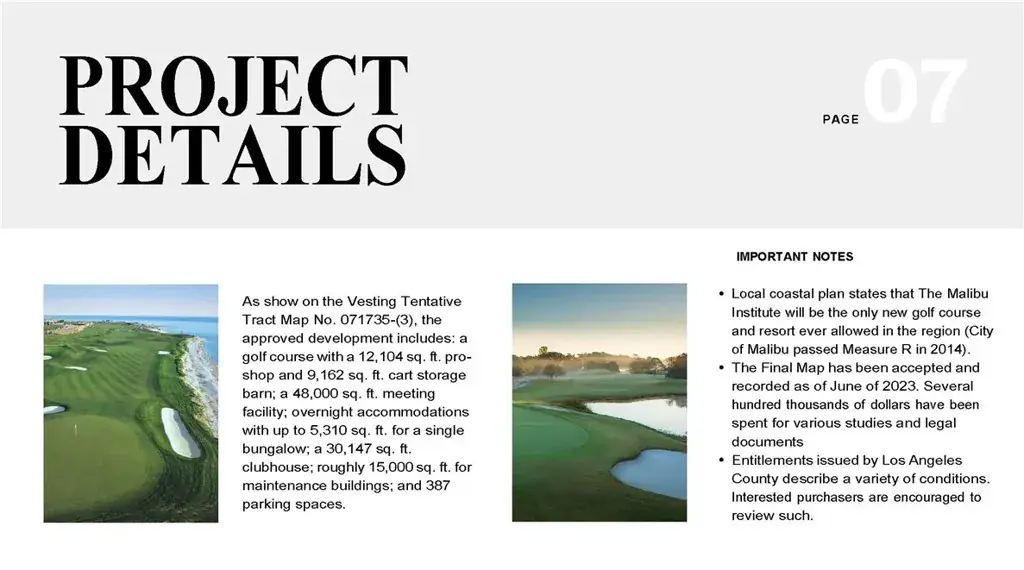 Iconic Malibu’s ultimate legacy: “The Malibu Institute,” formerly Malibu Country Club. Approximately 650-acre fully entitled California coastal estate, master-planned for Southern California’s most exclusive golf resort, wellness sanctuary, and world-class wedding and event destination. LAST APPROVED development of its kind and scale in the Santa Monica Mountains—irreplaceable. Final Tract Map (TR071735-3) recorded June 2023; all primary entitlements secured (Coastal Permit effective, extensions current). “Shovel-ready.”