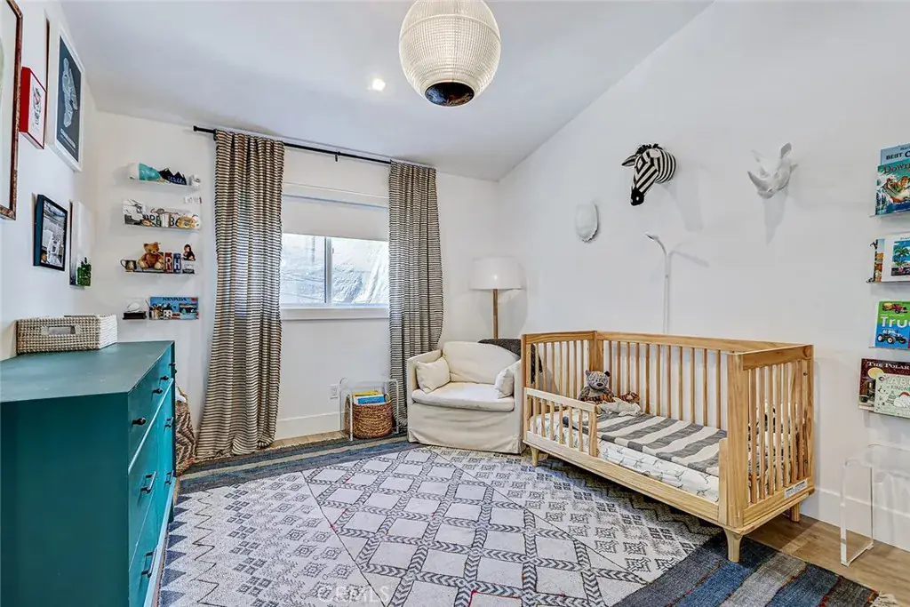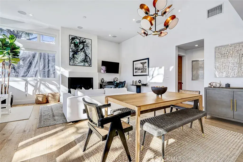 The master bedroom is anchored by a stunning, spa-like bathroom featuring custom stone and tile finishes with double vanities. A designer powder room with statement wallpaper adds personality and style. Additional highlights include sweeping views of the LA Basin, central A/C with a Nest thermostat, and a modern square radiant fireplace in the living room.