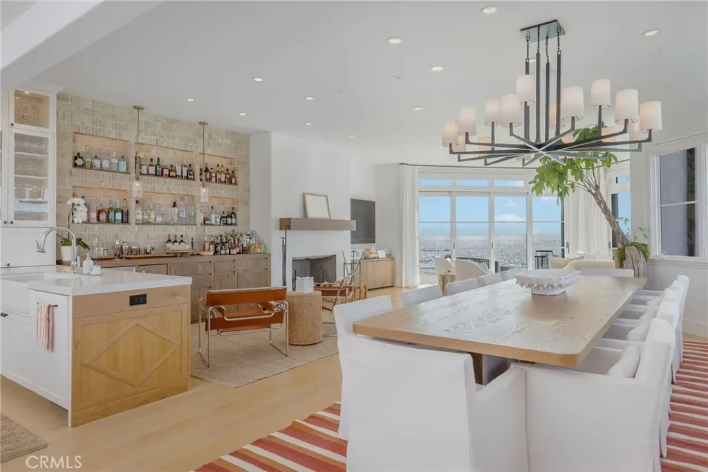 The upper level is a dramatic open-concept living and entertaining space designed to maximize panoramic ocean views. The living and dining areas open to dual decks capturing sweeping coastline vistas to the north and south, including a direct sightline to the Manhattan Beach Pier.