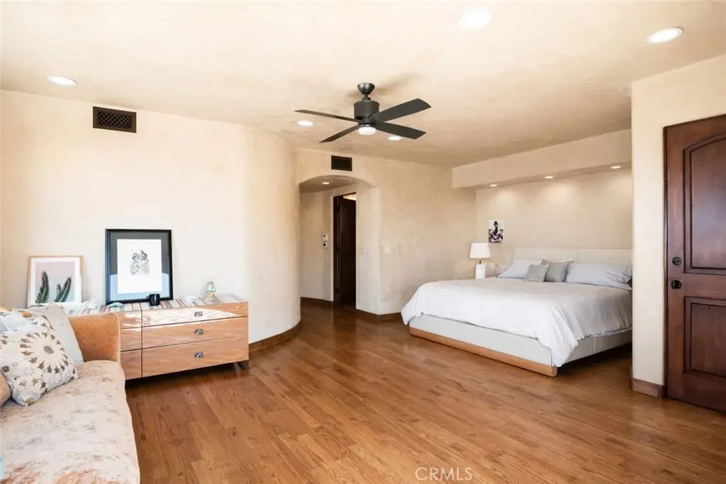 The expansive living room is framed by exposed wood beam ceilings and large arched windows that bathe the space in natural light while showcasing panoramic ocean vistas. The custom fireplace adds warmth and charm, while the adjacent dining area creates an inviting space for hosting with the Pacific Ocean as your backdrop. The walls are finished with luxurious Venetian plaster throughout, adding a subtle warmth and attention to detail that elevates the home’s sophistication.