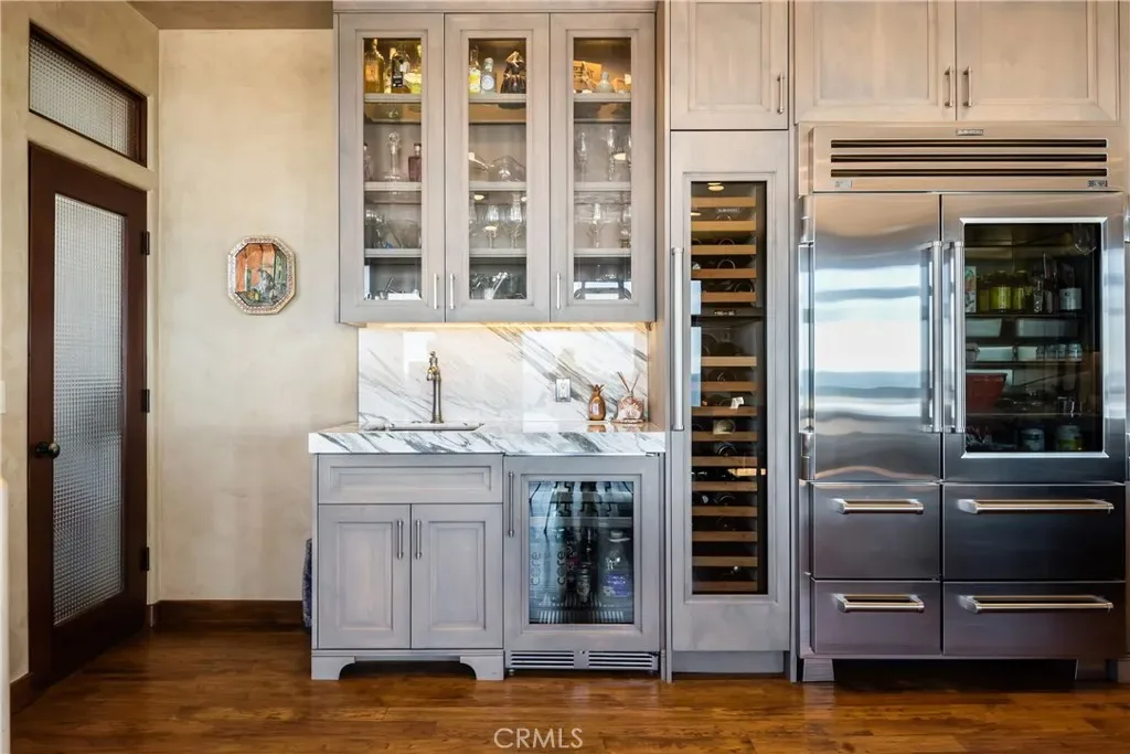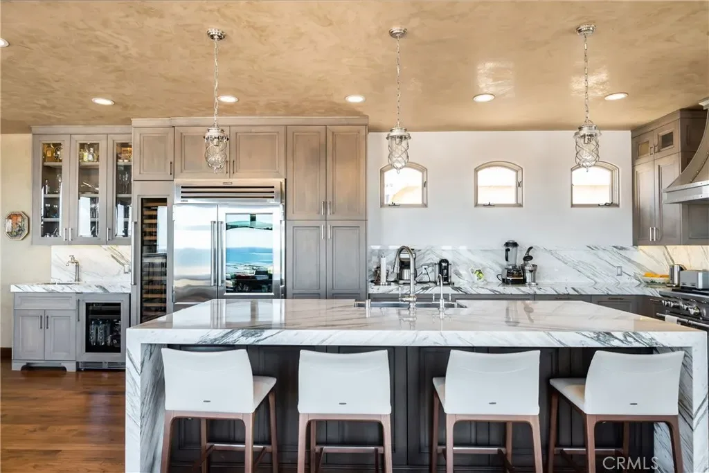 The chef’s kitchen is a showstopper, featuring marble countertops, sleek European-style cabinetry, and professional-grade Wolf appliances. Step outside to the Multiple outdoor entertainer’s decks equipped with a built-in BBQ, a lighted fire pit, and comfortable lounge seating — perfect for soaking in golden sunsets over the ocean.