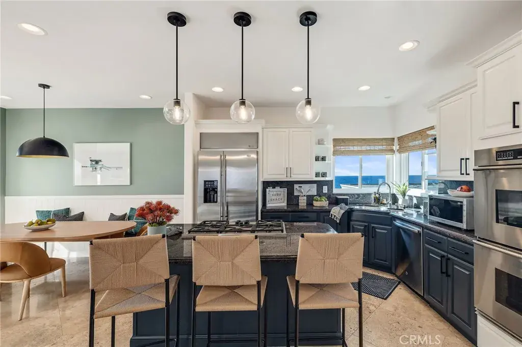 By day, large windows flood the space with natural light; by evening, they frame breathtaking sunsets over the Pacific. Just off the great room, a large private patio with lounge seating extends the living space outdoors—perfect for morning coffee, sunset cocktails, or relaxed evenings overlooking the ocean. This level also includes a convenient powder room (½ bath), making it ideal for entertaining while preserving privacy in the bedroom areas.