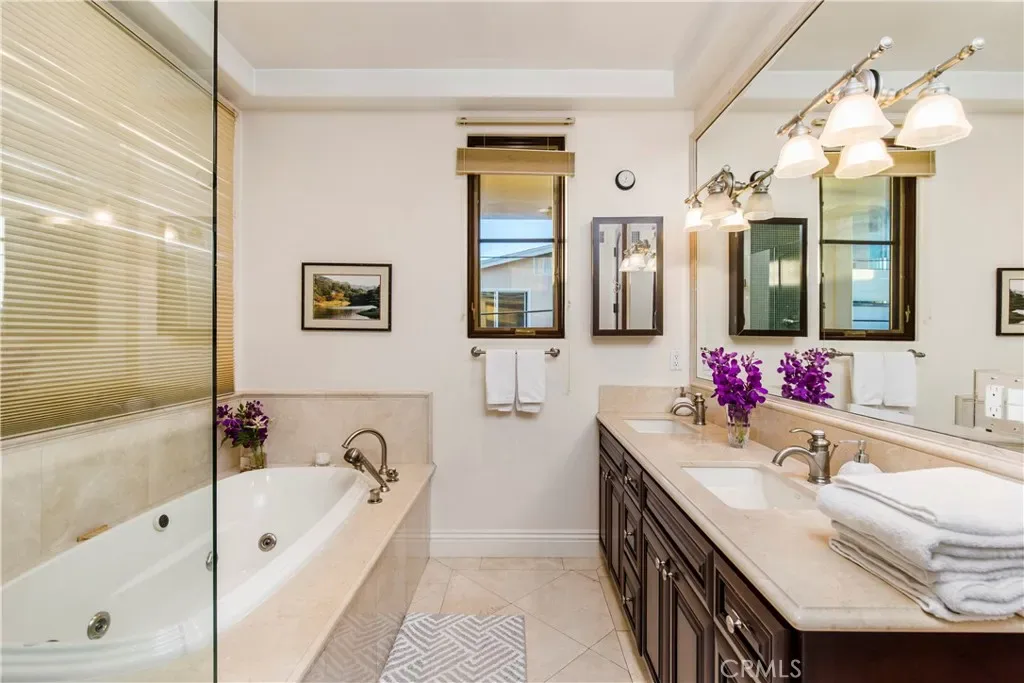 The master suite exudes opulence, offering a king-sized bed, a walk-in closet, and a flat-screen TV, accompanied by a lavish master bathroom for ultimate relaxation with spa tub, and walk-in mosaic tile shower. The second bedroom provides a serene retreat with a queen bed and a private bathroom, while the downstairs guest bedroom offers additional comfort with a queen bed and attached bathroom.