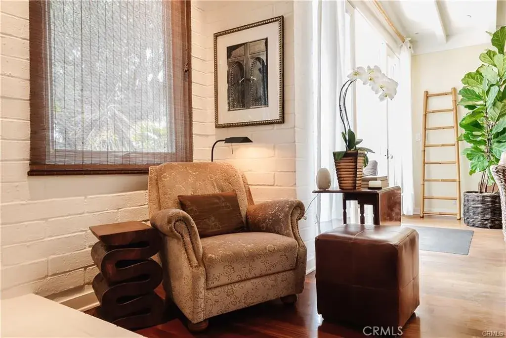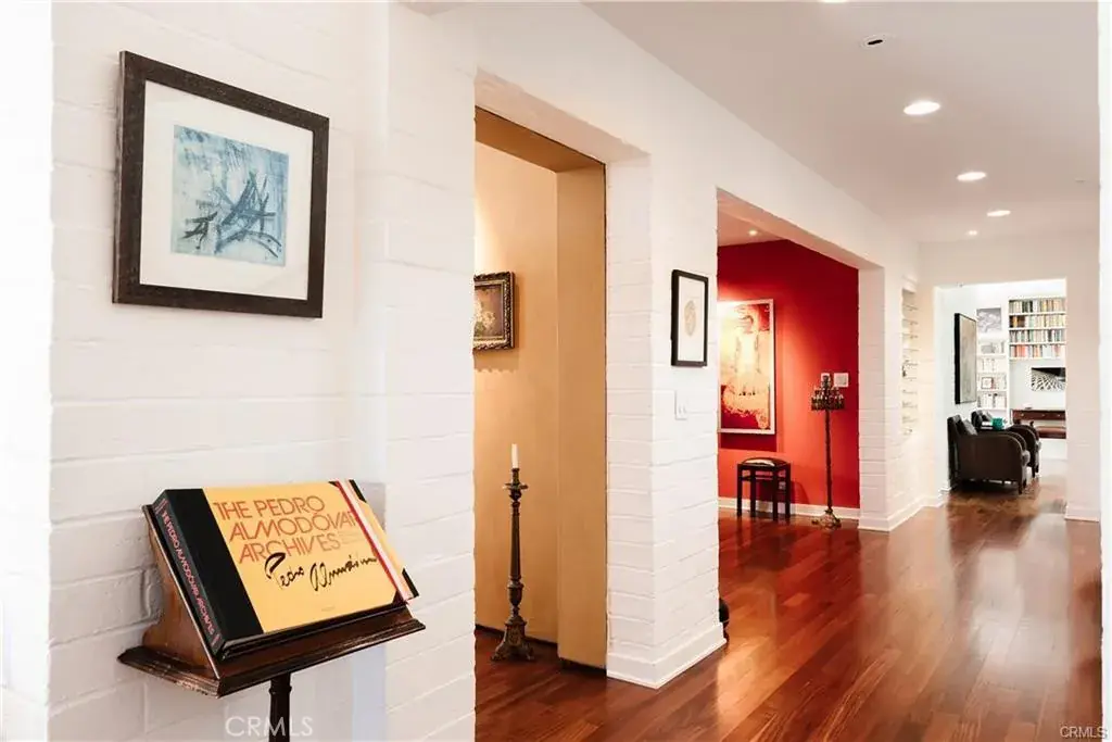 The bright, beautifully appointed kitchen is fully equipped with every gadget a chef could desire and opens to a breakfast room and a Moroccan-inspired patio with a fountain. Additional highlights include a tucked-away office, laundry room, a striking dining room with rich red walls and leather chairs, and two inviting living rooms—one featuring a white painted brick fireplace, vaulted wood ceilings, and a piano.