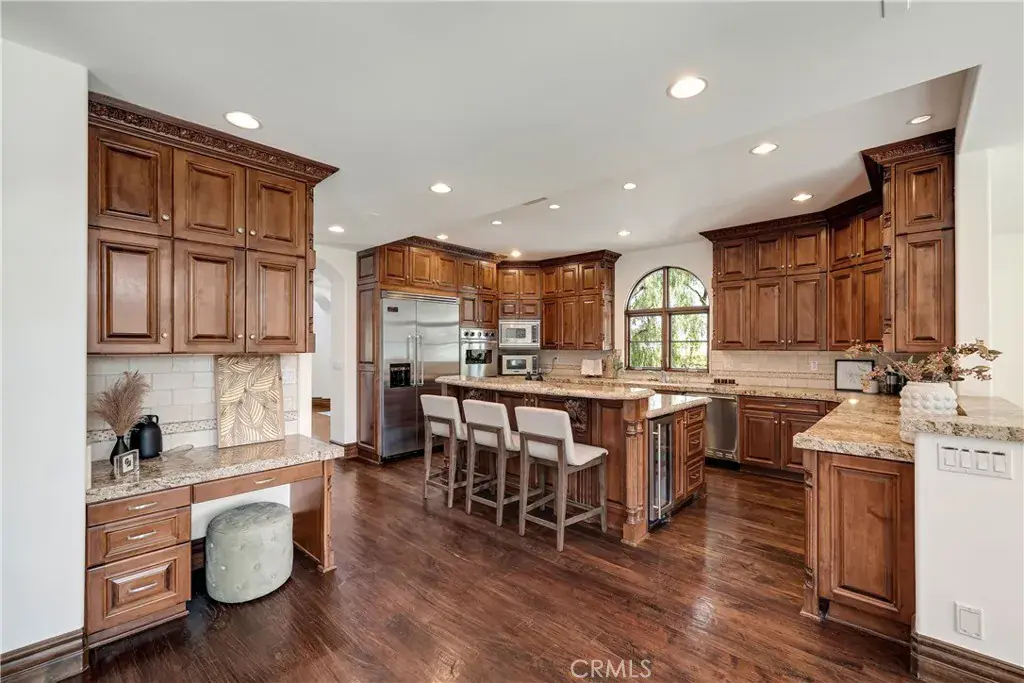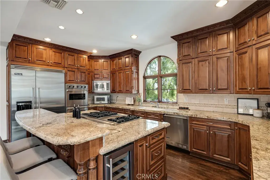 From the moment you enter, rich architectural details set the tone—soaring ceilings, alder wood coffered accents, and a limestone fireplace anchor the formal living room. The chef’s kitchen features Viking appliances, custom cabinetry, and beveled granite countertops, opening to a sunny breakfast nook and expansive family room.