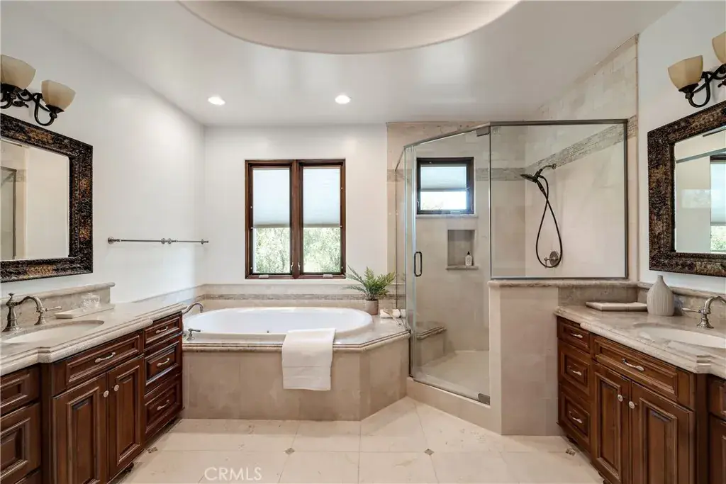 The expansive primary suite includes a spa-like bath and walk-in closet, while each secondary bedroom enjoys its own private balcony or patio via French doors. A 3-car garage with built-in storage and a workshop area adds function to the elegant form.