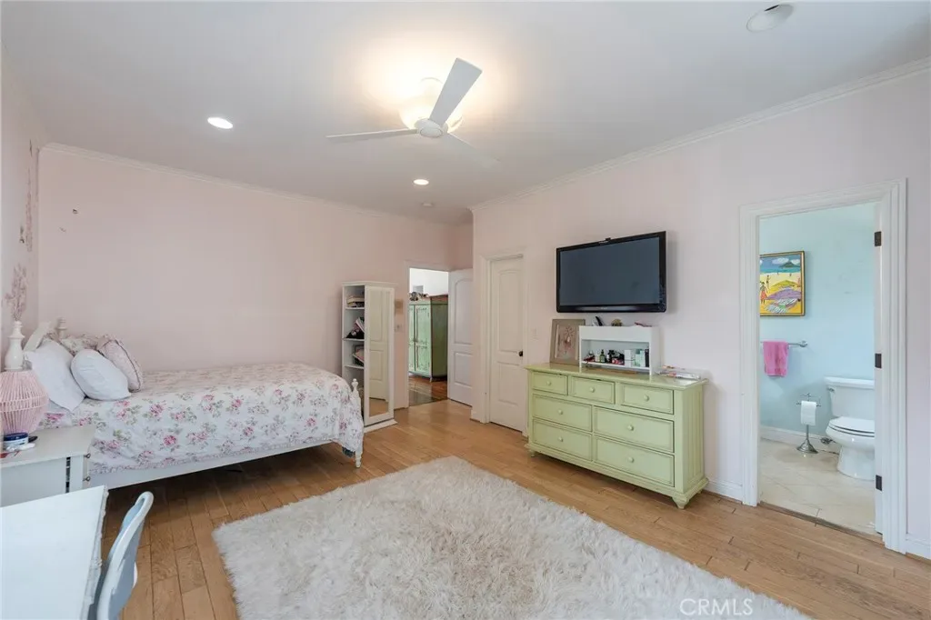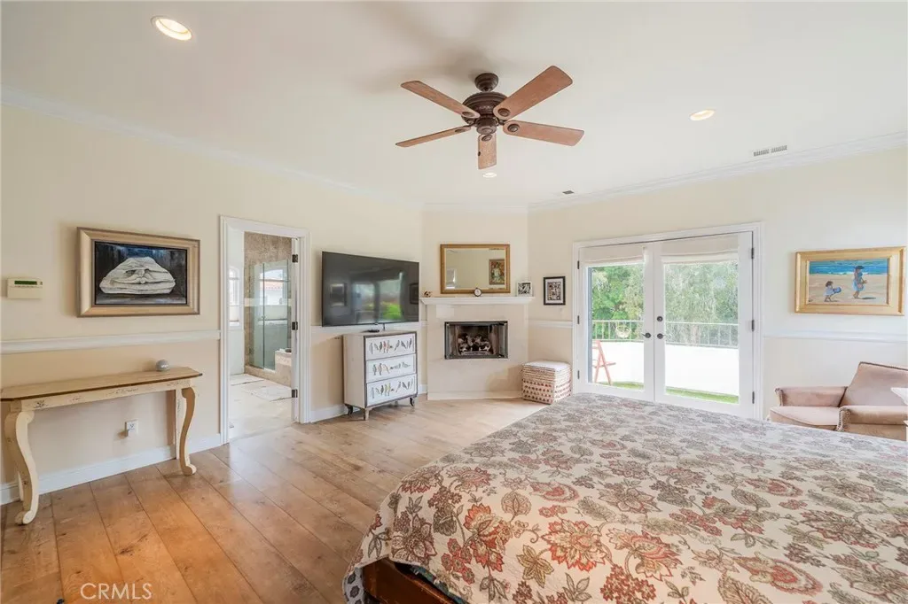The primary suite serves as a private retreat with its own fireplace, while an additional bedroom wing features a convenient Jack-and-Jill layout. A lower-level suite includes a custom office, perfect for work or creative pursuits. Throughout the home, distressed wood floors, Venetian plaster walls, and detailed crown molding add warmth and character.