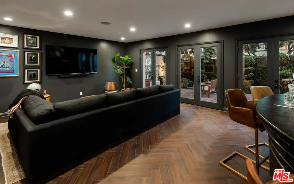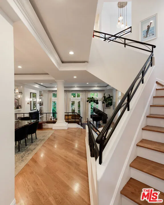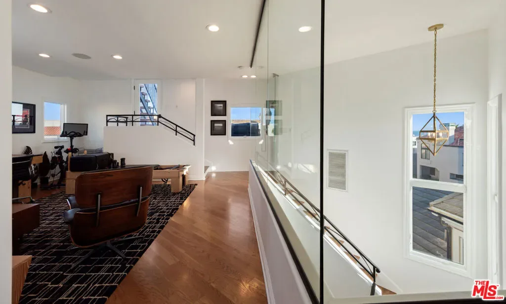 Step into a beautifully designed living area with soaring ceilings, expansive windows, and real oak hardwood floors throughout. Floor to ceiling French doors fill the home with natural light and open to lush greenery, creating seamless indoor-outdoor flow. Architectural ceilings with recessed lighting, a fully integrated LED lighting system, crown molding, and stately columns add timeless character. The open split-level layout is enhanced by custom wrought-iron railings. A Lutron RadioRA smart lighting system provides effortless ambiance control, and a built-in Sonos sound system delivers immersive audio throughout. The generous living space easily accommodates a grand piano and multiple seating areas, making it ideal for entertaining or everyday living. Neutral tones and curated finishes complete the refined design. The chef’s kitchen blends modern style with warm natural textures. A dramatic waterfall edge island crafted from Taj Mahal quartzite offers ample prep space, integrated storage, and seating. Custom walnut cabinetry extends to the ceiling for a sleek built-in look and maximum storage. Additional Caesarstone surfaces complement the quartzite, paired with a full height stone backsplash and minimalist hardware. A professional grade Wolf range and Sub-Zero refrigerator provide premium performance and seamless integration. Matte black pendant lighting adds architectural interest. The oversized island includes an integrated sink with a statement faucet and luxury fixtures. Adjacent floor to ceiling French doors and a Juliet balcony bring in abundant natural light. The spa inspired primary bathroom features a floating dual sink vanity, designer lighting, custom tile flooring, a freestanding soaking tub, and a glass enclosed walk-in shower with Brizo fixtures. Marble surfaces and designer tile selections create a serene retreat. Bathrooms throughout the home are predominantly finished in marble for cohesive luxury. Each generously sized bedroom includes its own en-suite, appointed with marble finishes and designer tile for a refined and cohesive look. A garage level guest suite includes a spacious living area, versatile bonus space, and a stylish bar overlooking the patio, offering flexible living and entertaining options. Crowning the top is a double decker rooftop capturing panoramic ocean, city skyline, and mountain views. Ideal for entertaining, sunset lounging, or morning coffee. Spanning four levels with a private 4-stop elevator, designer finishes, integrated smart home features, fully integrated LED lighting, and discreet home protection, this residence delivers exceptional coastal city living. Located just moments from boutique shopping, restaurants, and the sand, the home also benefits from 24-hour security patrol for added peace of mind.