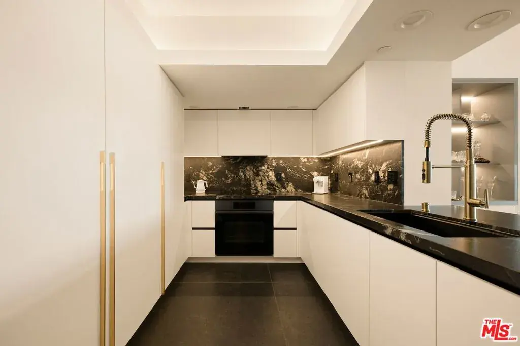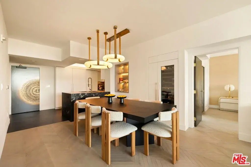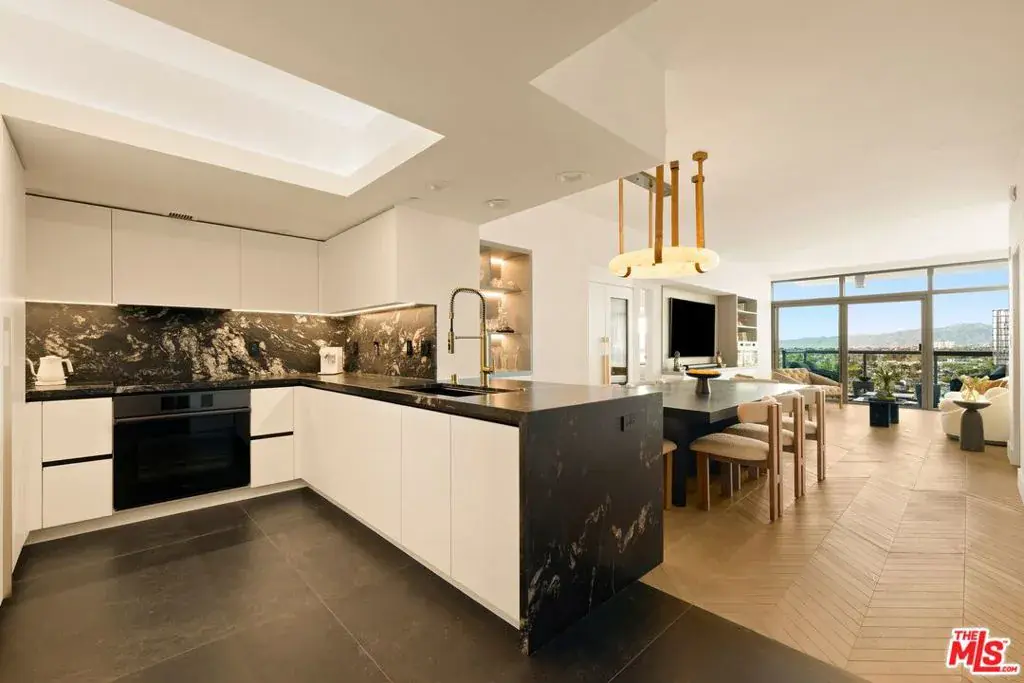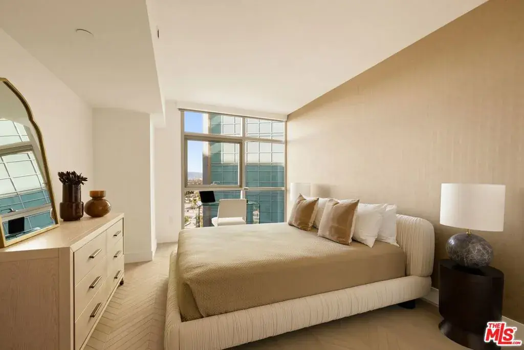 Impeccably designed and perched on the tenth floor of the exclusive Azzurra, this 2-bedroom, 2.5-bath residence showcases breathtaking views of the Marina and Santa Monica Mountains from every room. The interiors are defined by chevron Zanzibar European oak flooring, custom Liquid Metal doors with bespoke pulls, and curated finishes throughout. Luxe Phillip Jeffries wallcoverings in silk, linen, and vinyl snakeskin add depth and texture, while Lutron electronic shades and outlets provide effortless modern convenience. The sleek kitchen is outfitted with Dacor luxury appliances and a custom microwave drawer oven, flowing seamlessly into a spacious dining area highlighted by a custom alabaster and leather chandelier, a built-in bar, and an integrated Miele wine cooler – perfect for entertaining. The sun-filled living room features custom built-ins, an electric fireplace, and statement lighting, with glass doors opening to a private balcony for a seamless indoor-outdoor experience. A refined powder room completes the main living spaces. The serene primary suite offers space for a dedicated office nook overlooking the views and a hotel-style en-suite bath with a dual-sink vanity, glass-enclosed shower, soaking tub, and boutique-like closet. An equally sophisticated guest suite, in-unit laundry, and meticulous attention to detail throughout complete the home. Residents of Azzurra enjoy full-service, hotel-style living with 24/7 concierge, a resort-style pool and spa, a state-of-the-art indoor/outdoor fitness center, and an exceptional collection of amenities – all set in a premier Westside location.