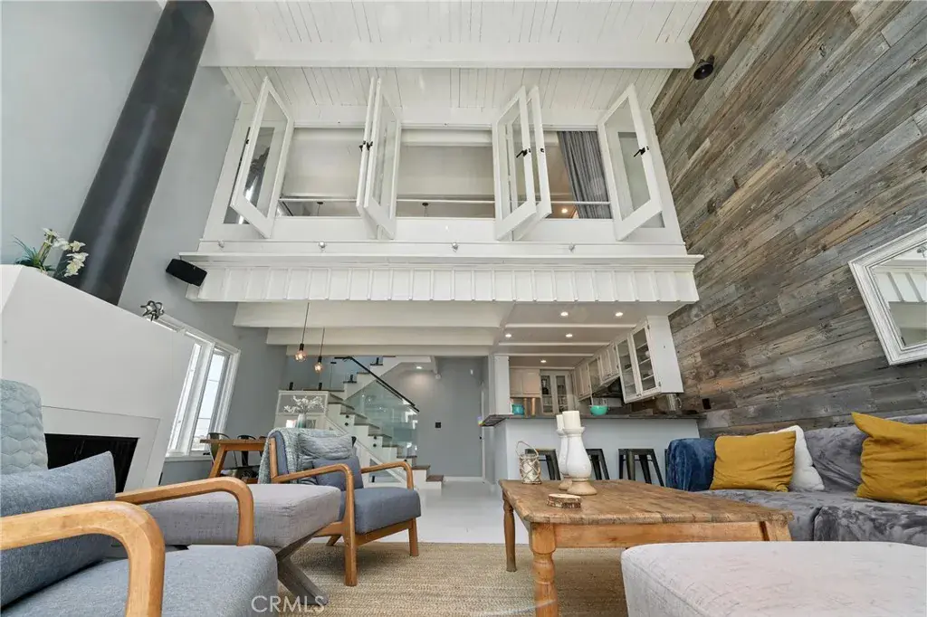 The first level features two spacious bedrooms, a full bathroom, a powder room for guests, and a private balcony—ideal for relaxing or reading. The main level boasts an open-concept living space with soaring ceilings, a skylight with retractable blinds, a cozy fireplace, a custom wood accent wall, and abundant natural light. The upgraded kitchen includes stainless steel appliances and a seamless flow perfect for entertaining.