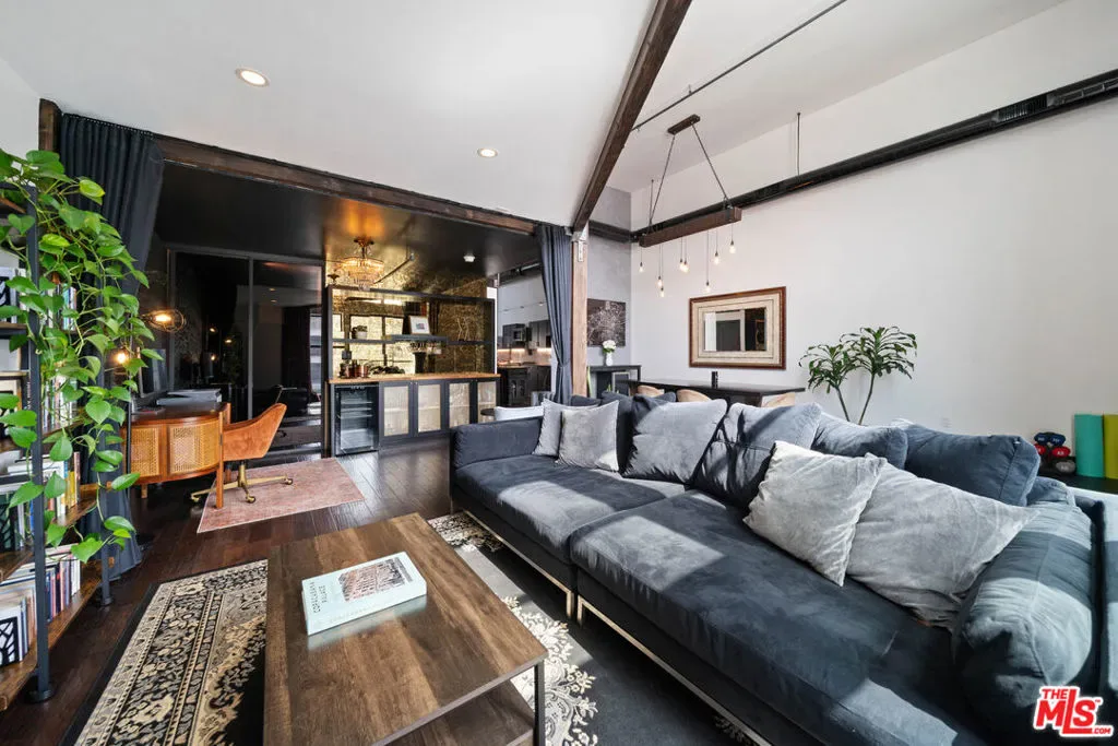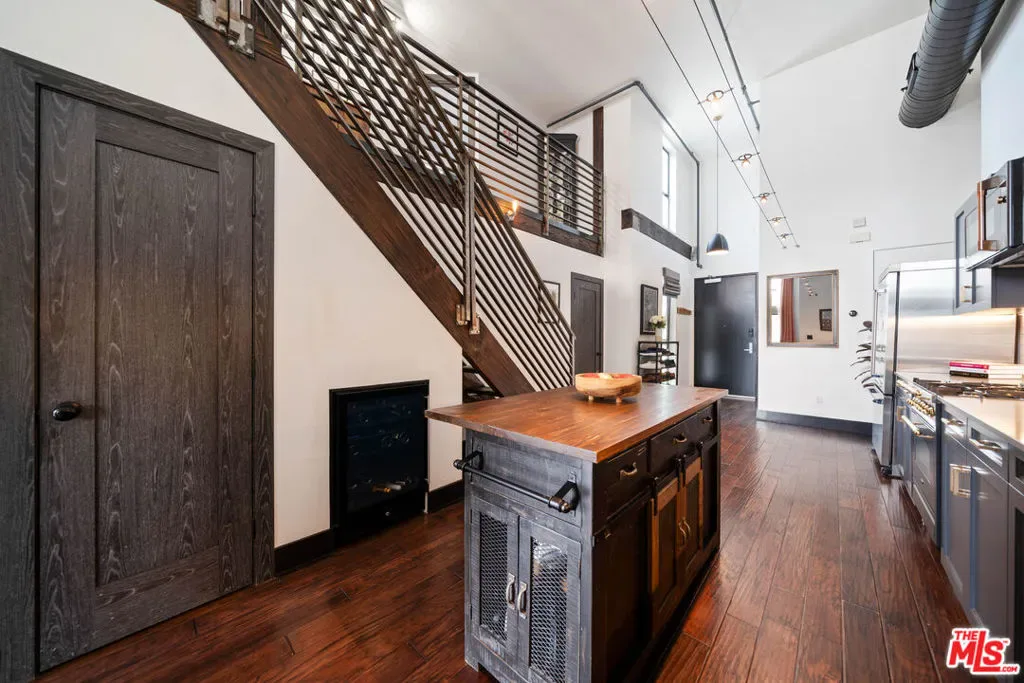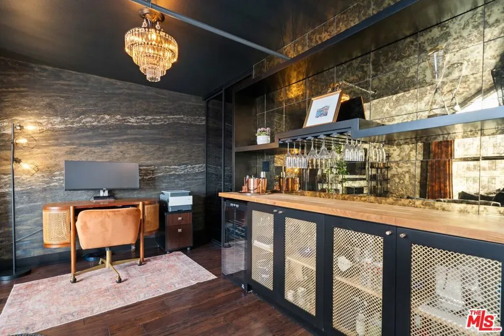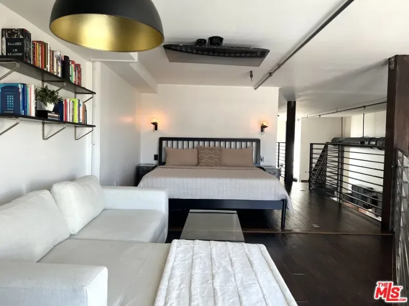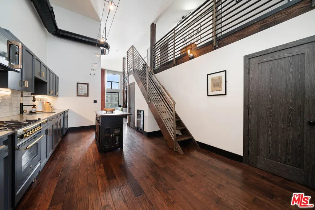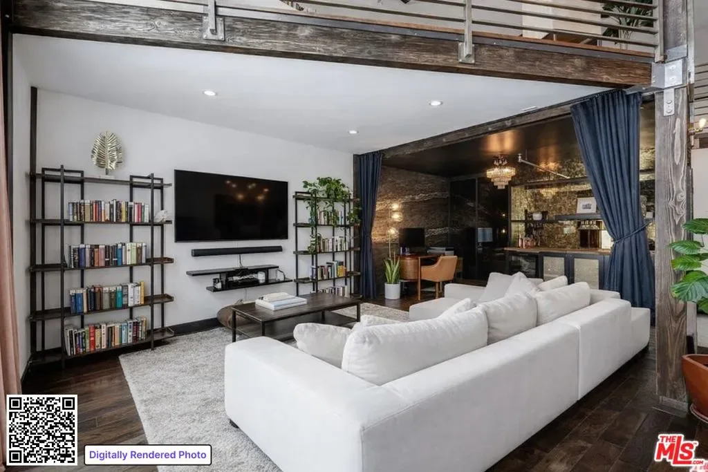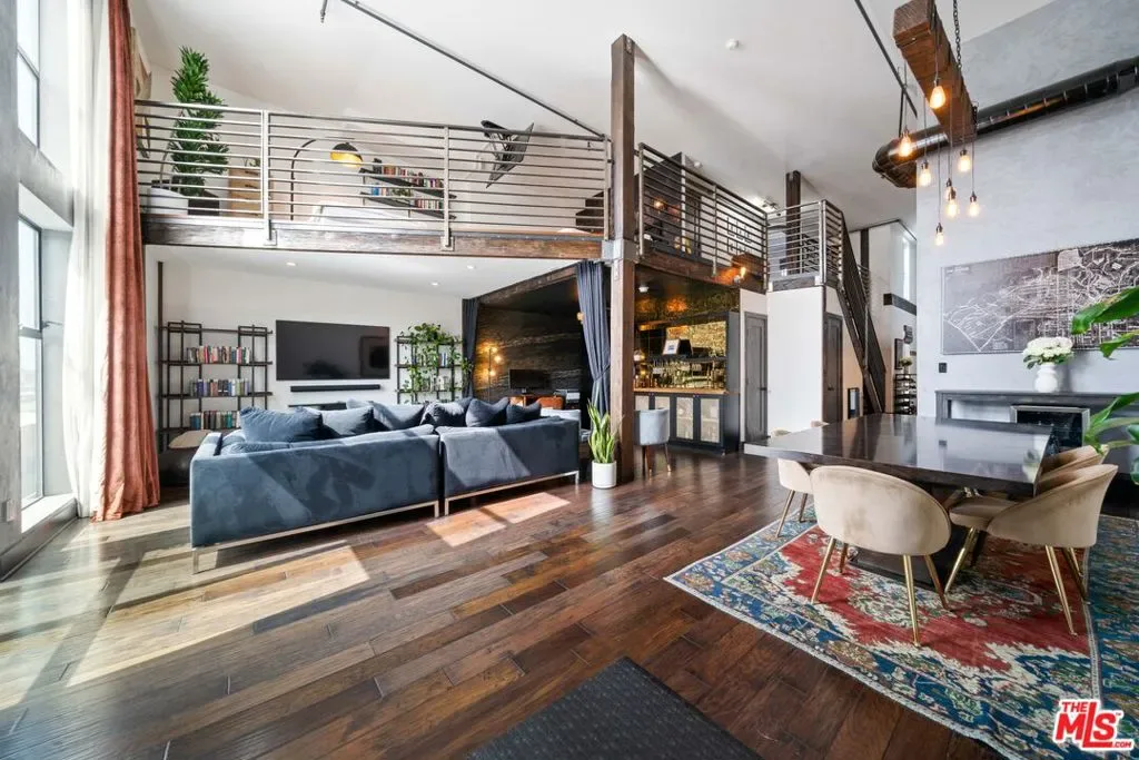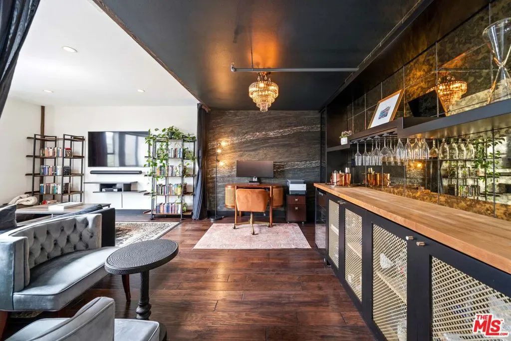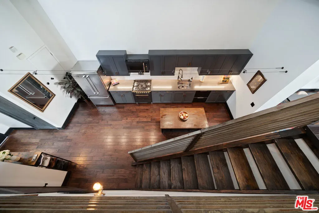 If you enjoy loft living, welcome to this stunning, remodeled top-floor loft, a true entertainer’s dream tucked into the Marina’s most dynamic and creative streets. Thoughtfully curated with high-end finishes and smart design, this condo blends dramatic architecture with modern comfort. Soaring 17+ foot ceilings and a wall of floor-to-ceiling windows flood the space with loads of natural light, framed by a custom motorized drapery that adds a bold designer touch. The open-concept layout includes a custom speakeasy-style bar, perfect for unwinding after a long day or kicking off an evening of entertainment or relaxation. The kitchen is a showpiece, featuring quartz countertops and a suite of top-tier appliances including a Viking Pro refrigerator, Ilve range, and Fisher & Paykel dishwasher. Both bathrooms are elevated with copper sinks, marble counters, custom-tiled showers, smart mirror lighting, and Toto bidet toilets. A private guest bedroom with en-suite bath is located on the main level, while the upstairs mezzanine hosts a spacious primary suite with a walk-in closet, room for a home office, and serene architectural views. Additional highlights include new HVAC 2024, custom cabinetry and doors, upgraded lighting, EV charging, guest parking, and a community rooftop deck with city views. Custom furnishings are negotiable with sale. Some images have been digitally altered to reflect lighter furniture.