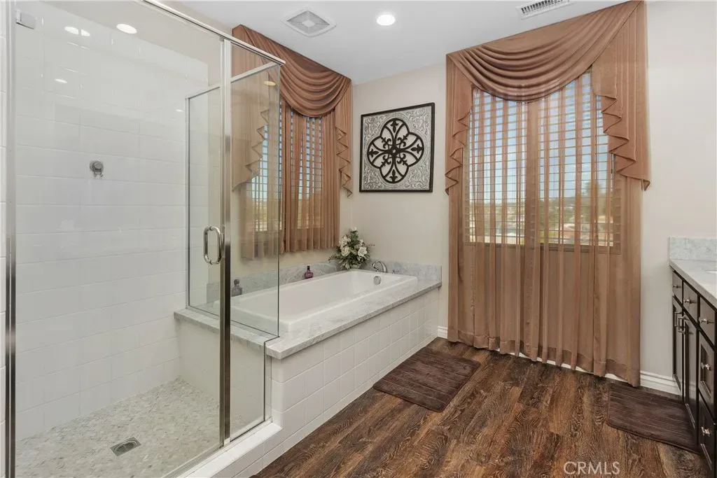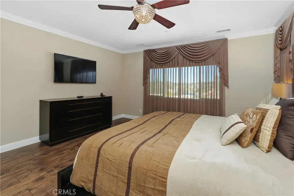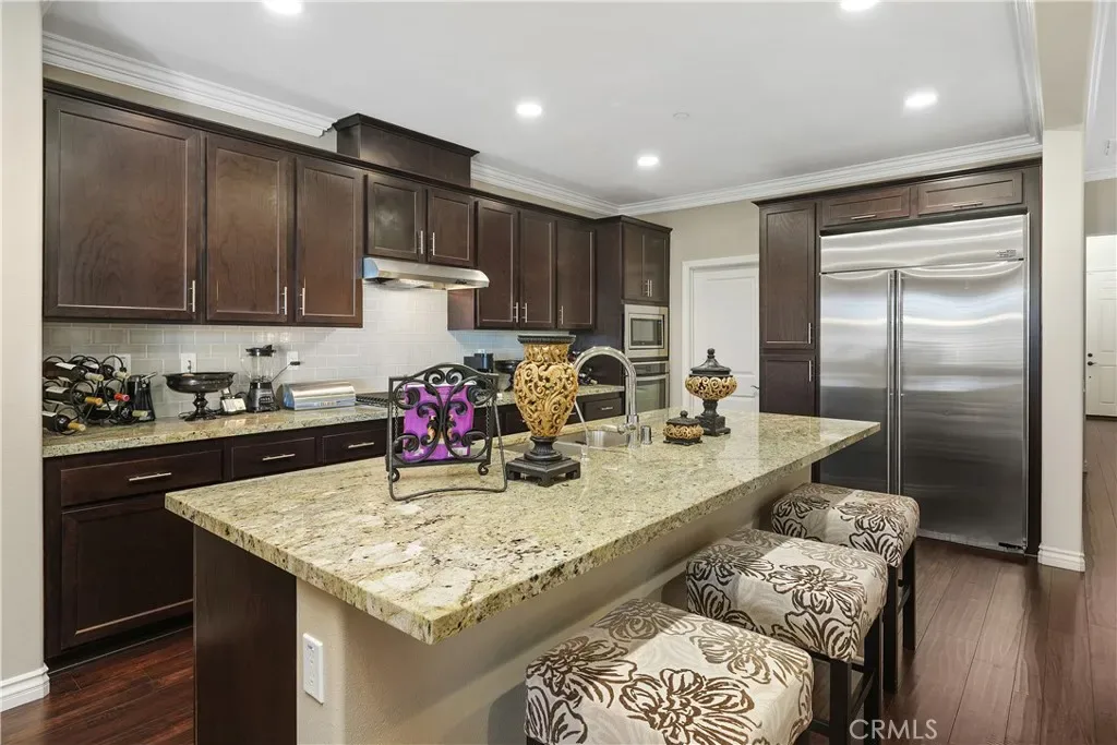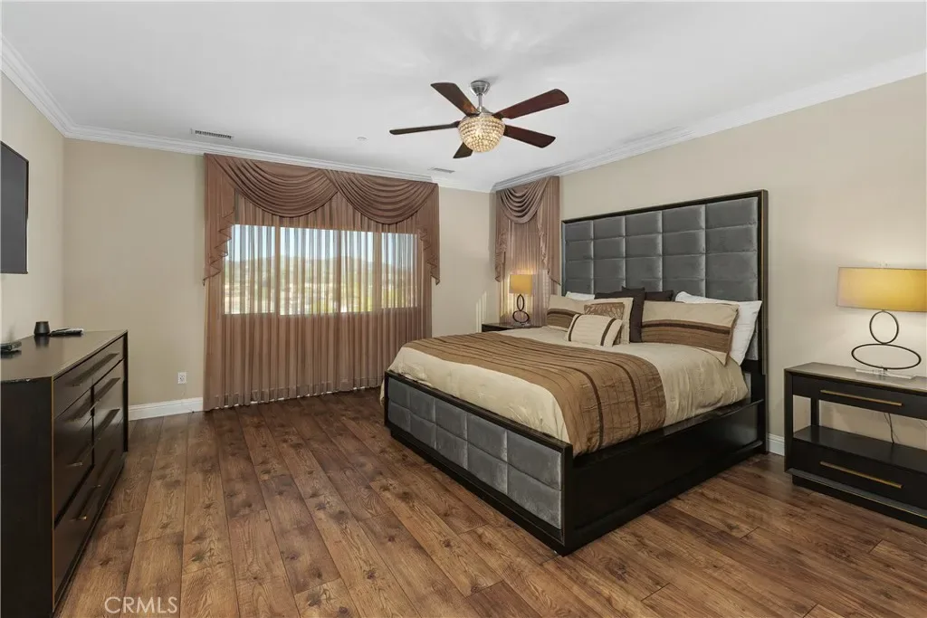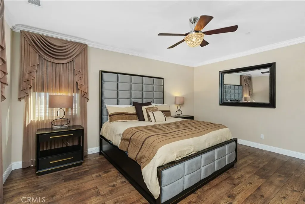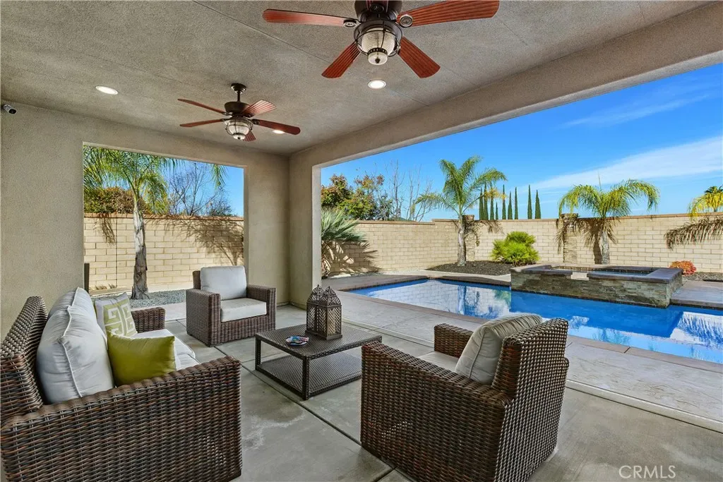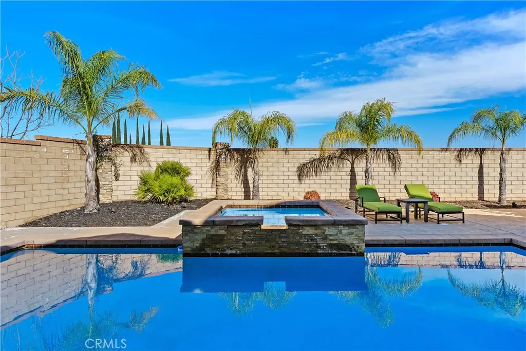 Exceptional 5-bedroom, 4-bath single-family home offering approx. 3,486 sq ft of well-designed living space. This thoughtfully maintained residence features wood flooring, custom window treatments, and a flexible open floor plan ideal for everyday living and entertaining. The gourmet kitchen includes espresso cabinetry, granite countertops, center island, stainless steel appliances, and designer lighting, opening to the great room and formal dining area. Spacious bedrooms, four full baths, interior laundry, and ample storage provide comfort and functionality. The private backyard offers resort-style amenities, including a pool and elevated spa, tropical landscaping, built-in BBQ island with bar seating, and a large covered patio with ceiling fans—perfect for indoor-outdoor living. A refined blend of comfort, privacy, and lifestyle appeal.
