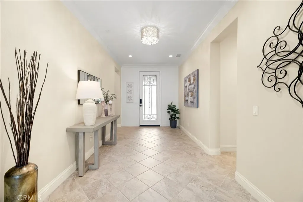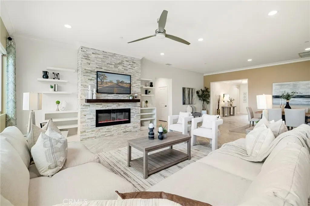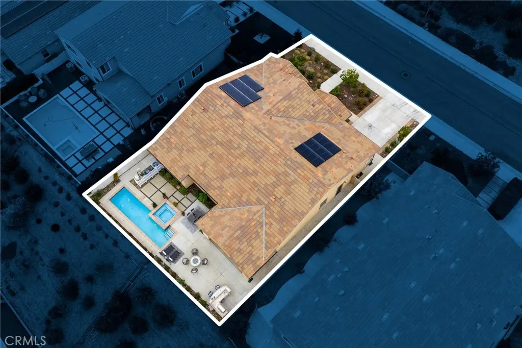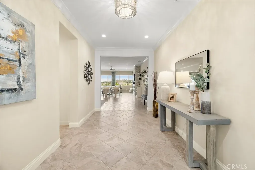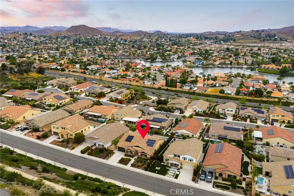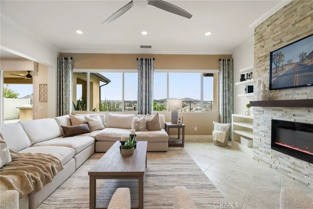 A luxury pool home awaits you in the gated community of Province at Audie Murphy Ranch, in Menifee, boasting hundreds of thousands in designer upgrades and breathtaking mountain views. This one-of-a-kind home offers 4 bedrooms, 2.5 baths, an office, owned solar plus Tesla battery, a 30′ x 8′ lap pool, a 7′ square 10-person spa, Govee lights and extra electrical throughout the home. The exterior of this ranch style property boasts drought tolerant landscaping and custom steps up to the quaint porch overlooking the hillside. A beautiful custom glass front door and retractable screen greet you into the home offering tall ceilings, tile floors, custom paint, recessed lighting, crown molding, custom window coverings throughout and a highly desirable floor plan. Off the entrance of the 3100 sqft property are two large secondary bedrooms with walk-in closets, one with a built-in bookshelf which share a secondary bath featuring dual sinks and a shower tub combo, that sits across from a powder bath. A junior suite offers an extra-large bedroom with a massive walk-in closet, built in bookshelves and would be the perfect game room. The Great Room features a custom stone fireplace with heat protected floating mantel, built-in open cabinets and floating shelves and large view windows. The dining room offers a quiet cool whole house fan. The gourmet kitchen features granite counters, subway tile backsplash, an eat-up island, stainless steel appliances, wine fridge, wine rack and large walk-in pantry with extra shelves built-in. Behind the kitchen is an open office boasting a shiplap wall, built-in bookcase and phone-controlled ceiling fan. The butler’s pantry is upgraded with glass front cabinets across from the 3-car tandem garage offering a custom work bench, 120 and 210 capabilities. The laundry room boasts a wash sink, folding area and tons of storage! Just off the Great Room is the Primary Bedroom with custom paint, an attached bath boasting a walk-in shower, soaking tub, dual vanity, built in linen area and large walk-in closet with premium built-in organization. The entertainers yard boasts a large CA Room with recessed lighting, ceiling fan, wood wall for privacy, gas fire pit, built-in BBQ with sink and fridge, solar activated lighting, cumquat and lemon trees. The Community features pools, spas, sports courts, club house, trails, skate park, Elementary and Middle schools & is between the 15 & 215 fwys, close to shopping & the wineries!