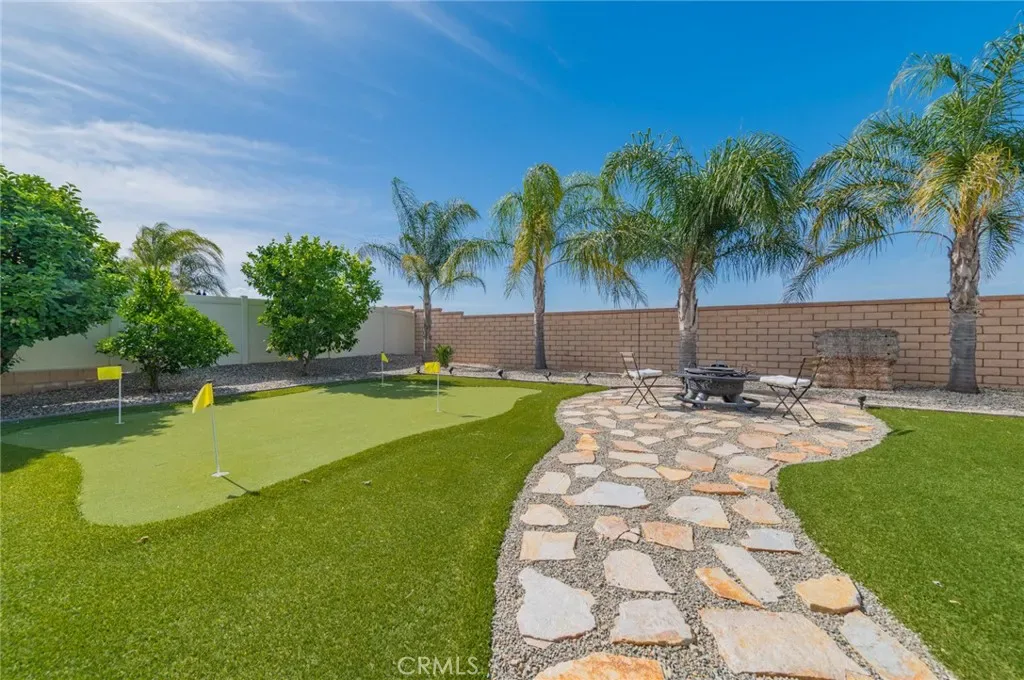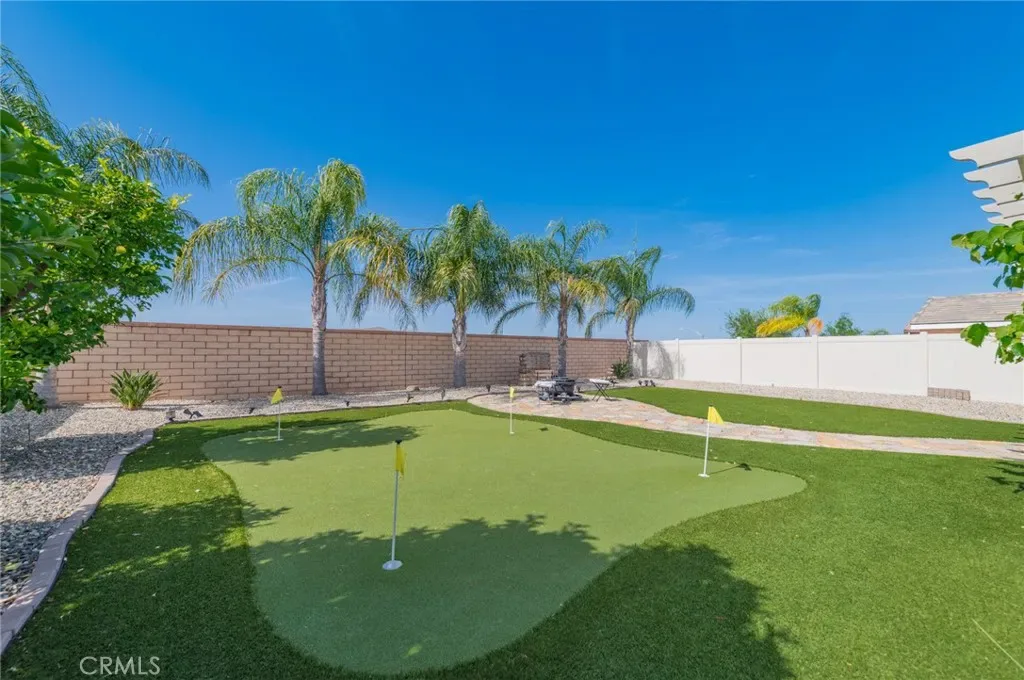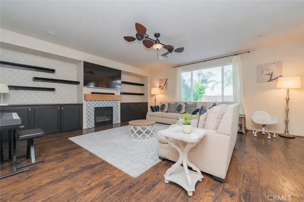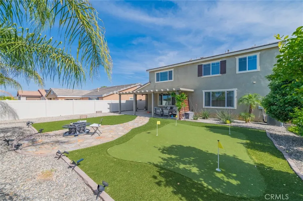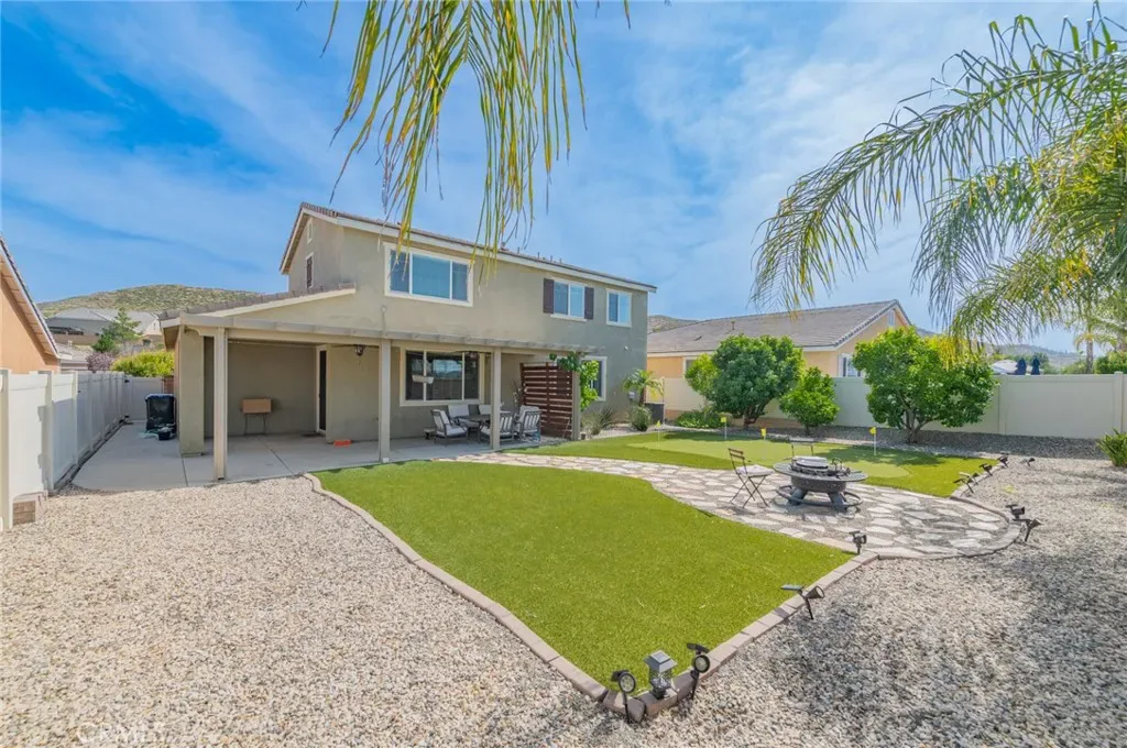 Former model home located at the end of a quiet cul-de-sac in Audie Murphy Ranch, Menifee, offering 5 bedrooms, 3 bathrooms, plus a bonus room office/den, with approximately 3,000 sq ft of upgraded living space on a 7,405 sq ft lot. The home features tall ceilings, fresh interior paint, and abundant natural light throughout. The main floor includes a flexible office/den space, a bedroom, and a full bathroom with tub/shower combo and custom barn door, ideal for guests or multigenerational living. The family room is appointed with laminate flooring, a custom fireplace with wood mantel, built-ins, and designer finishes. The open-concept kitchen boasts a large quartz island, extensive cabinetry, stainless steel appliances, a dining nook, walk-in pantry, and mudroom with direct access to the 3-car garage. Upstairs offers three spacious secondary bedrooms with mountain views and ceiling fans, a full secondary bathroom, and a dedicated laundry room with sink and storage. The primary suite features scenic mountain views, dual walk-in closets, dual vanities, a soaking tub, and separate shower. Additional upgrades include ceiling fans throughout, dimmer switches, motion-sensor lighting in bathrooms, and ample built-in and attic storage. The backyard offers privacy with no rear neighbors and is designed for entertaining, featuring a California room, Alumawood patio cover, flagstone hardscape, turf, fruit trees, and a private putting green, with plenty of space for a pool. Community amenities include pool, spa, sports courts, and clubhouse, with convenient access to the 15 and 215 freeways and close proximity to shopping, dining, and parks.