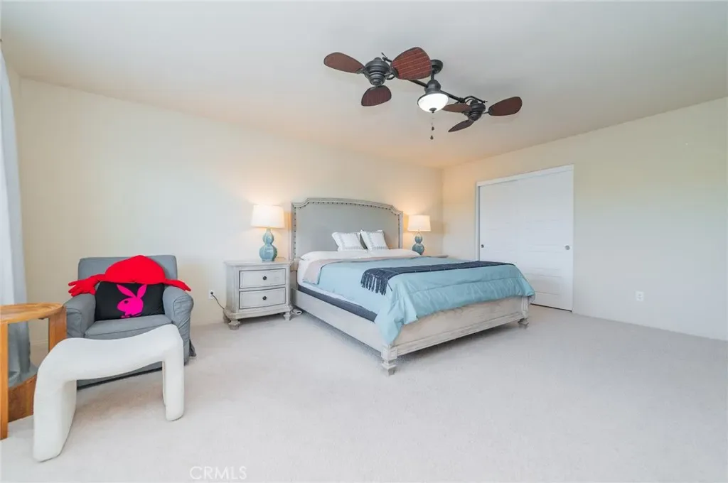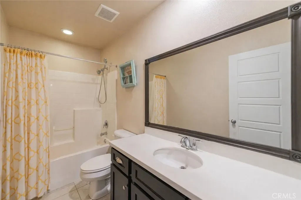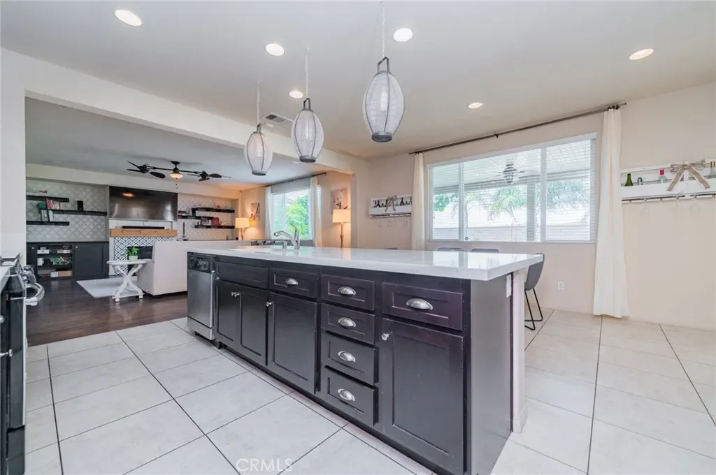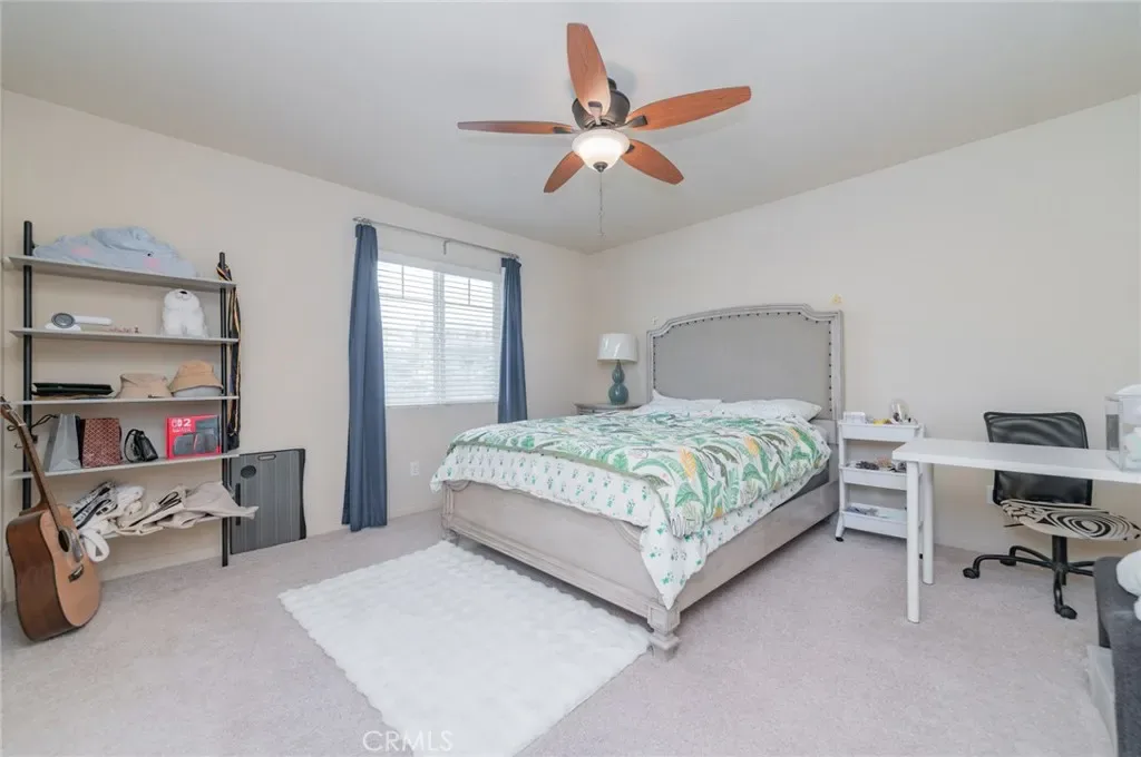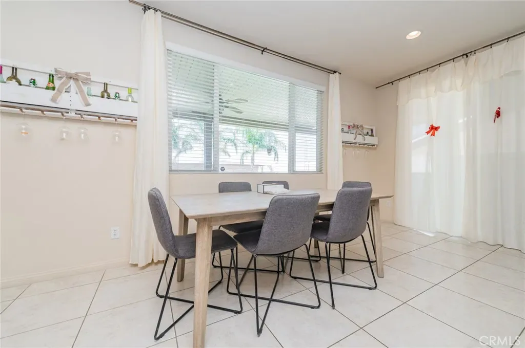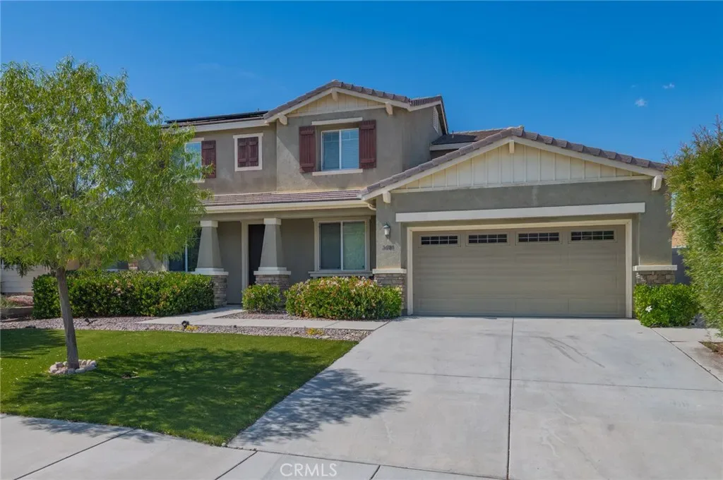 Former model home located at the end of a quiet cul-de-sac in Audie Murphy Ranch, Menifee, offering 5 bedrooms, 3 bathrooms, plus a bonus room office/den, with approximately 3,000 sq ft of upgraded living space on a 7,405 sq ft lot. The home features tall ceilings, fresh interior paint, and abundant natural light throughout. The main floor includes a flexible office/den space, a bedroom, and a full bathroom with tub/shower combo and custom barn door, ideal for guests or multigenerational living. The family room is appointed with laminate flooring, a custom fireplace with wood mantel, built-ins, and designer finishes. The open-concept kitchen boasts a large quartz island, extensive cabinetry, stainless steel appliances, a dining nook, walk-in pantry, and mudroom with direct access to the 3-car garage. Upstairs offers three spacious secondary bedrooms with mountain views and ceiling fans, a full secondary bathroom, and a dedicated laundry room with sink and storage. The primary suite features scenic mountain views, dual walk-in closets, dual vanities, a soaking tub, and separate shower. Additional upgrades include ceiling fans throughout, dimmer switches, motion-sensor lighting in bathrooms, and ample built-in and attic storage. The backyard offers privacy with no rear neighbors and is designed for entertaining, featuring a California room, Alumawood patio cover, flagstone hardscape, turf, fruit trees, and a private putting green, with plenty of space for a pool. Community amenities include pool, spa, sports courts, and clubhouse, with convenient access to the 15 and 215 freeways and close proximity to shopping, dining, and parks.