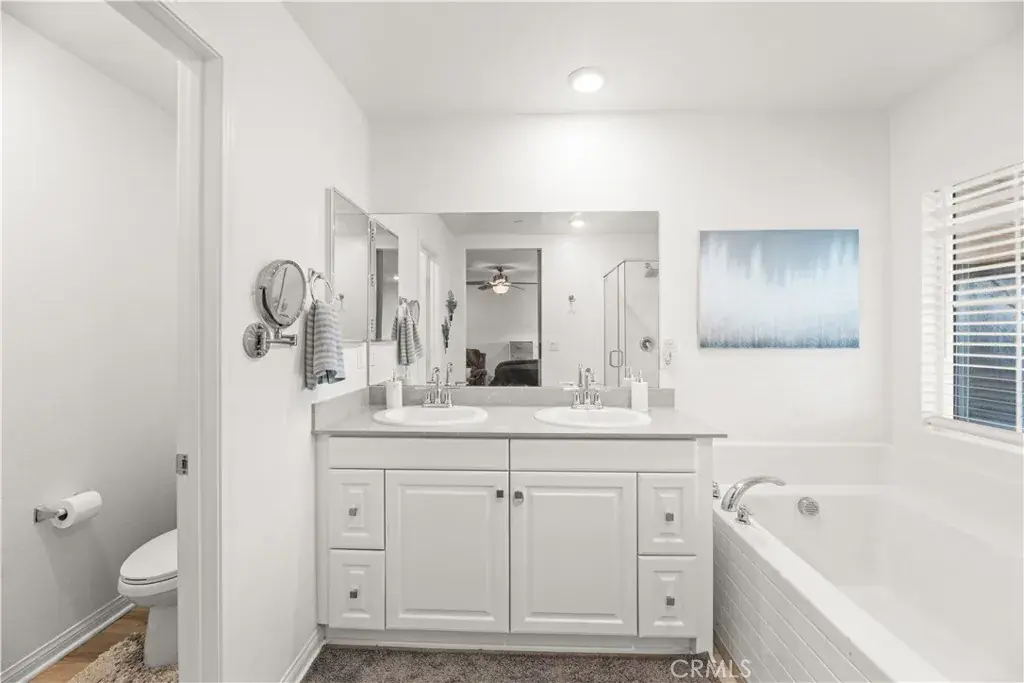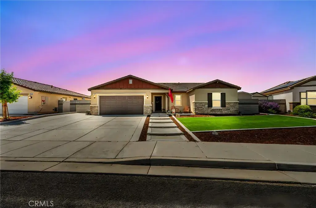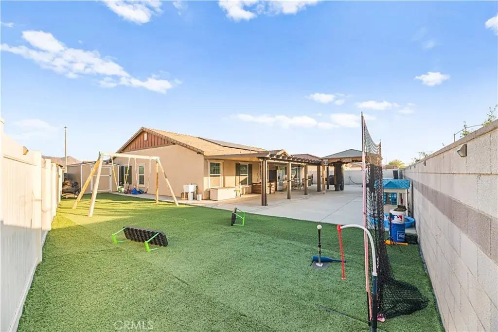 Inside, enjoy a bright and spacious great room that flows seamlessly into a designer kitchen featuring white shaker cabinets, quartz countertops, stainless-steel appliances, and a large center island. The primary suite is a relaxing retreat with dual sinks, quartz vanity, walk-in shower, and generous closet space. Three additional bedrooms provide flexibility for family, guests, or a home office. Step outside to a low-maintenance backyard complete with artificial turf, a large covered patio, concrete entertaining area, and spa—perfect for gatherings or quiet evenings under the stars. VETERANS/ACTIVE DUTY MAY QUALIFY FOR ASSUMING 2.65% INTEREST RATE LOAN.