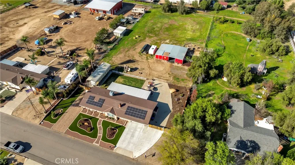 Welcome to this beautifully upgraded single-story home with PAID SOLAR in the highly sought-after J-BAR RANCH COMMUNITY — a rare 1.26-acre HORSE PROPERTY offering comfort, style, & exceptional versatility. This spacious residence features 3 bedrooms PLUS a bonus room & 2 bathrooms, thoughtfully updated throughout. Recent improvements include new laminate flooring, crown molding, fresh interior paint, a new roof with fascia & gutters & a new HVAC system w/updated ducting & insulation. Energy efficiency is enhanced w/paid-for solar, new double-pane windows & new French doors that fill the home w/natural light. The remodeled kitchen is a true centerpiece, showcasing Quartzite countertops, stainless steel appliances, under-cabinet accent lighting & a center island perfect for entertaining. A permanent custom dining table w/a matching Quartzite tabletop creates a cohesive & elegant dining space. The bonus room is ideal for gatherings & features a custom bar complete w/a Quartzite counter & sink. The spacious living room offers warmth & charm w/a wood-burning fireplace & custom mantle — the perfect place to relax & unwind. Partially remodeled bathrooms include new toilets, beautifully tiled showers & new shower door. The Primary bathroom features dual shower fixtures for a luxurious spa-like experience. Also features an oversized, insulated 2-car garage w/additional roll up door that leads to the backyard . Step outside to enjoy the the fully covered back patio, low-maintenance landscaping, enhanced by custom color-stamped walkways. The property also offers dual RV access w/double gates & a large RV carport with hookups — ideal for recreational vehicles, trailers, or guests. Equestrian & hobby amenities abound, including 100% flat, useable lot, a breezeway barn w/three stalls, tack room & a large storage/shop area equipped with water & power. Additional features include a hen house, livestock paddock areas, direct access to the community bridle trails & ample room to build an arena or expand w/additional pastures. This exceptional property combines modern upgrades, rural functionality, refined comfort, low taxes & NO H.O.A — all within a premier community setting.