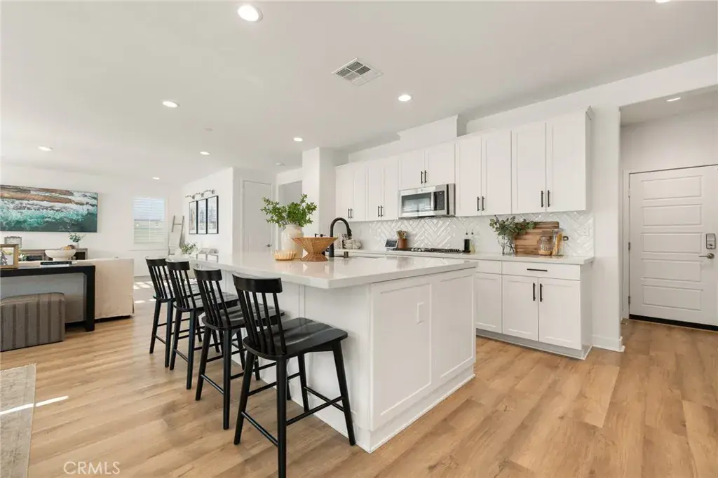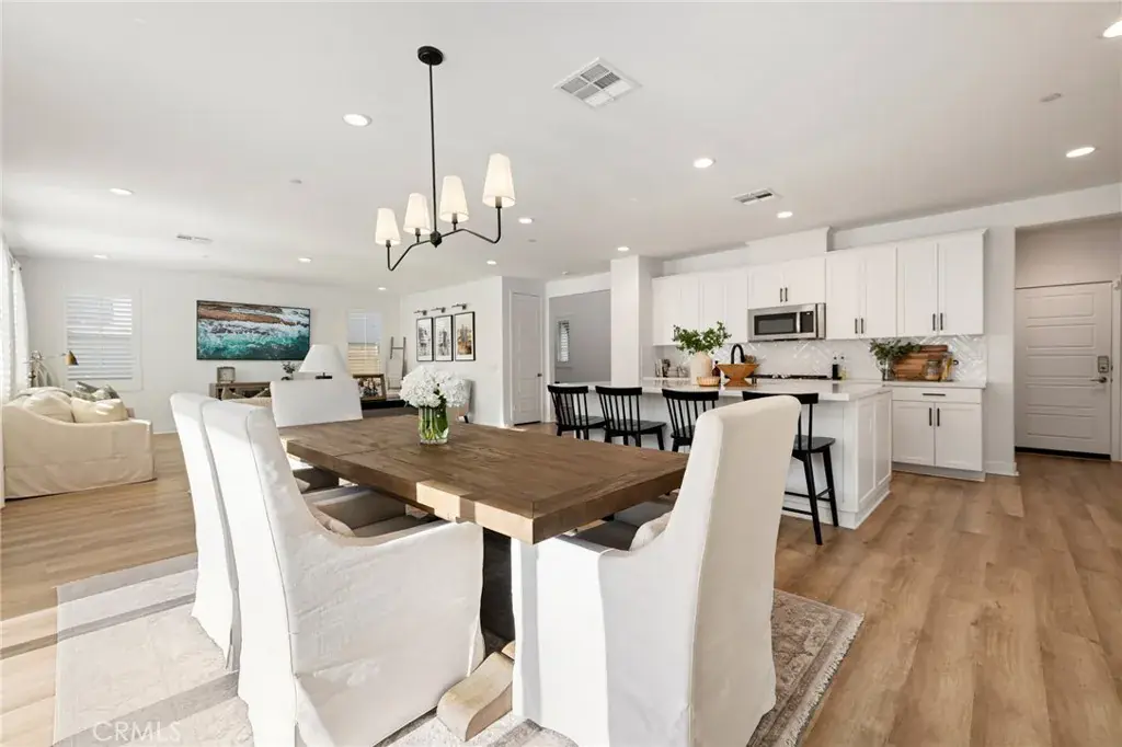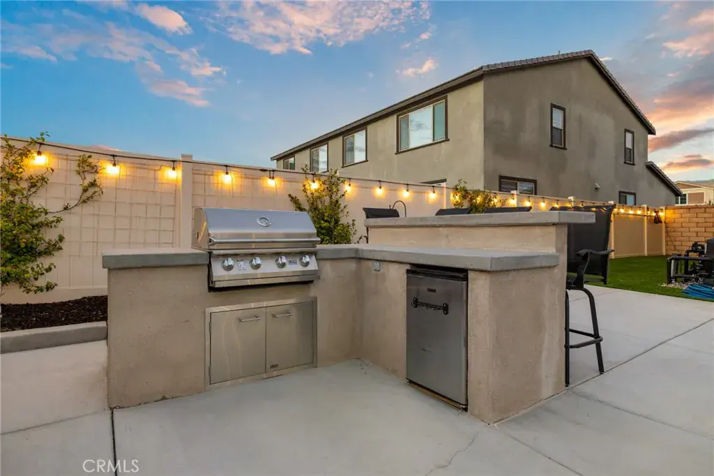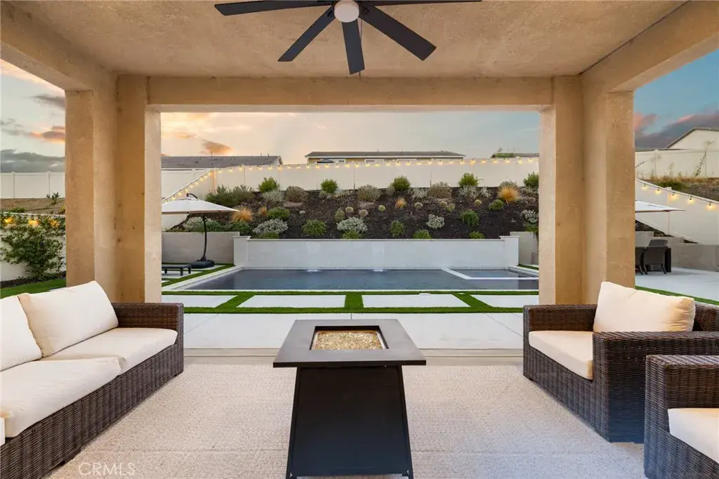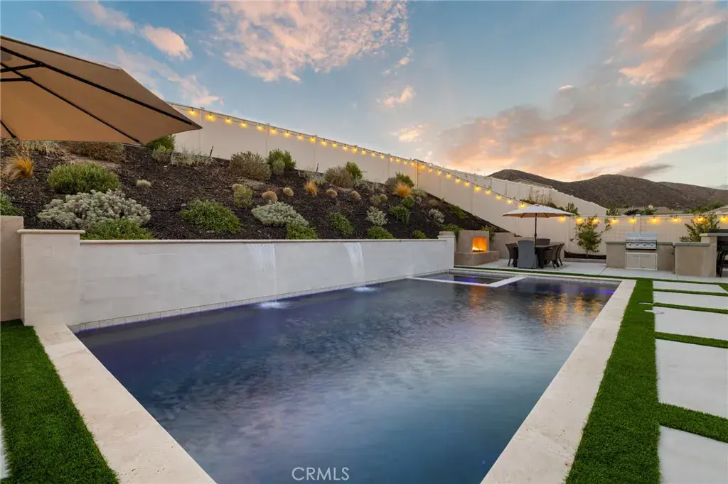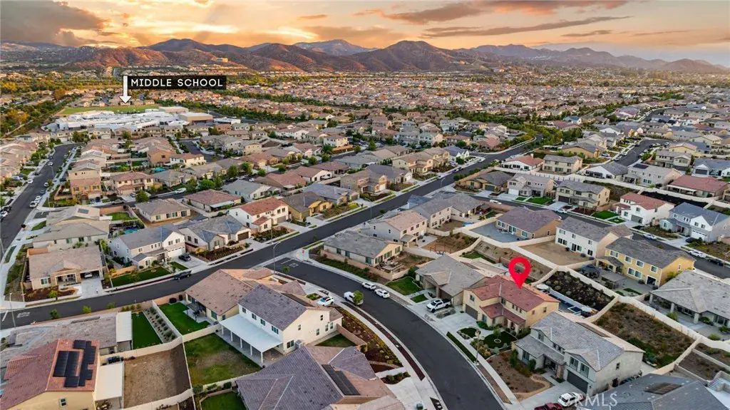 Built in 2022, with over $300,000 in designer upgrades, this pool home blends modern design with timeless elegance, offering 5 bedrooms, 3 baths, and almost 3,400 sqft of living space. This showstopper is located in the highly sought after community of Audie Murphy Ranch in Menifee, on a cul-de-sac with owned solar and a 3-car tandem garage. The properties curb appeal boasts custom concrete stairs, artificial turf, a wide driveway and quaint porch looking to the morning sunrise. As you step inside you are greeted by 30-foot ceilings, a formal foyer, a clean color pallet throughout offering blonde LVP floors, crisp white paint and black finishes. The desirable floorplan features a MAIN FLOOR bedroom with plush carpet and a walk-in closet which is just off the guest bath boasting a single vanity and black framed walk-in shower. The whimsical great room offers tons of natural light and plantation shutters, which are throughout the property. Step through the large dining area you’ll find a custom black chandelier and 12-foot double glass doors. The chef’s kitchen is appointed with quartz counters, herringbone tile backsplash, stainless steel appliances, an extended island, white cabinets offering tons of storage and a custom dry bar across from the large walk-in pantry. The garage offers epoxy floors, and an EV charging station. Also on the main floor is a large flex space perfect for an office, library or 6th bedroom. The grand staircase takes you to the second floor boasting a large loft, built-in cabinets, and oversized laundry room with tons of storage. The three secondary bedrooms are all spacious with custom paint, plush carpet and one featuring a walk-in closet. They share a secondary bath boasting tile floors, dual vanity and tub shower combo. The primary suite offers plenty of space and an attached bath boasting two vanities and a spa super shower with two shower heads, a marble like ceramic tiled shower with honeycomb tiled floors, and a large walk-in closet. The private oasis is appointed with a large CA room, modern stamped concrete with artificial turf surrounding the salt water, pebble tech pool featuring white tile coping and a dual waterfall. The inset spa overlooks the custom-built fireplace, lounge sitting area, built-in BBQ with an eat-up bar and the large side yard perfect for soccer! Community amenities include trails, club house, skate & sport parks, pools & award-winning schools, and is between the 15 and 215 FRWYS.