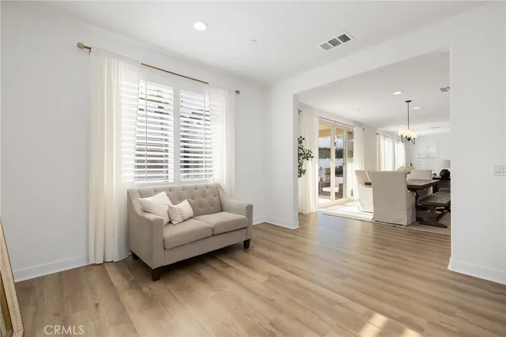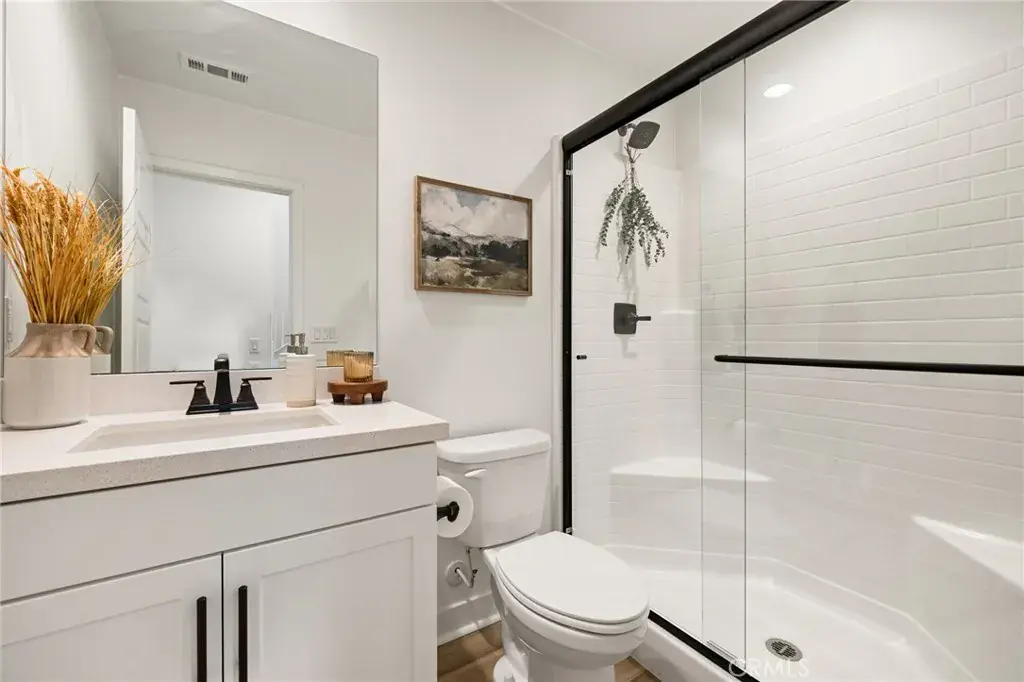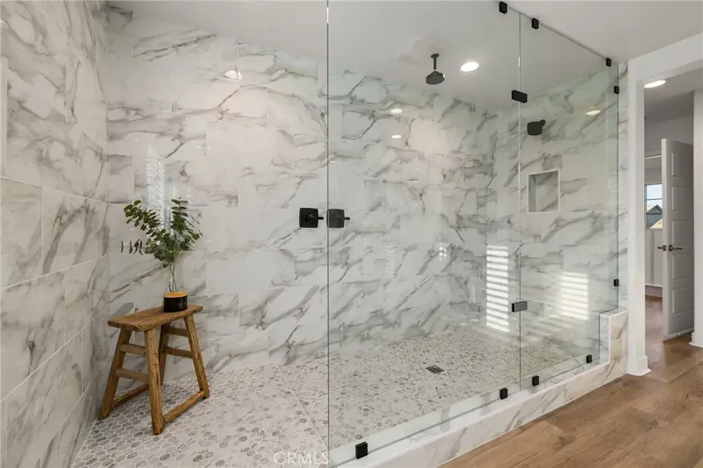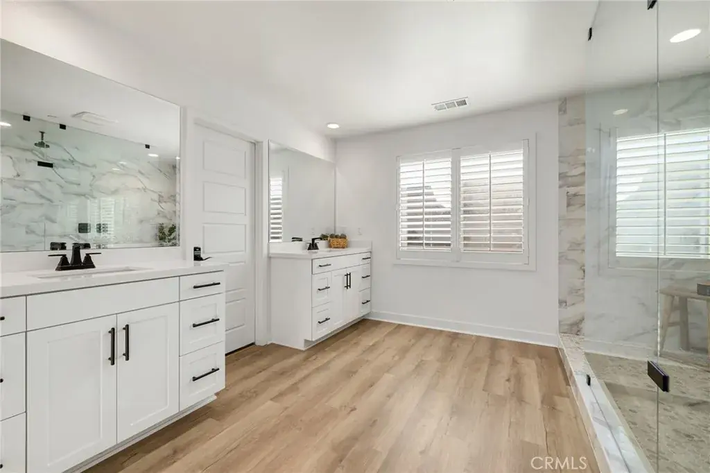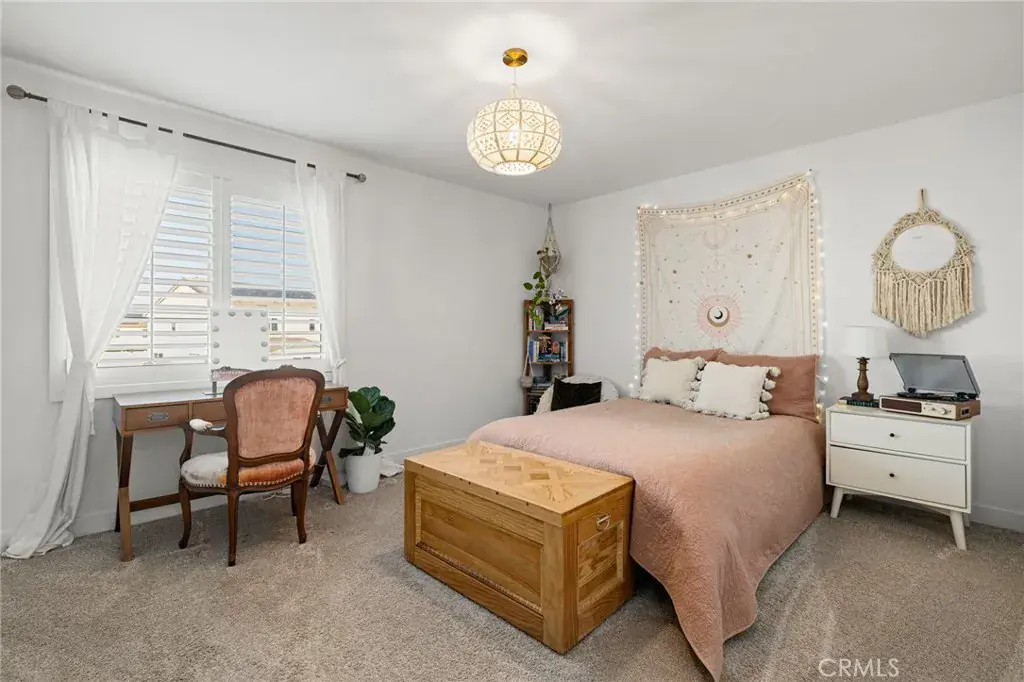 Built in 2022, with over $300,000 in designer upgrades, this pool home blends modern design with timeless elegance, offering 5 bedrooms, 3 baths, and almost 3,400 sqft of living space. This showstopper is located in the highly sought after community of Audie Murphy Ranch in Menifee, on a cul-de-sac with owned solar and a 3-car tandem garage. The properties curb appeal boasts custom concrete stairs, artificial turf, a wide driveway and quaint porch looking to the morning sunrise. As you step inside you are greeted by 30-foot ceilings, a formal foyer, a clean color pallet throughout offering blonde LVP floors, crisp white paint and black finishes. The desirable floorplan features a MAIN FLOOR bedroom with plush carpet and a walk-in closet which is just off the guest bath boasting a single vanity and black framed walk-in shower. The whimsical great room offers tons of natural light and plantation shutters, which are throughout the property. Step through the large dining area you’ll find a custom black chandelier and 12-foot double glass doors. The chef’s kitchen is appointed with quartz counters, herringbone tile backsplash, stainless steel appliances, an extended island, white cabinets offering tons of storage and a custom dry bar across from the large walk-in pantry. The garage offers epoxy floors, and an EV charging station. Also on the main floor is a large flex space perfect for an office, library or 6th bedroom. The grand staircase takes you to the second floor boasting a large loft, built-in cabinets, and oversized laundry room with tons of storage. The three secondary bedrooms are all spacious with custom paint, plush carpet and one featuring a walk-in closet. They share a secondary bath boasting tile floors, dual vanity and tub shower combo. The primary suite offers plenty of space and an attached bath boasting two vanities and a spa super shower with two shower heads, a marble like ceramic tiled shower with honeycomb tiled floors, and a large walk-in closet. The private oasis is appointed with a large CA room, modern stamped concrete with artificial turf surrounding the salt water, pebble tech pool featuring white tile coping and a dual waterfall. The inset spa overlooks the custom-built fireplace, lounge sitting area, built-in BBQ with an eat-up bar and the large side yard perfect for soccer! Community amenities include trails, club house, skate & sport parks, pools & award-winning schools, and is between the 15 and 215 FRWYS.