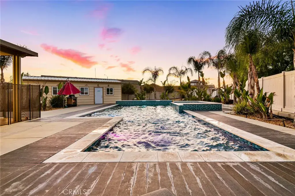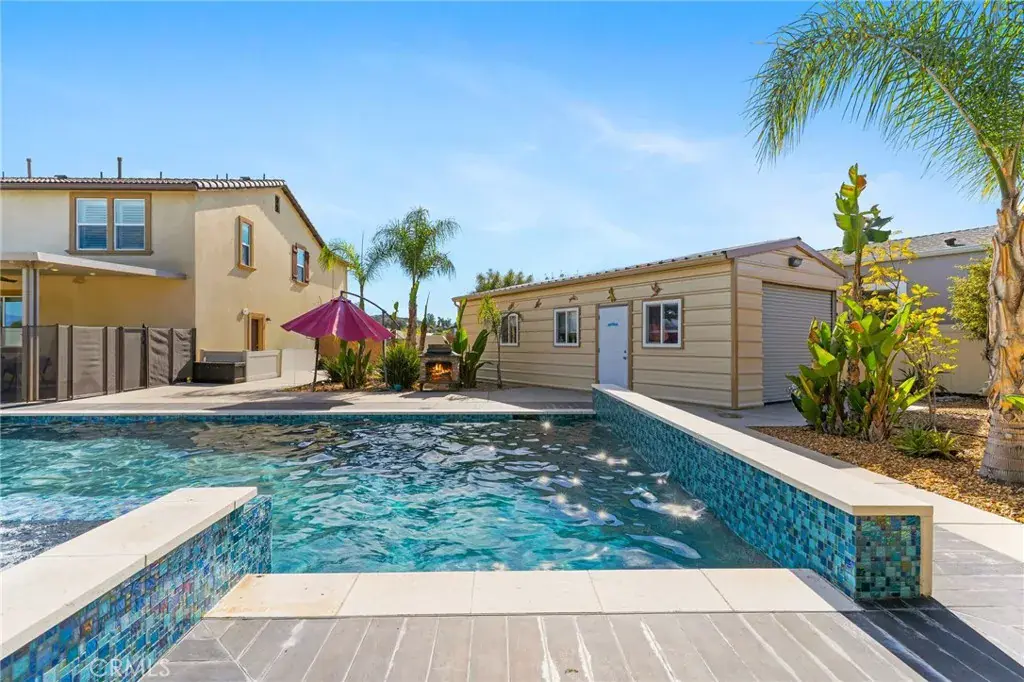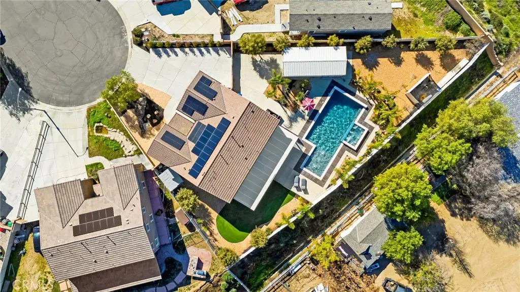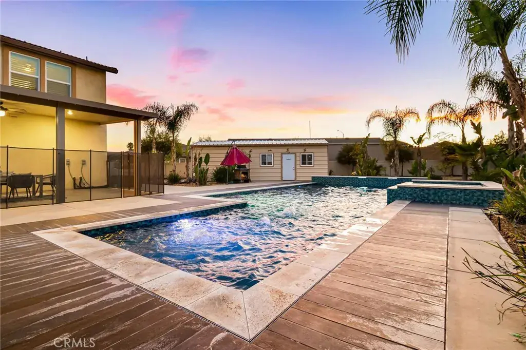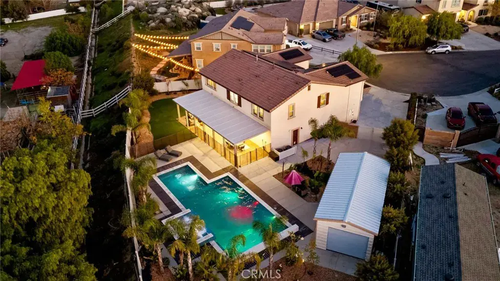 Welcome to 30381 Canyon Point Circle, a beautifully updated residence located in the prestigious Boulder Estates community of Menifee, offering no HOA, generous lot features, and a true indoor-outdoor lifestyle. This 5-bedroom, 4.5-bath, 3,653 sq ft home impresses from the moment you enter with soaring ceilings, an open balcony overlook, and a tastefully designed staircase that sets the tone for the rest of the home. The interior has been freshly repainted, elevating the already bright, move-in-ready feel throughout. The main level features a full downstairs bedroom suite with a walk-in closet and private en-suite bathroom, ideal for guests or multigenerational living, along with a convenient powder room. The heart of the home is the expansive open-concept great room, seamlessly integrating the living room, dining area, and kitchen. Built-ins anchor the living space, while dual sliding glass doors open to the backyard and create effortless flow for entertaining. The chef’s kitchen is thoughtfully designed with a large center island and bar seating, stainless steel built-in appliances including a cabinet-flush refrigerator, six-burner gas range, abundant cabinetry, recessed and pendant lighting, and a large walk-in pantry that provides exceptional storage. Upstairs, a spacious flex space functions perfectly as a family room, lounge, or media area. The primary suite is a true retreat, filled with natural light and featuring dual vanities, a Roman soaking tub, a separate walk-in shower, water closet, and an expansive walk-in closet with remarkable storage capacity. Three additional bedrooms complete the upper level, each with direct bathroom access, including two secondary bedrooms connected by a Jack-and-Jill bath. A full upstairs laundry room with sink, storage cabinetry, and open shelving adds everyday convenience. The backyard is a true private oasis, highlighted by a resort-style pool and spa with Pebble Tech finish, lighting, water, and wave features. An additional detached shed currently used as a workspace offers flexibility as a home gym, studio, or man cave. Additional highlights include solar, extensive built-in storage throughout, a three-car tandem garage, and RV parking. Located in a quiet, well-established enclave with easy access to shopping, dining, parks, and commuter routes, this home offers space, flexibility, and the idyllic Southern California lifestyle without compromise.