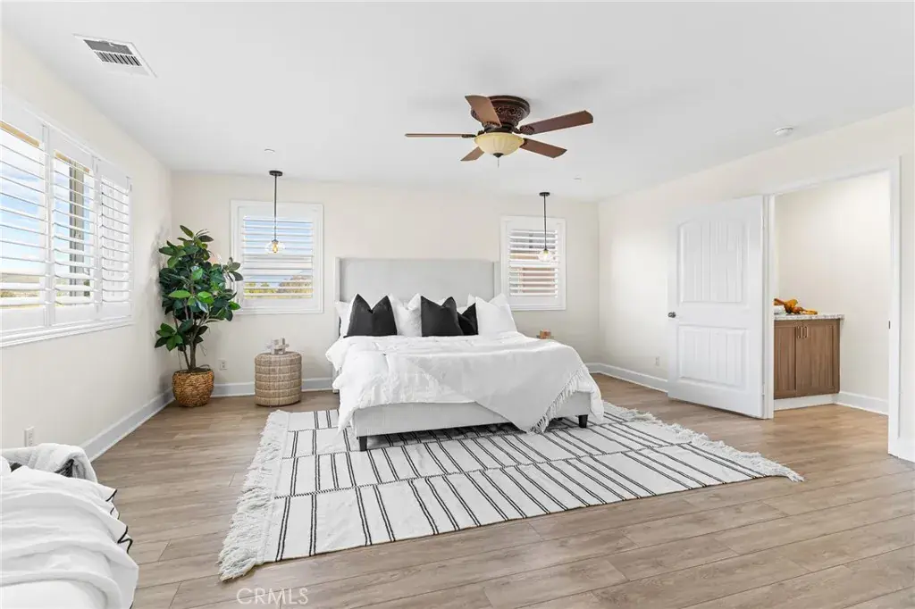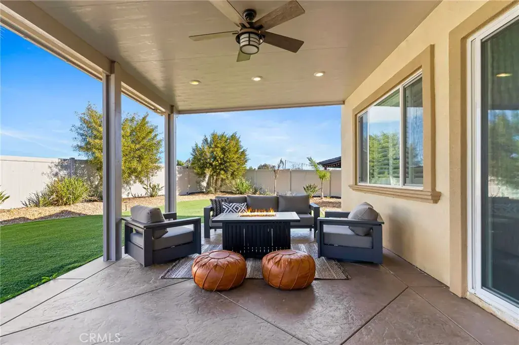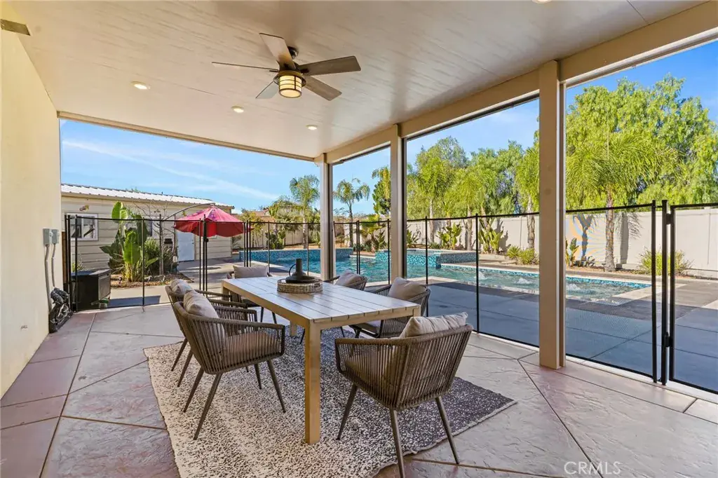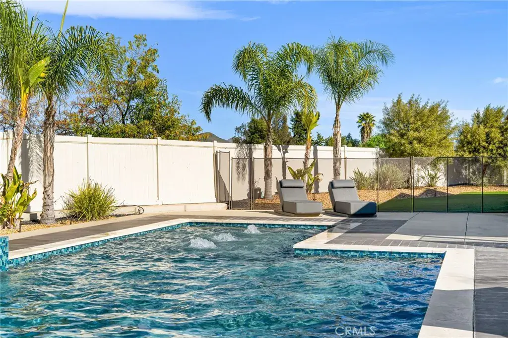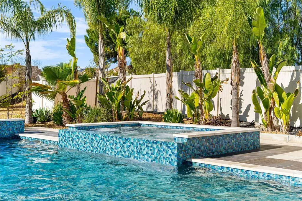 Welcome to 30381 Canyon Point Circle, a beautifully updated residence located in the prestigious Boulder Estates community of Menifee, offering no HOA, generous lot features, and a true indoor-outdoor lifestyle. This 5-bedroom, 4.5-bath, 3,653 sq ft home impresses from the moment you enter with soaring ceilings, an open balcony overlook, and a tastefully designed staircase that sets the tone for the rest of the home. The interior has been freshly repainted, elevating the already bright, move-in-ready feel throughout. The main level features a full downstairs bedroom suite with a walk-in closet and private en-suite bathroom, ideal for guests or multigenerational living, along with a convenient powder room. The heart of the home is the expansive open-concept great room, seamlessly integrating the living room, dining area, and kitchen. Built-ins anchor the living space, while dual sliding glass doors open to the backyard and create effortless flow for entertaining. The chef’s kitchen is thoughtfully designed with a large center island and bar seating, stainless steel built-in appliances including a cabinet-flush refrigerator, six-burner gas range, abundant cabinetry, recessed and pendant lighting, and a large walk-in pantry that provides exceptional storage. Upstairs, a spacious flex space functions perfectly as a family room, lounge, or media area. The primary suite is a true retreat, filled with natural light and featuring dual vanities, a Roman soaking tub, a separate walk-in shower, water closet, and an expansive walk-in closet with remarkable storage capacity. Three additional bedrooms complete the upper level, each with direct bathroom access, including two secondary bedrooms connected by a Jack-and-Jill bath. A full upstairs laundry room with sink, storage cabinetry, and open shelving adds everyday convenience. The backyard is a true private oasis, highlighted by a resort-style pool and spa with Pebble Tech finish, lighting, water, and wave features. An additional detached shed currently used as a workspace offers flexibility as a home gym, studio, or man cave. Additional highlights include solar, extensive built-in storage throughout, a three-car tandem garage, and RV parking. Located in a quiet, well-established enclave with easy access to shopping, dining, parks, and commuter routes, this home offers space, flexibility, and the idyllic Southern California lifestyle without compromise.