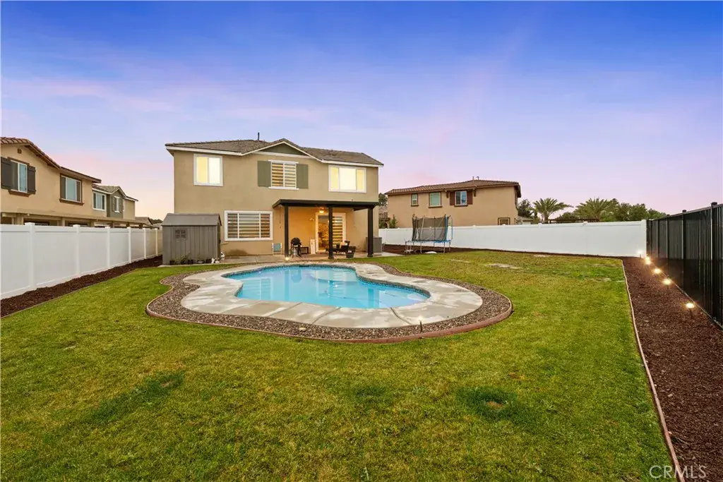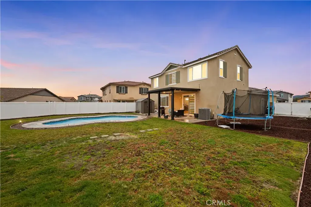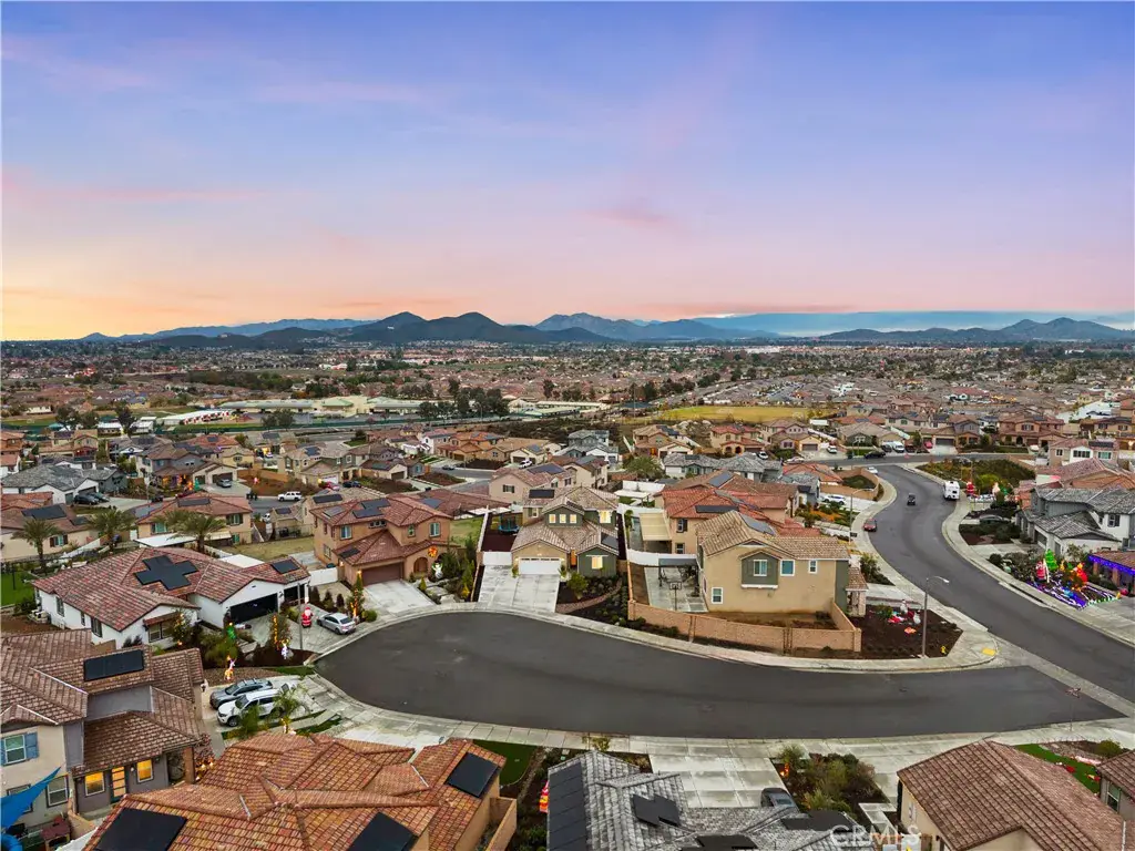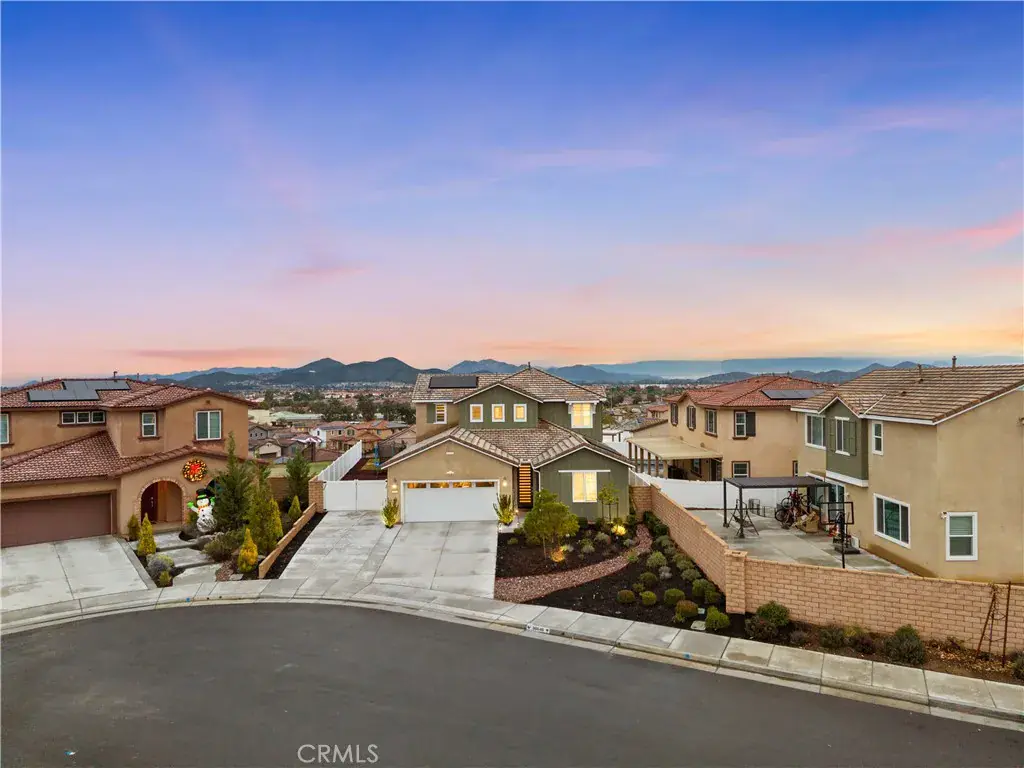 Welcome to this beautiful Menifee cul-de-sac home that has it all, sitting on an elevated lot with panoramic views, a huge backyard, PAID SOLAR, RV Parking, and a private pool!!! Pulling into the driveway you will immediately appreciate beautiful curb appeal & easily maintained front landscaping. Walking the front door you are greeted with tall ceilings and an incredible layout with the main level offering a downstairs ensuite with a full bath, perfect for multi-generational families or a home office. The first level also offers a large bonus room convenient to lounge in or to work in as an at-home office! As you make your way to the kitchen you will find tons of cabinet and countertop space with a huge kitchen island that opens up to the living room making it perfect for family gatherings. Upstairs you will find the two additional guest bedrooms sharing a large guest bath. The master suite offers plenty of space, a walk in closet and a separate soaking tub & walk in shower. Moving to the backyard you will find your own private pool along with the portrait worthy views of the city, the mountains, and ability to drink your coffee while enjoying the warming sunrise from your own patio.