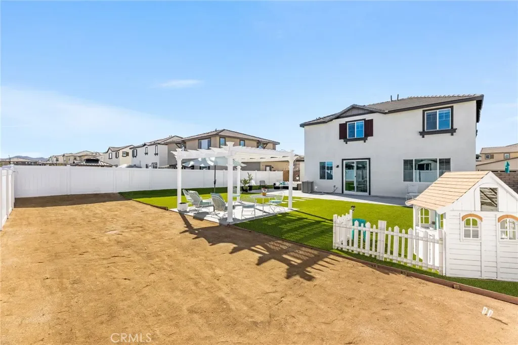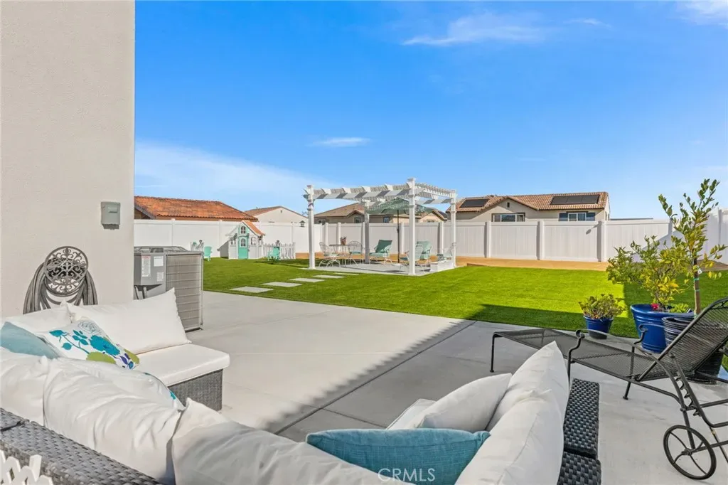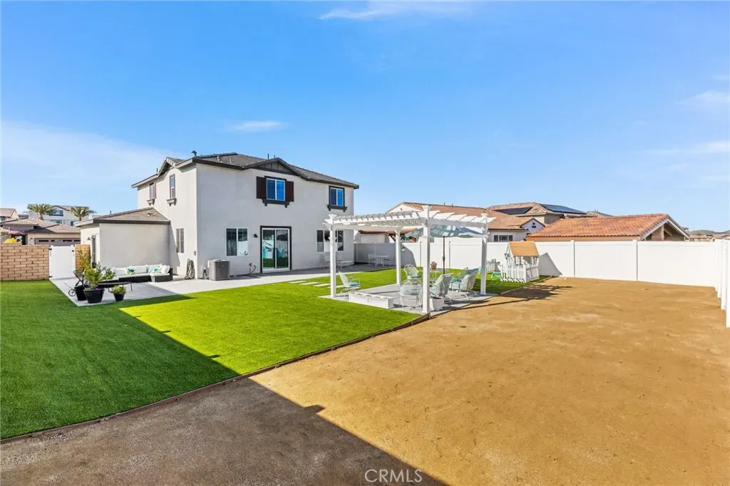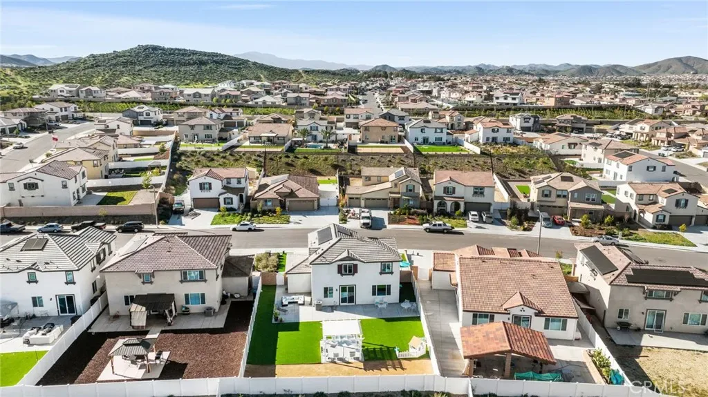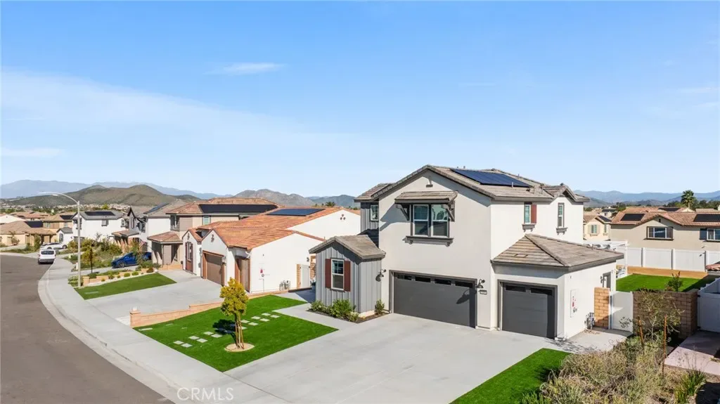Welcome to this Desirable Quartz Ranch Spectacular Light Bright 1+year New Modern Farmhouse in the highly sought City of Menifee. Built in Nov 2024 this contemporary home offers 1824sq ft of thoughtfully designed living space. Located on a gorgeous oversized 7784 sq ft FLAT LOT, Fully Landscaped, White Vinyl fenced yard. Bask under the gorgeous white vinyl 12 x 12 Pergola on a 14×14 concrete island. All the yard is done in TURF, DG, and drought resistant plants. A gorgeous, beautiful EPOXY 3 CAR GARAGE, with OVERSIZED DRIVEWAY fitting up to 6 Cars. An additional beautiful Front Courtyard to enjoy the Sunsets and Breezes. LOW $56/mo LEASED SOLAR panels to be transferred to new owner Making Electric bill almost Nonexistent!