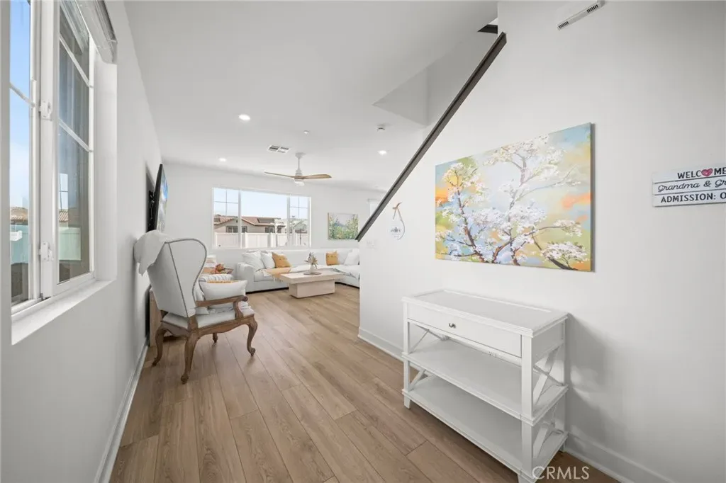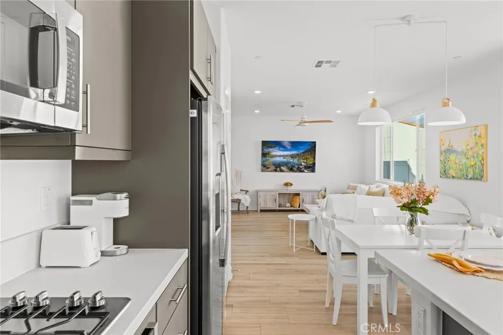 Step inside to an inviting Open-Concept floor plan filled with natural light, where the spacious great room flows seamlessly into the dining area and chef-inspired kitchen. The kitchen is the heart of the home, complete with center island, quartz countertops, stainless steel large sink and appliances, abundant cabinetry, pantry, designer ceiling fan and a designer lamp, perfect for everyday living and entertaining. All downstairs is done in Luxury VINYL PLANK FLOORS, And RECESSED LIGHTING throughout the home!