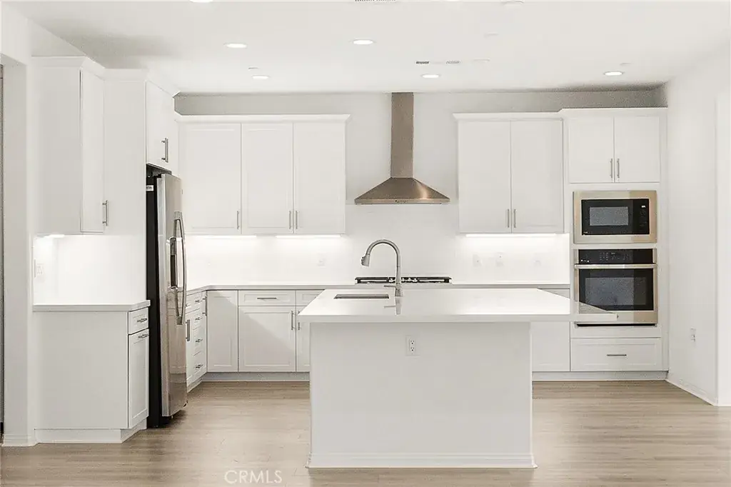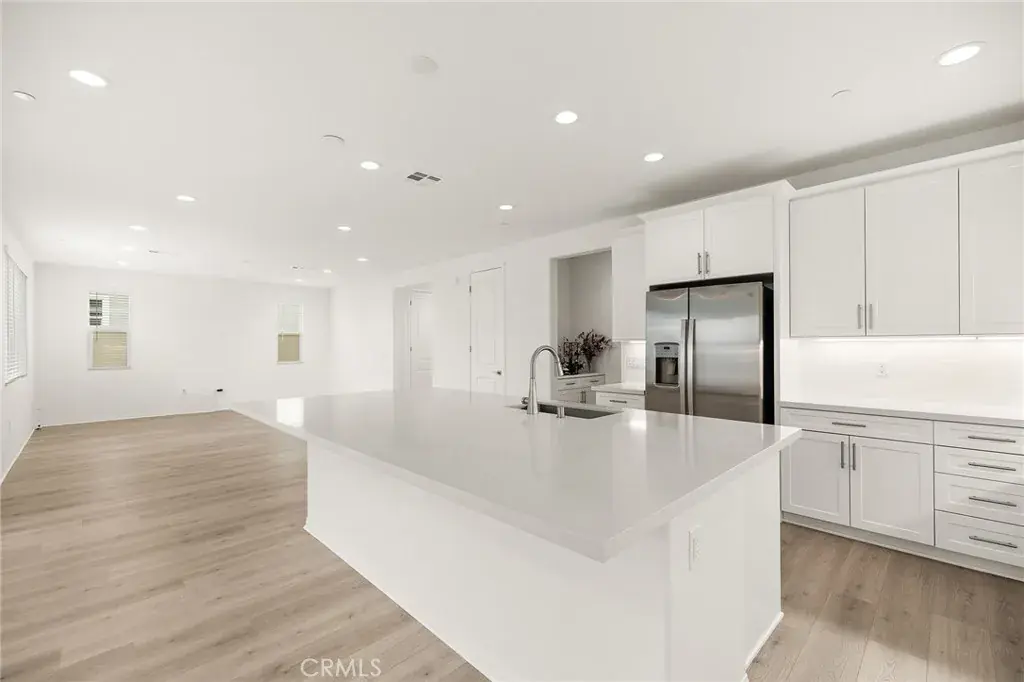 The heart of the home is the stunning gourmet kitchen, featuring white cabinetry, elegant Miami Vena quartz countertops, a huge kitchen island, stainless steel GE appliances and a walk-in pantry—ideal for entertaining and everyday living. Enjoy seamless flow with upgraded wood laminate flooring throughout, tile floors in bathrooms and laundry, and tall 8-foot doors that enhance the spacious feel of every room.