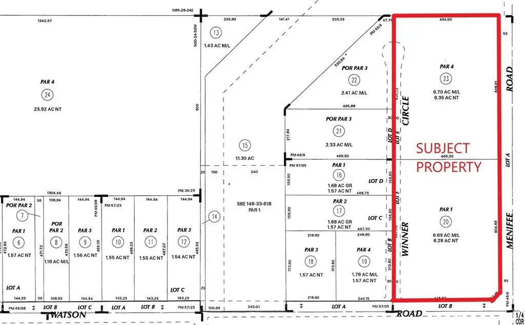 Excellent residential development opportunity in the City of Menifee. This land is located on Menifee Road cross Watson Road. RR1 zoning flat and side by side double lots in a rapid developing neighborhood close Freeway 215 and Highway 74. Menifee is one of the fastest growing cities in Southern California, it is in Riverside County. The lots are surrounding by single family houses, newer tract homes, Heritage High School and Romoland Library just a few minutes away. APN 329-320-020 (6.69 acres) and 329-320-023 (6.7 acres) total +- 13.39 acres, the price is for both lots and need to be sold together. According to current City land use category, RR1 zoning may allow one detached residence of 1 acre and may allow small scale home-based business operations; buyer to verify relevant information and desired future use with City. The land does not have address yet. Marketing flyer attached.