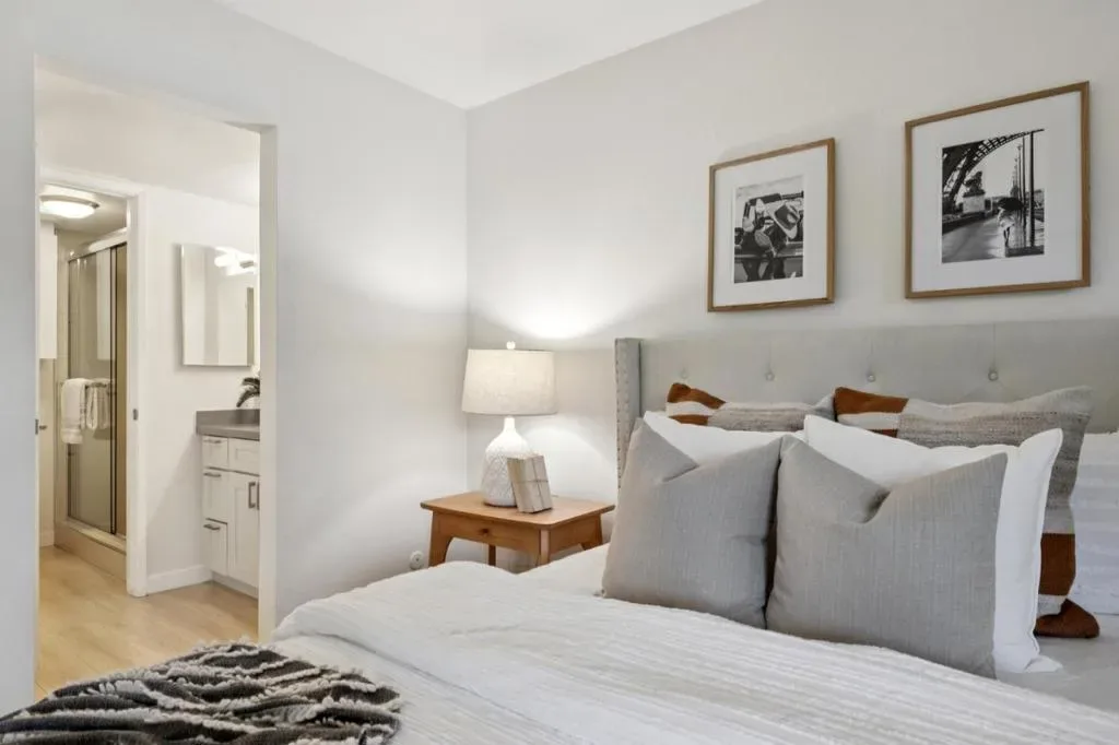 Beautifully remodeled single-level condo on the third floor with elevator access, ideally located close to downtown Menlo Park. Bright and stylish living and dining area with crown molding, wood-like floors, and abundant natural light. Spacious updated kitchen with quartz countertops, contemporary cabinetry, and top-of-the-line appliances, including a newly installed Bosch CrystalDry dishwasher. Both bedrooms are generously sized, including a private primary suite with en-suite bath and cozy outdoor patio. Updated bathrooms feature tiled showers, modern cabinetry, quartz counters, and stylish fixtures. Dual-pane windows throughout. Additional highlights include two assigned carport parking spaces, a private storage room, EV charging capabilities, and HOA coverage for water and garbage. Close to Encinal Elementary, Menlo College, Caltrain, Meta, downtown Menlo Park, and the new Springline development with popular dining, coffee, shopping, and Sunday farmers market.