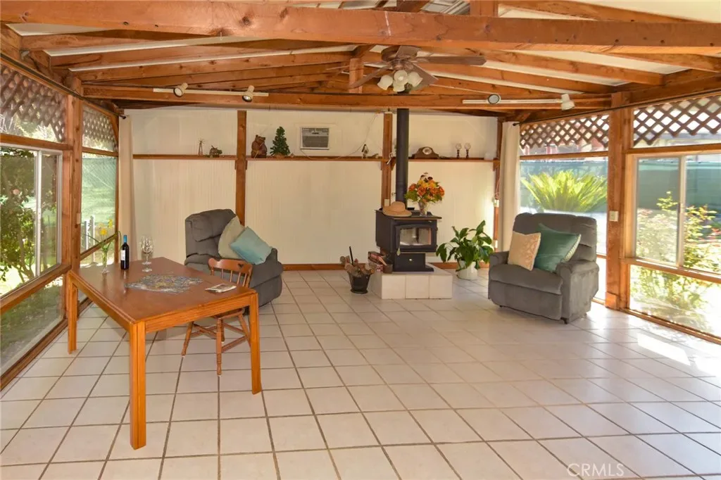The main residence features three bedrooms and one and three-quarter bathrooms with a kitchen and living area centered around a fireplace. Two front bedrooms and an enclosed patio room were added with permits, expanding the functional living space of the home. The enclosed patio room includes a heating cook stove that creates an additional gathering space and secondary heat source.