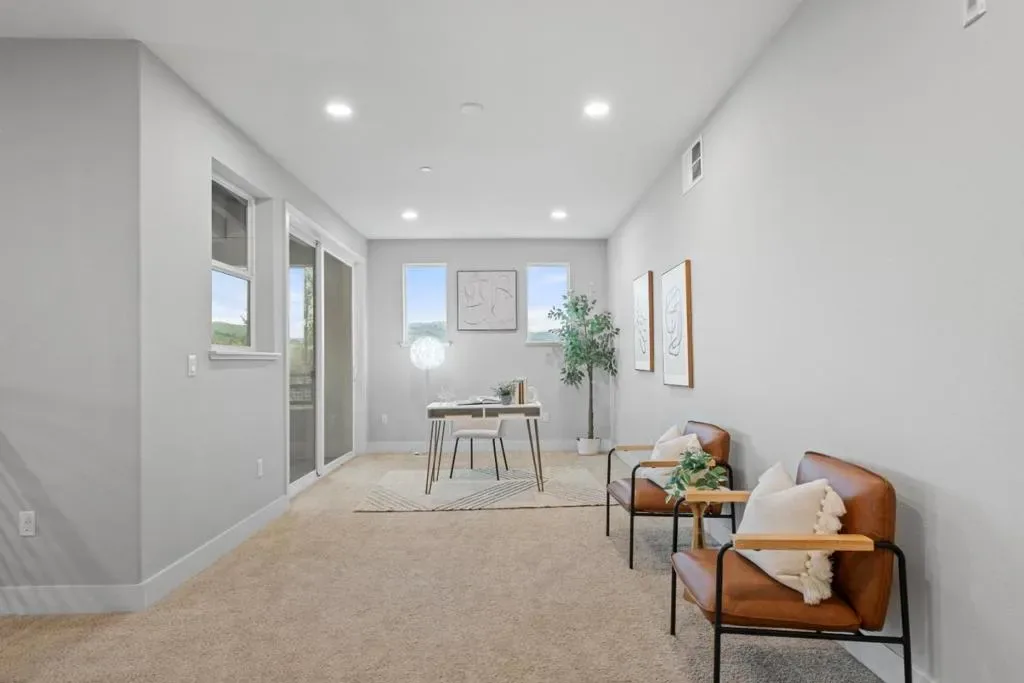 *Dramatic high ceilings, mountain views, top-rated schools, and a corner-unit setting define this exceptional 7-year-new home with bright, open living. Natural light fills the living, dining, and kitchen areas, which flow seamlessly to a private patio.*The kitchen features a large center island, ample cabinetry, sleek backsplash, premium stainless steel appliances, and a Thermador stove. A rare ensuite bedroom is located on the main level. Upstairs, a spacious family room or loft opens to a covered patio. *The primary suite offers mountain views, dual sinks, a walk-in closet, and extra storage. Upgrades include recessed lighting, multi-zone HVAC, and in-home laundry. *A 2-car garage includes storage and an EV charger. Owned solar (8 panels) with battery backup installed ~Dec 2025. Prime location, walk to Great Mall and Trader Joes; minutes to Costco, 99 Ranch, and H Mart. Easy access to BART, VTA, and Highways 880/680. Top-rated schools: Mabel Mattos (10/10), Rancho Milpitas (9/10), Milpitas High (9/10) per GreatSchools. Near major employers like NVIDIA, Google, Apple, Supermicro, and Cisco