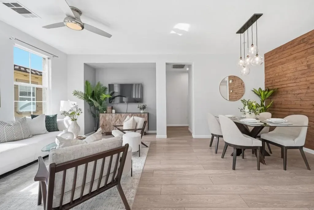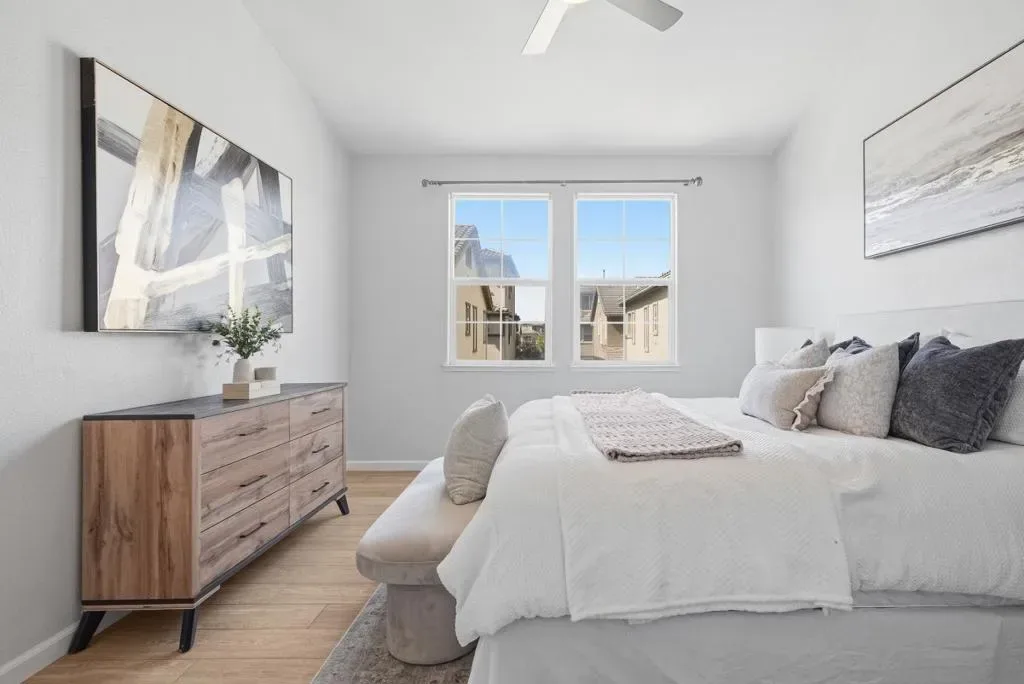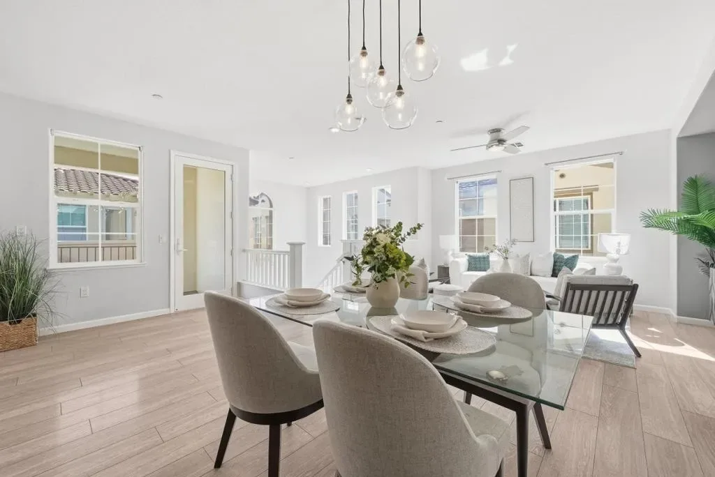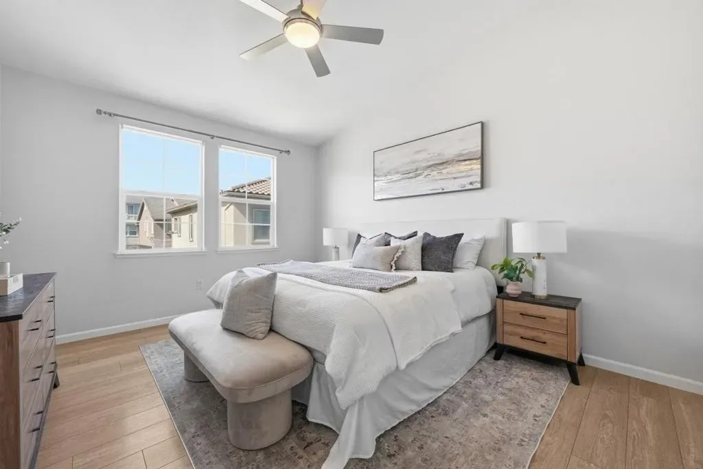 Welcome to this beautiful, light-filled end-unit townhome with 2 bedrooms, 2 bathrooms, plus a bonus room in the gated Terra Serena community of Milpitas. The main level features a spacious living room with large windows and a dining area highlighted by a stylish accent wall and elegant pendant light, with a door leading to a private balcony. The modern U-shaped kitchen offers quartz countertops and backsplash, stainless steel appliances, and ample white cabinetry. The primary suite includes a spacious bedroom, large walk-in closet, and an en-suite bathroom with double vanity and shower over tub. There is also a second bedroom and a hallway bathroom with shower over tub, along with a convenient laundry area with washer and dryer. The lower level features a bonus room ideal for an office or hobby space, plus a two-car garage. Enjoy community amenities and nearby restaurants and groceries, including Ranch 99, Walmart, and Costco, with Great Mall shopping just 5 minutes away. Easy access to Hwy 237, 880, 680, and Montague Expy, near Milpitas BART station, and a short commute to major tech companies. Top-rated Milpitas schools. Do not miss this great opportunity!